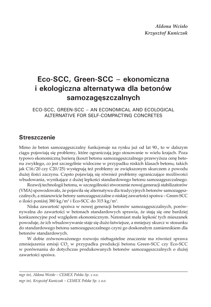 Aldona Wcisło Krzysztof Kuniczuk Eco-SCC, Green-SCC – ekonomiczna i ekologiczna alternatywa dla betonów samozagęszczalnych Eco-SCC, Green-SCC – an economical and ecological alternative for self-compacting concretes Streszczenie Mimo że beton samozagęszczalny funkcjonuje na rynku już od lat 90., to w dalszym ciągu pojawiają się problemy, które ograniczają jego stosowanie w wielu krajach. Poza typowo ekonomiczną barierą (koszt betonu samozagęszczalnego przewyższa cenę betonu zwykłego, co jest szczególnie widoczne w przypadku niskich klasach betonu, takich jak C16/20 czy C20/25) występują też problemy ze zwiększonym skurczem z powodu dużej ilości zaczynu. Często pojawiają się również problemy ograniczające możliwości wbudowania, wynikające z dużej lepkości standardowego betonu samozagęszczalnego. Rozwój technologii betonu, w szczególności stworzenie nowej generacji stabilizatorów (VMA) spowodowało, że pojawiła się alternatywa dla tradycyjnych betonów samozagęszczalnych, a mianowicie betony samozagęszczalne o niskiej zawartości spoiwa – Green-SCC o ilości poniżej 380 kg/m3 i Eco-SCC do 315 kg/m3. Niska zawartość spoiwa w nowej generacji betonów samozagęszczalnych, porównywalna do zawartości w betonach standardowych sprawia, że stają się one bardziej konkurencyjne pod względem ekonomicznym. Natomiast mała lepkość tych mieszanek powoduje, że ich wbudowywanie staje się dużo łatwiejsze, a mniejszy skurcz w stosunku do standardowego betonu samozagęszczalnego czyni go doskonałym zamiennikiem dla betonów standardowych. W dobie zrównoważonego rozwoju niebagatelne znaczenie ma również sprawa zmniejszenia emisji CO2 w przypadku produkcji betonu Green-SCC czy Eco-SCC w porównaniu do dotychczas produkowanych betonów samozagęszczalnych o dużej zawartości spoiwa. mgr inż. Aldona Wcisło – CEMEX Polska Sp. z o.o. mgr inż. Krzysztof Kuniczuk – CEMEX Polska Sp. z o.o. Referat jest próbą przedstawienia praktycznych uwag wynikających z wdrażania nowej generacji betonów samozagęszczalnych, problemów technologicznych powstających w trakcie ich produkcji oraz zagrożeń, jakie niesie ze sobą stosowanie stabilizatorów na podstawie dotychczas zrealizowanych dostaw na terenie Polski. Abstract Despite the fact that the self-consolidating concrete is present on the market since the 1990s, it still facing a number of problems that limit its use in many countries. Apart from a typical economic barrier (the standard self-consolidating concrete is much more expensive than the standard concrete, in particular for lower classes of concrete, e.g. C16/20 or C20/25), there are some problems connected with a higher contraction rate resulting from a volume of grout. There are also frequent problems with a high viscosity of the standard self-consolidating concrete, limiting its areas of use. Development of the concrete technology and, in particular, a new generation of stabilisers (VMA) produced an alternative to the traditional self-consolidating concretes, i.e. the self-consolidating concretes with a low binder content - Green-SCC with the binder content below 380 kg/m3 and Eco-SCC with the binder content up to 315 kg/m3. The low binder content in the new generation of the self-consolidating concretes, comparable to the binder content of standard concretes, makes them more economically competitive. The low viscosity of these mixtures result in much easier application, and the contraction rate lower in comparison to the standard self-consolidating concrete, makes it an ideal substitute of standard concretes. In the sustainable development era, CO2 emissions are also of a high importance. Production of Green-SCC or Eco-SCC concretes result in lower CO2 emissions than production of other self-consolidating concretes with high binder contents. This paper attempts to present practical conclusions, suggestions resulting from implementation of the new generation of the self-consolidating concretes, engineering problems of production and dangers resulting from application of stabilizers based on deliveries that has been done so far in Poland.