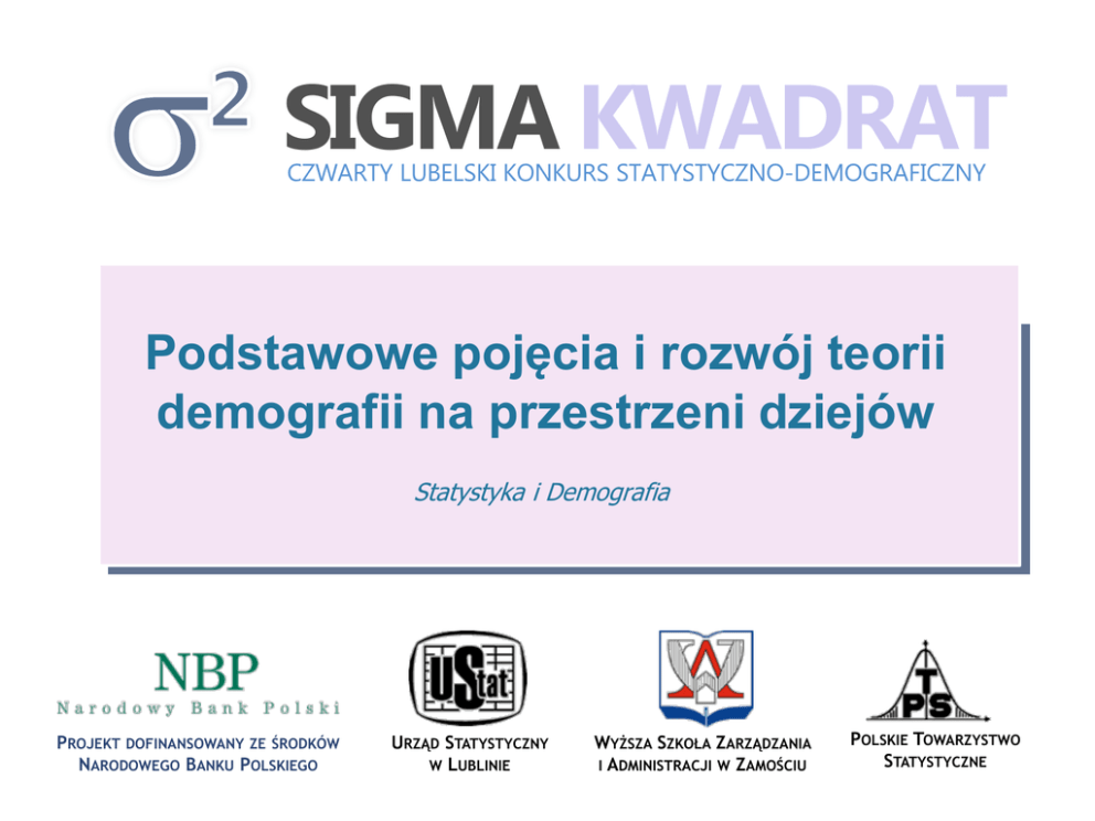 SIGMA KWADRAT CZWARTY LUBELSKI KONKURS STATYSTYCZNO-DEMOGRAFICZNY Podstawowe pojęcia i rozwój teorii demografii na przestrzeni dziejów Statystyka i Demografia PROJEKT DOFINANSOWANY ZE ŚRODKÓW NARODOWEGO BANKU POLSKIEGO URZĄD STATYSTYCZNY W LUBLINIE WYŻSZA SZKOŁA ZARZĄDZANIA I ADMINISTRACJI W ZAMOŚCIU POLSKIE TOWARZYSTWO STATYSTYCZNE Podstawowe pojęcia Demografia – nauka o prawidłowościach rozwoju ludności w konkretnych warunkach gospodarczych i społecznych badanego terytorium. demos - lud, grapheia – opis 1. Demografia ogólna 1. Demometria (demografia matematyczna) 2. Demografia opisowa 2. Demografia historyczna 3. Demografia potencjalna Podstawowe pojęcia Doktryny demograficzne - kierunek zajmujący się formułowaniem teorii rozwoju ludności, Demografia społeczna - kierunek zajmujący się społecznym uwarunkowaniem i konsekwencjami procesów demograficznych, Demografia ekonomiczna - kierunek zajmujący się ekonomicznym uwarunkowaniem i konsekwencjami procesów demograficznych Podstawowe pojęcia Demografia powiązana jest z: Statystyką Ekonomią Socjologią Psychologią Medycyną Podstawowe pojęcia Podstawową jednostką badanych zbiorowości w demografii jest pojedynczy człowiek, rodzina lub gospodarstwo domowe. Demografia nie zajmuje się jednak analizą zachowania poszczególnych jednostek, lecz analizą prawidłowości obserwowanych w procesach zachodzących w całej, dostatecznie licznej z punktu widzenia statystyki, zbiorowości lub podzbiorowości. Podstawowe pojęcia Struktura ludności według płci, wieku, stanu cywilnego, cech społeczno-zawodowych, wykształcenia i charakteru miejsca zamieszkania stanowi tło podstawowych procesów demograficznych. Zmiany w stanie i strukturze ludności danego obszaru powstają na skutek ruchu naturalnego i wędrówkowego. Podstawowe pojęcia Ruch naturalny - zmiany w stanie cywilnym ludności (wstępowanie w związki małżeńskie, rozwodzenie się czy też przeprowadzanie separacji) oraz zmiany w stanie liczebnym ludności na skutek urodzeń i zgonów. Ruch wędrówkowy (migracyjny) - ruch ludności wynikający ze zmian miejsca zamieszkania, np. ze wsi do miasta, z miasta do miasta, oraz imigrację i repatriację, czyli przyjazdy na stałe do danego obszaru, i emigrację, czyli wyjazdy na stałe z danego obszaru. Podstawowe pojęcia Statystyka ludności, dostarcza danych liczbowych niezbędnych przy badaniu prawidłowości rozwoju ludności. Źródła informacji demograficznej: 1. Powszechne spisy ludności 2. Rejestracja bieżąca urodzeń, zgonów, zmian stanu cywilnego i miejsca zamieszkania ludności 3. Specjalne badania ankietowe przeprowadzane wśród odpowiednio wylosowanych respondentów. Rozwój teorii ludnościowych na przestrzeni dziejów Konfucjusz (551 – 479 p.n.e.) – koncepcja optimum ludności zatrudnionej w rolnictwie. Poszukiwał idealnej proporcji pomiędzy liczbą ludności a wielkością obszaru i formułował w stosunku do władzy postulaty przenoszenia ludności z obszarów przeludnionych na niedoludnione. Umieralność wzrasta wraz z niewystarczającą ilością żywności. Przedwczesne małżeństwa powodują wyższą umieralność niemowląt, wojny zmniejszają przyrost liczebny ludności, a wysokie koszty ceremonii zaślubin zmniejszają częstotliwość zawierania związków małżeńskich. Rozwój teorii ludnościowych na przestrzeni dziejów Platon (427 – 374 p.n.e.) oraz Arystoteles (384 – 322 p.n.e.) – formułowali politykę i zasady postępowania w celu osiągnięcia „optimum” ludności w warunkach ówczesnego państwa niewolniczego. „Optimum” miało zapewnić najlepsze wykorzystanie ludzkich możliwości z punktu widzenia bezpieczeństwa państwa i klasy rządzącej. Arystoteles – państwo powinno być tak ludne aby możliwe było swobodne rozkoszowanie się czasem wolnym. Zbyt dużo ludzi to bieda – aborcja, porzucanie dzieci. Rozwój teorii ludnościowych na przestrzeni dziejów Imperium rzymskie – szczególne przywileje rodzinom wielodzietnym i dyskryminowanie bezdzietnych. Chodziło o szybki wzrost liczby ludności rzymskiej. Rozwój teorii ludnościowych na przestrzeni dziejów Chrześcijańskie średniowiecze – Pisarze chrześcijańscy generalnie nastawieni byli propopulacyjnie, kierowali się przy tym względami moralnymi i etycznymi. Potępiali rozwody, poligamię, aborcję, porzucanie dzieci, zalecali powstrzymywanie się od powtórnych małżeństw, gloryfikowali dziewictwo i celibat. Muzułmańskie średniowiecze – Pisarze muzułmańscy popierali szybki wzrost liczby ludności. Ibn Chaldun (1322 – 1406) twierdził, że duża gęstość zaludnienia umożliwia lepszy podział pracy, efektywniejsze wykorzystanie zasobów, większe militarne i polityczne bezpieczeństwo a to wszystko z kolei prowadzi do wzrostu liczby urodzeń i spadku śmiertelności oraz zapewnia w sumie wyższy poziom życia. Rozwój teorii ludnościowych na przestrzeni dziejów Merkantylizm (XVI – XVII wiek) nie posiadał zdefiniowanej teorii ludnościowej. Jednakże korzyści z dużej i rosnącej liczby ludności były w pracach podnoszone, propagowana była również polityka popierająca zawieranie związków małżeńskich, duże rodziny, poprawę zdrowia publicznego, kontrolowaną emigrację i imigrację. G. Bolero w wydanej w 1558 r. pracy The Reason of State and the Greatness of Cities: „ludność zdąża do maksymalnego wykorzystania potencjału rozrodczego, ale środki zaspokojenia jej potrzeb życiowych są ograniczone i tym samym wyznaczają granicę liczebnego rozwoju ludności.” Rozwój teorii ludnościowych na przestrzeni dziejów Klasyczna ekonomia polityczna J. Graunt (1620-1674), zwany ojcem statystyki i demografii, prowadził badania ludnościowe, szczególnie ludności Londynu. Jako pierwszy ustalił wiele prawidłowości demograficznych, które pozwoliły mu zbudować tablice wymieralności, dziś zwane tablicami trwania życia. Rozwój teorii lu