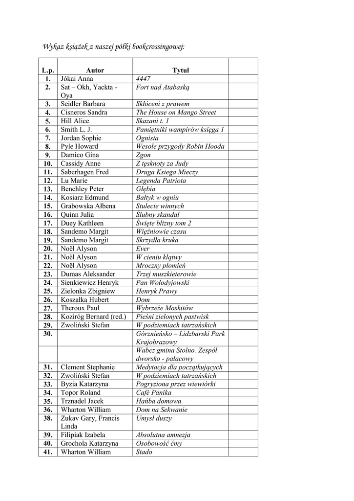 Wykaz książek z naszej półki bookcrossingowej: L.p. Autor 1. Jókai Anna 2. Sat – Okh, Yackta Oya 3. Seidler Barbara 4. Cisneros Sandra 5. Hill Alice 6. Smith L. J. 7. Jordan Sophie 8. Pyle Howard 9. Damico Gina 10. Cassidy Anne 11. Saberhagen Fred 12. Lu Marie 13. Benchley Peter 14. Kosiarz Edmund 15. Grabowska Ałbena 16. Quinn Julia 17. Duey Kathleen 18. Sandemo Margit 19. Sandemo Margit 20. Noël Alyson 21. Noël Alyson 22. Noël Alyson 23. Dumas Aleksander 24. Sienkiewicz Henryk 25. Zielonka Zbigniew 26. Koszałka Hubert 27. Theroux Paul 28. Koziróg Bernard (red.) 29. Zwoliński Stefan 30. 31. 32. 33. 34. 35. 36. 38. 39. 40. 41. Clement Stephanie Zwoliński Stefan Byzia Katarzyna Topor Roland Trznadel Jacek Wharton William Zukav Gary, Francis Linda Filipiak Izabela Grochola Katarzyna Wharton William Tytuł 4447 Fort nad Atabaską Skłóceni z prawem The House on Mango Street Skazani t. 1 Pamiętniki wampirów księga 1 Ognista Wesołe przygody Robin Hooda Zgon Z tęsknoty za Judy Druga Ksiega Mieczy Legenda Patriota Głębia Bałtyk w ogniu Stulecie winnych Ślubny skandal Święte blizny tom 2 Więźniowie czasu Skrzydła kruka Ever W cieniu klątwy Mroczny płomień Trzej muszkieterowie Pan Wołodyjowski Henryk Prawy Dom Wybrzeże Moskitów Pieśni zielonych pastwisk W podziemiach tatrzańskich Górznieńsko – Lidzbarski Park Krajobrazowy Wabcz gmina Stolno. Zespół dworsko - pałacowy Medytacja dla początkujących W podziemiach tatrzańskich Pogryziona przez wiewiórki Café Panika Hańba domowa Dom na Sekwanie Umysł duszy Absolutna amnezja Osobowość ćmy Stado 42. 43. 44. 45. 46. 47. 48. 49. 50. 51. 52. 53. 54. 55. 56. 57. 58. 59. 60. 61. 62. 63. 64. 65. 66. 67. 68. 69. 70. 71. 72. 73. 74. 75. 76. 77. 78. 79. 80. 81. Janda Krystyna Biedzki Tadeusz Ashworth Sue Murray Paul De Mello Anthony Hemingway Ernest Bédier Joseph Alcott Louisa M. Dabit Eugéne Nałkowska Zofia Iwaszkiewicz Jarosław Osho Lesmian Bolesław Norwid Cyprian Cast P. C., Cast Kristin Cast P. C., Cast Kristin Cast P. C., Cast Kristin Cast P. C., Cast Kristin Waller Leslie Białołęcka Ewa Graham Heather Long Julie Anne Ignatius David Obermeier Siegfried Moccia Federico Olsen Mary – Kate, Olsen Ashley Gregory Philippa Fredro Aleksander Galsworthy John Harrison Kim Fisher Catherine Pawłowski Krzysztof Meyer Stephenie Shortridge Jennie Sandemo Margit Bądkowski Lech Pawlik Leon Szymeczko Kazimierz Jeleński Szczepan Moja droga B, Sen pod baobabem Vegetarian Barbecues Skippy Dies Wezwanie do miłości Komu bije dzwon Dzieje Tristana i Izoldy Little Women Hôtel du Nord Rówieśnice Wiersze tom II Księga ego Poezje Pisma wybrane. Poematy Kuszona Przeznaczona Przebudzona Osaczona Cudowna Faith Kamień na szczycie Noc, morze i gwiazdy Sekret uwodzenia Niewinni szpiedzy Safona Amore 14 Jak dwie krople wody Krucjata Wałęsa Pan Jowialski The Forsyte Saga Umarli czasu nie liczą Tajemnice Wyroczni Na szczęście można mieć pecha Zaćmienie Kiedy zapomnisz Otchłań Powtórka Ankara Fałszerze w sieci Śladami Pitagorasa