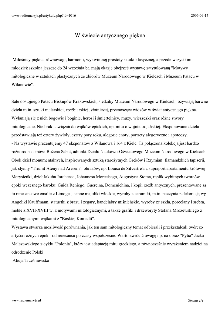 www.radiomaryja.pl/artykuly.php?id=1016 2006-09-15 W świecie antycznego piękna Miłośnicy piękna, równowagi, harmonii, wykwintnej prostoty sztuki klasycznej, a przede wszystkim młodzież szkolna jeszcze do 24 września br. mają okazję obejrzeć wystawę zatytułowaną "Motywy mitologiczne w sztukach plastycznych ze zbiorów Muzeum Narodowego w Kielcach i Muzeum Pałacu w Wilanowie". Sale dostojnego Pałacu Biskupów Krakowskich, siedziby Muzeum Narodowego w Kielcach, ożywiają barwne dzieła m.in. sztuki malarskiej, rzeźbiarskiej, złotniczej, przenoszące widzów w świat antycznego piękna. Wyłaniają się z nich bogowie i boginie, herosi i śmiertelnicy, muzy, wieszczki oraz różne stwory mitologiczne. Nie brak nawiązań do wątków epickich, np. mitu o wojnie trojańskiej. Eksponowane dzieła przedstawiają też cztery żywioły, cztery pory roku, alegorie cnoty, portrety alegoryczne i apoteozy. - Na wystawie prezentujemy 47 eksponatów z Wilanowa i 164 z Kielc. Ta połączona kolekcja jest bardzo różnorodna - mówi Bożena Sabat, adiunkt Działu Naukowo-Oświatowego Muzeum Narodowego w Kielcach. Obok dzieł monumentalnych, inspirowanych sztuką starożytnych Greków i Rzymian: flamandzkich tapiserii, jak słynny "Triumf Ateny nad Aresem", obrazów, np. Louisa de Silvestre'a z supraport apartamentu królowej Marysieńki, dzieł Jakuba Jordaensa, Johannesa Moreelsego, Augustyna Stoma, replik wybitnych twórców epoki wczesnego baroku: Guida Reniego, Guercina, Domenichina, i kopii rzeźb antycznych, prezentowane są tu renesansowe emalie z Limoges, cenne majoliki włoskie, wyroby z ceramiki, m.in. naczynia z dekoracją wg Angeliki Kauffmann, statuetki z brązu i zegary, kandelabry miśnieńskie, wyroby ze szkła, porcelany i srebra, meble z XVII-XVIII w. z motywami mitologicznymi, a także grafiki i drzeworyty Stefana Mrożewskiego z mitologicznymi wątkami z "Boskiej Komedii". Wystawa stwarza możliwość porównania, jak ten sam mitologiczny temat odbierali i przekształcali twórczo artyści różnych epok - od renesansu po czasy współczesne. Warto zwrócić uwagę np. na obraz "Pytia" Jacka Malczewskiego z cyklu "Polonia", który jest adaptacją mitu greckiego, a równocześnie wyrażeniem nadziei na odrodzenie Polski. Alicja Trześniowska www.radiomaryja.pl Strona 1/1