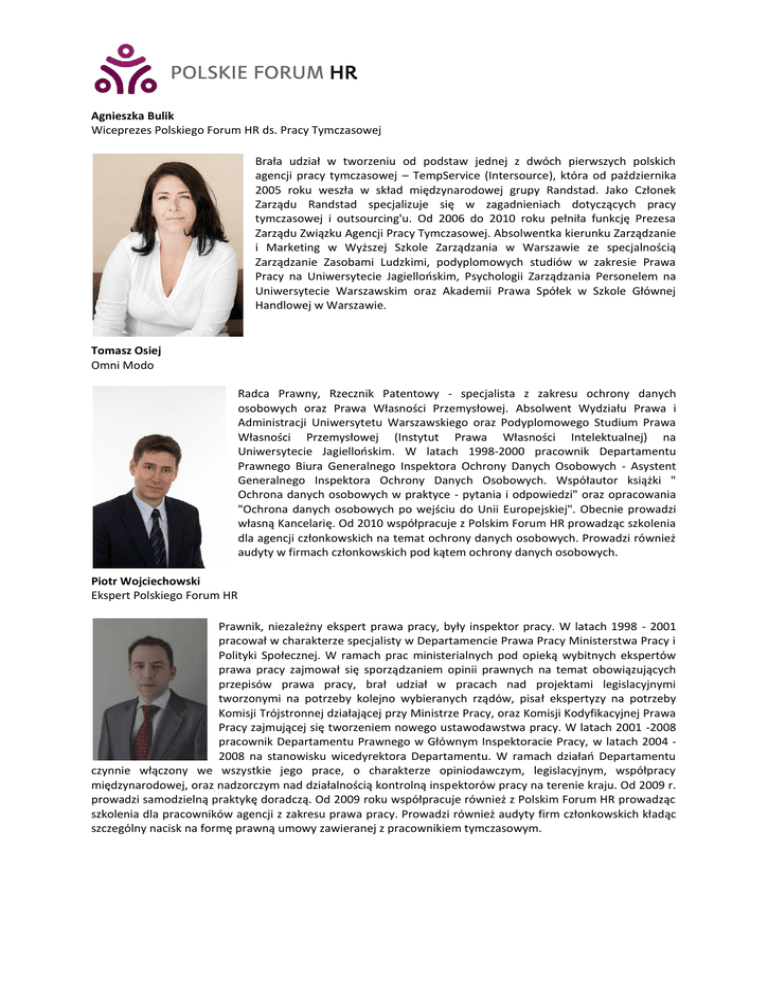 Agnieszka Bulik Wiceprezes Polskiego Forum HR ds. Pracy Tymczasowej Brała udział w tworzeniu od podstaw jednej z dwóch pierwszych polskich agencji pracy tymczasowej – TempService (Intersource), która od października 2005 roku weszła w skład międzynarodowej grupy Randstad. Jako Członek Zarządu Randstad specjalizuje się w zagadnieniach dotyczących pracy tymczasowej i outsourcing'u. Od 2006 do 2010 roku pełniła funkcję Prezesa Zarządu Związku Agencji Pracy Tymczasowej. Absolwentka kierunku Zarządzanie i Marketing w Wyższej Szkole Zarządzania w Warszawie ze specjalnością Zarządzanie Zasobami Ludzkimi, podyplomowych studiów w zakresie Prawa Pracy na Uniwersytecie Jagiellooskim, Psychologii Zarządzania Personelem na Uniwersytecie Warszawskim oraz Akademii Prawa Spółek w Szkole Głównej Handlowej w Warszawie. Tomasz Osiej Omni Modo Radca Prawny, Rzecznik Patentowy - specjalista z zakresu ochrony danych osobowych oraz Prawa Własności Przemysłowej. Absolwent Wydziału Prawa i Administracji Uniwersytetu Warszawskiego oraz Podyplomowego Studium Prawa Własności Przemysłowej (Instytut Prawa Własności Intelektualnej) na Uniwersytecie Jagiellooskim. W latach 1998-2000 pracownik Departamentu Prawnego Biura Generalnego Inspektora Ochrony Danych Osobowych - Asystent Generalnego Inspektora Ochrony Danych Osobowych. Współautor książki " Ochrona danych osobowych w praktyce - pytania i odpowiedzi" oraz opracowania "Ochrona danych osobowych po wejściu do Unii Europejskiej". Obecnie prowadzi własną Kancelarię. Od 2010 współpracuje z Polskim Forum HR prowadząc szkolenia dla agencji członkowskich na temat ochrony danych osobowych. Prowadzi również audyty w firmach członkowskich pod kątem ochrony danych osobowych. Piotr Wojciechowski Ekspert Polskiego Forum HR Prawnik, niezależny ekspert prawa pracy, były inspektor pracy. W latach 1998 - 2001 pracował w charakterze specjalisty w Departamencie Prawa Pracy Ministerstwa Pracy i Polityki Społecznej. W ramach prac ministerialnych pod opieką wybitnych ekspertów prawa pracy zajmował się sporządzaniem opinii prawnych na temat obowiązujących przepisów prawa pracy, brał udział w pracach nad projektami legislacyjnymi tworzonymi na potrzeby kolejno wybieranych rządów, pisał ekspertyzy na potrzeby Komisji Trójstronnej działającej przy Ministrze Pracy, oraz Komisji Kodyfikacyjnej Prawa Pracy zajmującej się tworzeniem nowego ustawodawstwa pracy. W latach 2001 -2008 pracownik Departamentu Prawnego w Głównym Inspektoracie Pracy, w latach 2004 2008 na stanowisku wicedyrektora Departamentu. W ramach działao Departamentu czynnie włączony we wszystkie jego prace, o charakterze opiniodawczym, legislacyjnym, współpracy międzynarodowej, oraz nadzorczym nad działalnością kontrolną inspektorów pracy na terenie kraju. Od 2009 r. prowadzi samodzielną praktykę doradczą. Od 2009 roku współpracuje również z Polskim Forum HR prowadząc szkolenia dla pracowników agencji z zakresu prawa pracy. Prowadzi również audyty firm członkowskich kładąc szczególny nacisk na formę prawną umowy zawieranej z pracownikiem tymczasowym.