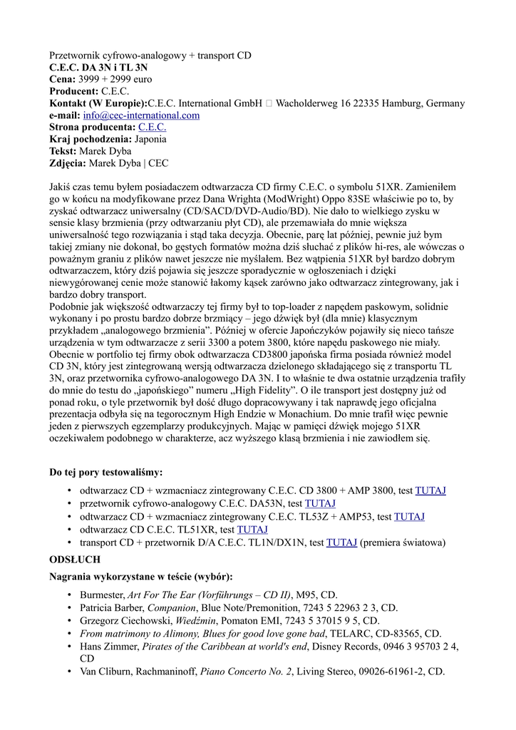 Przetwornik cyfrowo-analogowy + transport CD C.E.C. DA 3N i TL 3N Cena: 3999 + 2999 euro Producent: C.E.C. Kontakt (W Europie):C.E.C. International GmbH ǀ Wacholderweg 16 22335 Hamburg, Germany e-mail: [email protected] Strona producenta: C.E.C. Kraj pochodzenia: Japonia Tekst: Marek Dyba Zdjęcia: Marek Dyba | CEC Jakiś czas temu byłem posiadaczem odtwarzacza CD firmy C.E.C. o symbolu 51XR. Zamieniłem go w końcu na modyfikowane przez Dana Wrighta (ModWright) Oppo 83SE właściwie po to, by zyskać odtwarzacz uniwersalny (CD/SACD/DVD-Audio/BD). Nie dało to wielkiego zysku w sensie klasy brzmienia (przy odtwarzaniu płyt CD), ale przemawiała do mnie większa uniwersalność tego rozwiązania i stąd taka decyzja. Obecnie, parę lat później, pewnie już bym takiej zmiany nie dokonał, bo gęstych formatów można dziś słuchać z plików hi-res, ale wówczas o poważnym graniu z plików nawet jeszcze nie myślałem. Bez wątpienia 51XR był bardzo dobrym odtwarzaczem, który dziś pojawia się jeszcze sporadycznie w ogłoszeniach i dzięki niewygórowanej cenie może stanowić łakomy kąsek zarówno jako odtwarzacz zintegrowany, jak i bardzo dobry transport. Podobnie jak większość odtwarzaczy tej firmy był to top-loader z napędem paskowym, solidnie wykonany i po prostu bardzo dobrze brzmiący – jego dźwięk był (dla mnie) klasycznym przykładem „analogowego brzmienia”. Później w ofercie Japończyków pojawiły się nieco tańsze urządzenia w tym odtwarzacze z serii 3300 a potem 3800, które napędu paskowego nie miały. Obecnie w portfolio tej firmy obok odtwarzacza CD3800 japońska firma posiada również model CD 3N, który jest zintegrowaną wersją odtwarzacza dzielonego składającego się z transportu TL 3N, oraz przetwornika cyfrowo-analogowego DA 3N. I to właśnie te dwa ostatnie urządzenia trafiły do mnie do testu do „japońskiego” numeru „High Fidelity”. O ile transport jest dostępny już od ponad roku, o tyle przetwornik był dość długo dopracowywany i tak naprawdę jego oficjalna prezentacja odbyła się na tegorocznym High Endzie w Monachium. Do mnie trafił więc pewnie jeden z pierwszych egzemplarzy produkcyjnych. Mając w pamięci dźwięk mojego 51XR oczekiwałem podobnego w charakterze, acz wyższego klasą brzmienia i nie zawiodłem się. Do tej pory testowaliśmy: • • • • • odtwarzacz CD + wzmacniacz zintegrowany C.E.C. CD 3800 + AMP 3800, test TUTAJ przetwornik cyfrowo-analogowy C.E.C. DA53N, test TUTAJ odtwarzacz CD + wzmacniacz zintegrowany C.E.C. TL53Z + AMP53, test TUTAJ odtwarzacz CD C.E.C. TL51XR, test TUTAJ transport CD + przetwornik D/A C.E.C. TL1N/DX1N, test TUTAJ (premiera światowa) ODSŁUCH Nagrania wykorzystane w teście (wybór): Burmester, Art For The Ear (Vorführungs – CD II), M95, CD. Patricia Barber, Companion, Blue Note/Premonition, 7243 5 22963 2 3, CD. Grzegorz Ciechowski, Wiedźmin, Pomaton EMI, 7243 5 37015 9 5, CD. From matrimony to Alimony, Blues for good love gone bad, TELARC, CD-83565, CD. Hans Zimmer, Pirates of the Caribbean at world's end, Disney Records, 0946 3 95703 2 4, CD • Van Cliburn, Rachmaninoff, Piano Concerto No. 2, Living Stereo, 09026-61961-2, CD. • • • • • • Mutter-Wiener Philharmoniker-Levine, Carmen Fantasie, DG, 00289 477 5721, SACD/CD. • Możdżer Danielsson Fresco, The time, Outside Music, OM CD001, CD. • Louis Armstrong & Duke Ellington, The Great summit, Complete Sessions, Roulette Jazz, 7243 5 24546 2 4, CD. • Cassandra Wilson, Traveling Miles, Blue Note, 7243 8 54123 2 5, CD. Stylistycznie urządzenia C.E.C.-a, jak przystało na japońskie urządzenia, za bardzo się nie zmieniają, a przynajmniej nie tą to zmiany rewolucyjne, a najwyżej ewolucyjne. Transport TL 3N zewnętrznie niewiele się różni od odtwarzacza 51XR – w zasadzie to kwestia podświetlanego (w tym pierwszym) włącznika, oraz mniejszej ilości przycisków do obsługi urządzenia, umieszczonych nie pod wyświetlaczem, tylko z prawej stronie frontu. Niebieskie podświetlenie wyłącznika to właściwie jedyny „fajerwerk” wizualny – reszta to elegancka w swej prostocie, solidnie wykonana obudowa z aluminium. Na górze znajduje się odsuwana, szklana pokrywa nad samym napędem, a na płytę kładzie się, chyba jeszcze cięższy niż w 51XR, krążek dociskowy. W środku znajduje się napęd paskowy z dwoma paskami, co do tej pory było domeną wyższych modeli transportów (obecnie TL 3N to najniższy model w ofercie). Nowy przetwornik cyfrowo-analogowy z wyglądu przypomina natomiast najbardziej... wzmacniacz z serii 3800. Dwie spore gałki po bokach, wyświetlacz umieszczony centralnie (acz większy niż we wspomnianym wzmacniaczu) i podświetlany na niebiesko wyłącznik. Wyświetlacz jest znakomity – wyświetlane znaki są duże i bardzo łatwe do odczytania nawet z kilku metrów. Chyba w końcu jakaś firma dorównała pod tym względem kanadyjskiemu Moonowi. Na tymże wyświetlaczu wyświetlane są informacje o tym, z którego wejścia korzystamy oraz jaką częstotliwość próbkowania przez to wejście DAC otrzymuje. Na froncie znajdziemy jeszcze gniazdo słuchawkowe fi 6,3 mm (duży jack), gniazdo USB (mini, typ B), oraz wejście optyczne (mini) – te dwa ostatnie zapewne głównie do podłączania urządzeń przenośnych. Wspomniane dwie duże gałki to obrotowy selektor wejść (wykonując niewielki ruch przeskakuje się na kolejne wejścia, nazwy pojawiają się na wyświetlaczu) oraz regulacja głośności, która działa zarówno dla wyjścia słuchawkowego, jak i dla analogowych wyjść z regulowanym poziomem sygnału, użycie których pozwala na bezpośrednie sterowanie końcówką mocy. Tył urządzenia wygląda przebogato – ilość wejść cyfrowych jest ogromna, choć można by dyskutować czy proporcje są najwłaściwsze (to zawsze będzie zależało od punktu widzenia konkretnego użytkownika). Mamy bowiem tylko jedno wejście S/PDIF koaksjaln