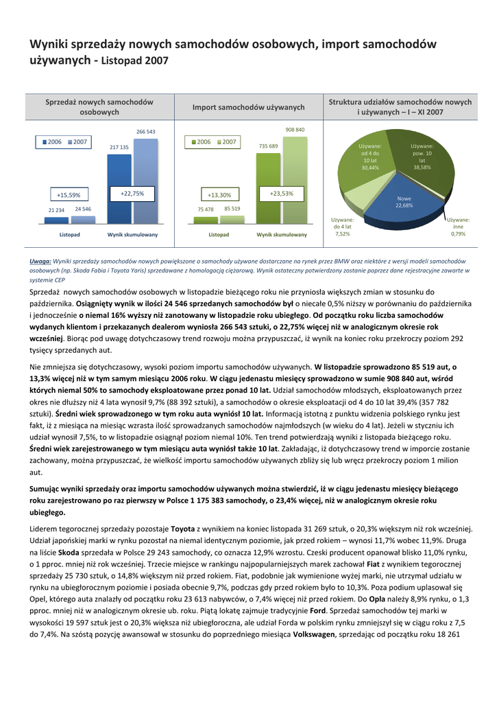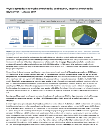Wyniki sprzedaży nowych samochodów osobowych, import samochodów używanych - Listopad 2007 Sprzedaż nowych samochodów osobowych Import samochodów używanych 908 840 266 543 2006 2007 +15,59% 21 234 217 135 +22,75% 24 546 Listopad 2006 2007 +13,30% 75 478 Wynik skumulowany Struktura udziałów samochodów nowych i używanych – I – XI 2007 735 689 Używane: od 4 do 10 lat 30,44% +23,53% Nowe 22,68% 85 519 Listopad Wynik skumulowany Używane: pow. 10 lat 38,58% Używane: do 4 lat 7,52% Używane: inne 0,79% Uwaga: Wyniki sprzedaży samochodów nowych powiększone o samochody używane dostarczane na rynek przez BMW oraz niektóre z wersji modeli samochodów osobowych (np. Skoda Fabia i Toyota Yaris) sprzedawane z homologacją ciężarową. Wynik ostateczny potwierdzony zostanie poprzez dane rejestracyjne zawarte w systemie CEP Sprzedaż nowych samochodów osobowych w listopadzie bieżącego roku nie przyniosła większych zmian w stosunku do października. Osiągnięty wynik w ilości 24 546 sprzedanych samochodów był o niecałe 0,5% niższy w porównaniu do października i jednocześnie o niemal 16% wyższy niż zanotowany w listopadzie roku ubiegłego. Od początku roku liczba samochodów wydanych klientom i przekazanych dealerom wyniosła 266 543 sztuki, o 22,75% więcej niż w analogicznym okresie rok wcześniej. Biorąc pod uwagę dotychczasowy trend rozwoju można przypuszczad, iż wynik na koniec roku przekroczy poziom 292 tysięcy sprzedanych aut. Nie zmniejsza się dotychczasowy, wysoki poziom importu samochodów używanych. W listopadzie sprowadzono 85 519 aut, o 13,3% więcej niż w tym samym miesiącu 2006 roku. W ciągu jedenastu miesięcy sprowadzono w sumie 908 840 aut, wśród których niemal 50% to samochody eksploatowane przez ponad 10 lat. Udział samochodów młodszych, eksploatowanych przez okres nie dłuższy niż 4 lata wynosił 9,7% (88 392 sztuki), a samochodów o okresie eksploatacji od 4 do 10 lat 39,4% (357 782 sztuki). Średni wiek sprowadzonego w tym roku auta wyniósł 10 lat. Informacją istotną z punktu widzenia polskiego rynku jest fakt, iż z miesiąca na miesiąc wzrasta ilośd sprowadzanych samochodów najmłodszych (w wieku do 4 lat). Jeżeli w styczniu ich udział wynosił 7,5%, to w listopadzie osiągnął poziom niemal 10%. Ten trend potwierdzają wyniki z listopada bieżącego roku. Średni wiek zarejestrowanego w tym miesiącu auta wyniósł także 10 lat. Zakładając, iż dotychczasowy trend w imporcie zostanie zachowany, można przypuszczad, że wielkośd importu samochodów używanych zbliży się lub wręcz przekroczy poziom 1 milion aut. Sumując wyniki sprzedaży oraz importu samochodów używanych można stwierdzid, iż w ciągu jedenastu miesięcy bieżącego roku zarejestrowano po raz pierwszy w Polsce 1 175 383 samochody, o 23,4% więcej, niż w analogicznym okresie roku ubiegłego. Liderem tegorocznej sprzedaży pozostaje Toyota z wynikiem na koniec listopada 31 269 sztuk, o 20,3% większym niż rok wcześniej. Udział japooskiej marki w rynku pozostał na niemal identycznym poziomie, jak przed rokiem – wynosi 11,7% wobec 11,9%. Druga na liście Skoda sprzedała w Polsce 29 243 samochody, co oznacza 12,9% wzrostu. Czeski producent opanował blisko 11,0% rynku, o 1 pproc. mniej niż rok wcześniej. Trzecie miejsce w rankingu najpopularniejszych marek zachował Fiat z wynikiem tegorocznej sprzedaży 25 730 sztuk, o 14,8% większym niż przed rokiem. Fiat, podobnie jak wymienione wyżej marki, nie utrzymał udziału w rynku na ubiegłorocznym poziomie i posiada obecnie 9,7%, podczas gdy przed rokiem było to 10,3%. Poza podium uplasował się Opel, którego auta znalazły od początku roku 23 613 nabywców, o 7,4% więcej niż przed rokiem. Do Opla należy 8,9% rynku, o 1,3 pproc. mniej niż w analogicznym okresie ub. roku. Piątą lokatę zajmuje tradycyjnie Ford. Sprzedaż samochodów tej marki w wysokości 19 597 sztuk jest o 20,3% większa niż ubiegłoroczna, ale udział Forda w polskim rynku zmniejszył się w ciągu roku z 7,5 do 7,4%. Na szóstą pozycję awansował w stosunku do poprzedniego miesiąca Volkswagen, sprzedając od początku roku 18 261 aut osobowych, o 33,2% więcej niż przed rokiem. To jednocześnie pierwszy producent, który zwiększył swój udział rynkowy: z 6,3 do 6,9%. Sprzedaż samochodów nowych – Ranking marek Styczeo – listopad 2007 Poz. Marka Sprzedaż Zmiana Udział [ilość sztuk] [%] [%] Import samochodów używanych – Ranking marek Styczeo – listopad 2007 Poz. Marka Sprzedaż Zmiana Udział [ilość sztuk] [%] [%] Średni rok produkcji 1. Toyota 31 269 20,27% 11,73% 1. Volkswagen 187 448 15,21% 20,62% 1996 2. Skoda 29 243 12,87% 10,97% 2. Opel 140 778 9,44% 15,49% 1997 3. Fiat 25 730 14,83% 9,65% 3. Ford 87 660 12,98% 9,65% 1997 4. Opel 23 613 7,44% 8,86% 4. Renault 67 127 41,05% 7,39% 1998 5. Ford 19 597 20,32% 7,35% 5. Audi 67 057 22,75% 7,38% 1997 6. Volkswagen 18 261 33,15% 6,85% 6. Mercedes 39 435 41,28% 4,34% 1997 7. Peugeot 17 588 28,60% 6,60% 7. BMW 34 343 18,41% 3,78% 1996 8. Renault 14 943 4,83% 5,61% 8. Seat 26 708 26,39% 2,94% 1998 9. Citroen 12 669 16,27% 4,75% 9. Peugeot 23 697 36,79% 2,61% 1999 10. Fiat 23 648 43,83% 2,60% 1998 11. Nissan 22 142 21,07% 2,44% 1997 12. Mazda 19 695 34,92% 2,17% 1997 13. Toyota 18 256 86,02% 2,01% 2000 14. Honda 17 340 18,53% 1,91% 1996 15. Citroen 15 914 43,62% 1,75% 1999 Pozostałe 117 592 38,34% 12,94% 1996 Razem 908 840 22,75% 100,00% 10. Honda 11. KIA 12. SEAT 13. Nissan 14. Suzuki 15. Chevrolet Pozostałe Razem 12 024 7 884 7 033 6 716 6 520 4 783 28 670 266 543 32,96% 112,45% 71,49% 3,69% 81,62% 22,08% 35,40% 22,75% 4,51% 2,96% 2,64% 2,52% 2,45% 1,79% 10,76% 100,00% 1998 Awans Volkswagena spowodował utratę zajmowanej dotychczas lokaty przez Peugeot’a, który spadł na 7. miejsce listy, mimo wysokiego procentowego wskaźnika wzrostu sprzedaży sumarycznej. Wynik po jedenastu miesiącach roku wyniósł 17 588 sztuk, jest o 28