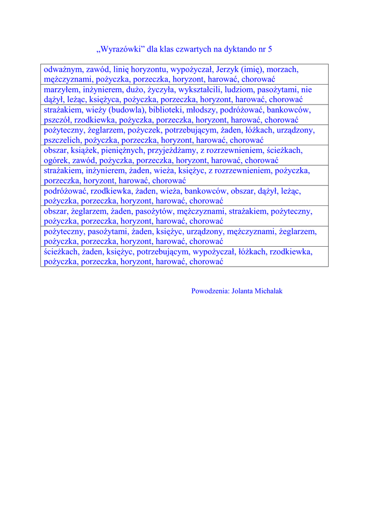 „Wyrazówki” dla klas czwartych na dyktando nr 5 odwaŜnym, zawód, linię horyzontu, wypoŜyczał, Jerzyk (imię), morzach, męŜczyznami, poŜyczka, porzeczka, horyzont, harować, chorować marzyłem, inŜynierem, duŜo, Ŝyczyła, wykształcili, ludziom, pasoŜytami, nie dąŜył, leŜąc, księŜyca, poŜyczka, porzeczka, horyzont, harować, chorować straŜakiem, wieŜy (budowla), biblioteki, młodszy, podróŜować, bankowców, pszczół, rzodkiewka, poŜyczka, porzeczka, horyzont, harować, chorować poŜyteczny, Ŝeglarzem, poŜyczek, potrzebującym, Ŝaden, łóŜkach, urządzony, pszczelich, poŜyczka, porzeczka, horyzont, harować, chorować obszar, ksiąŜek, pienięŜnych, przyjeŜdŜamy, z rozrzewnieniem, ścieŜkach, ogórek, zawód, poŜyczka, porzeczka, horyzont, harować, chorować straŜakiem, inŜynierem, Ŝaden, wieŜa, księŜyc, z rozrzewnieniem, poŜyczka, porzeczka, horyzont, harować, chorować podróŜować, rzodkiewka, Ŝaden, wieŜa, bankowców, obszar, dąŜył, leŜąc, poŜyczka, porzeczka, horyzont, harować, chorować obszar, Ŝeglarzem, Ŝaden, pasoŜytów, męŜczyznami, straŜakiem, poŜyteczny, poŜyczka, porzeczka, horyzont, harować, chorować poŜyteczny, pasoŜytami, Ŝaden, księŜyc, urządzony, męŜczyznami, Ŝeglarzem, poŜyczka, porzeczka, horyzont, harować, chorować ścieŜkach, Ŝaden, księŜyc, potrzebującym, wypoŜyczał, łóŜkach, rzodkiewka, poŜyczka, porzeczka, horyzont, harować, chorować Powodzenia: Jolanta Michalak