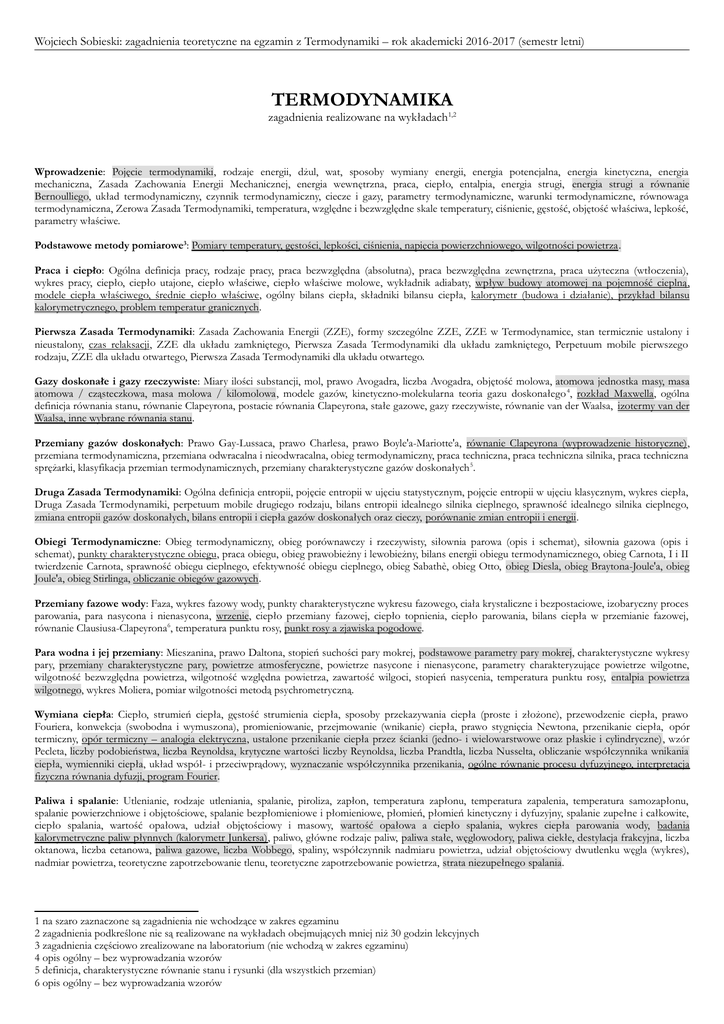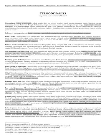 Wojciech Sobieski: zagadnienia teoretyczne na egzamin z Termodynamiki – rok akademicki 2016-2017 (semestr letni) TERMODYNAMIKA zagadnienia realizowane na wykładach1,2 Wprowadzenie: Pojęcie termodynamiki, rodzaje energii, dżul, wat, sposoby wymiany energii, energia potencjalna, energia kinetyczna, energia mechaniczna, Zasada Zachowania Energii Mechanicznej, energia wewnętrzna, praca, ciepło, entalpia, energia strugi, energia strugi a równanie Bernoulliego, układ termodynamiczny, czynnik termodynamiczny, ciecze i gazy, parametry termodynamiczne, warunki termodynamiczne, równowaga termodynamiczna, Zerowa Zasada Termodynamiki, temperatura, względne i bezwzględne skale temperatury, ciśnienie, gęstość, objętość właściwa, lepkość, parametry właściwe. Podstawowe metody pomiarowe3: Pomiary temperatury, gęstości, lepkości, ciśnienia, napięcia powierzchniowego, wilgotności powietrza. Praca i ciepło: Ogólna definicja pracy, rodzaje pracy, praca bezwzględna (absolutna), praca bezwzględna zewnętrzna, praca użyteczna (wtłoczenia), wykres pracy, ciepło, ciepło utajone, ciepło właściwe, ciepło właściwe molowe, wykładnik adiabaty, wpływ budowy atomowej na pojemność cieplną , modele ciepła właściwego, średnie ciepło właściwe, ogólny bilans ciepła, składniki bilansu ciepła, kalorymetr (budowa i działanie), przykład bilansu kalorymetrycznego, problem temperatur granicznych. Pierwsza Zasada Termodynamiki: Zasada Zachowania Energii (ZZE), formy szczególne ZZE, ZZE w Termodynamice, stan termicznie ustalony i nieustalony, czas relaksacji, ZZE dla układu zamkniętego, Pierwsza Zasada Termodynamiki dla układu zamkniętego, Perpetuum mobile pierwszego rodzaju, ZZE dla układu otwartego, Pierwsza Zasada Termodynamiki dla układu otwartego. Gazy doskonałe i gazy rzeczywiste: Miary ilości substancji, mol, prawo Avogadra, liczba Avogadra, objętość molowa, atomowa jednostka masy, masa atomowa / cząsteczkowa, masa molowa / kilomolowa, modele gazów, kinetyczno-molekularna teoria gazu doskonałego 4, rozkład Maxwella, ogólna definicja równania stanu, równanie Clapeyrona, postacie równania Clapeyrona, stałe gazowe, gazy rzeczywiste, równanie van der Waalsa, izotermy van der Waalsa, inne wybrane równania stanu. Przemiany gazów doskonałych: Prawo Gay-Lussaca, prawo Charlesa, prawo Boyle'a-Mariotte'a, równanie Clapeyrona (wyprowadzenie historyczne), przemiana termodynamiczna, przemiana odwracalna i nieodwracalna, obieg termodynamiczny, praca techniczna, praca techniczna silnika, praca techniczna sprężarki, klasyfikacja przemian termodynamicznych, przemiany charakterystyczne gazów doskonałych 5. Druga Zasada Termodynamiki: Ogólna definicja entropii, pojęcie entropii w ujęciu statystycznym, pojęcie entropii w ujęciu klasycznym, wykres ciepła, Druga Zasada Termodynamiki, perpetuum mobile drugiego rodzaju, bilans entropii idealnego silnika cieplnego, sprawność idealnego silnika cieplnego, zmiana entropii gazów doskonałych, bilans entropii i ciepła gazów doskonałych oraz cieczy, porównanie zmian entropii i energii. Obiegi Termodynamiczne: Obieg termodynamiczny, obieg porównawczy i rzeczywisty, siłownia parowa (opis i schemat), siłownia gazowa (opis i schemat), punkty charakterystyczne obiegu, praca obiegu, obieg prawobieżny i lewobieżny, bilans energii obiegu termodynamicznego, obieg Carnota, I i II twierdzenie Carnota, sprawność obiegu cieplnego, efektywność obiegu cieplnego, obieg Sabathè, obieg Otto, obieg Diesla, obieg Braytona-Joule'a, obieg Joule'a, obieg Stirlinga, obliczanie obiegów gazowych. Przemiany fazowe wody: Faza, wykres fazowy wody, punkty charakterystyczne wykresu fazowego, ciała krystaliczne i bezpostaciowe, izobaryczny proces parowania, para nasycona i nienasycona, wrzenie, ciepło przemiany fazowej, ciepło topnienia, ciepło parowania, bilans ciepła w przemianie fazowej, równanie Clausiusa-Clapeyrona6, temperatura punktu rosy, punkt rosy a zjawiska pogodowe. Para wodna i jej przemiany: Mieszanina, prawo Daltona, stopień suchości pary mokrej, podstawowe parametry pary mokrej, charakterystyczne wykresy pary, przemiany charakterystyczne pary, powietrze atmosferyczne, powietrze nasycone i nienasycone, parametry charakteryzujące powietrze wilgotne, wilgotność bezwzględna powietrza, wilgotność względna powietrza, zawartość wilgoci, stopień nasycenia, temperatura punktu rosy, entalpia powietrza wilgotnego, wykres Moliera, pomiar wilgotności metodą psychrometryczną. Wymiana ciepła: Ciepło, strumień ciepła, gęstość strumienia ciepła, sposoby przekazywania ciepła (proste i złożone), przewodzenie ciepła, prawo Fouriera, konwekcja (swobodna i wymuszona), promieniowanie, przejmowanie (wnikanie) ciepła, prawo stygnięcia Newtona, przenikanie ciepła, opór termiczny, opór termiczny – analogia elektryczna, ustalone przenikanie ciepła przez ścianki (jedno- i wielowarstwowe oraz płaskie i cylindryczne), wzór Pecleta, liczby podobieństwa, liczba Reynoldsa, krytyczne wartości liczby Reynoldsa, liczba Prandtla, liczba Nusselta, obliczanie współczynnika wnikania ciepła, wymienniki ciepła, układ współ- i przeciwprądowy, wyznaczanie współczynnika przenikania, ogólne równanie procesu dyfuzyjnego, interpretacja fizyczna równania dyfuzji, program Fourier. Paliwa i spalanie: Utlenianie, rodzaje utleniania, spalanie, piroliza, zapłon, temperatura zapłonu, temperatura zapalenia, temperatura samozapłonu, spalanie powierzchniowe i objętościowe, spalanie bezpłomieniowe i płomieniowe, płomień, płomień kinetyczny i dyfuzyjny, spalanie zupełne i całkowite, ciepło spalania, wartość opałowa, udział objętościowy i masowy, wartość opałowa a ciepło spalania, wykres ciepła parowania wody, badania kalorymetryczne paliw płynnych (kalorymetr Junkersa), paliwo, główne rodzaje paliw, paliwa stałe, węglowodory, paliwa ciekłe, destylacja frakcyjna, liczba oktanowa