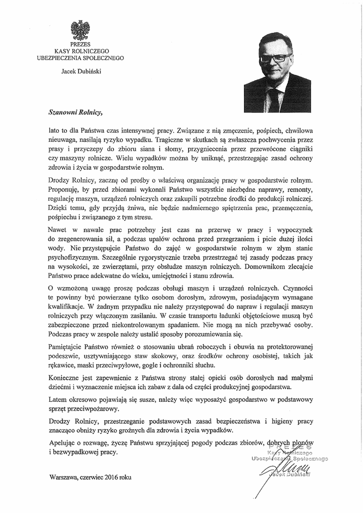 PREZES KASY ROLNICZEGO UBEZPIECZENIA SPOŁECZNEGO Jacek Dubiński Szanowni Rolnicy, lato to dla Państwa czas intensywnej pracy. Związane z nią zmęczenie, pośpiech, chwilowa nieuwaga, nasilają ryzyko wypadku. Tragiczne w skutkach są zwłaszcza pochwycenia przez prasy i przyczepy do zbioru siana i słomy, przygniecenia przez przewrócone ciągniki czy maszyny rolnicze. Wielu wypadków można by uniknąć, przestrzegaj ąc zasad ochrony zdrowia i życia w gospodarstwie rolnym. Drodzy Rolnicy, zacznę od prośby o właściwą organizację pracy w gospodarstwie rolnym. Proponuję, by przed zbiorami wykonali Państwo wszystkie niezbędne naprawy, remonty, regulację maszyn, urządzeń rolniczych oraz zakupili potrzebne środki do produkcji rolniczej. Dzięki temu, gdy przyjdą żniwa, nie będzie nadmiernego spiętrzenia prac, przemęczenia, pośpiechu i związanego z tym stresu. Nawet w nawale prac potrzebny jest czas na przerwę w pracy i wypoczynek do zregenerowania sił, a podczas upałów ochrona przed przegrzaniem i picie dużej ilości wody. Nie przystępujcie Państwo do zajęć w gospodarstwie rolnym w złym stanie psychofizycznym. Szczególnie rygorystycznie trzeba przestrzegać tej zasady podczas pracy na wysokości, ze zwierzętami, przy obsłudze maszyn rolniczych. Domownikom zlecajcie Państwo prace adekwatne do wieku, umiejętności i stanu zdrowia. O wzmożoną uwagę proszę podczas obsługi maszyn i urządzeń rolniczych. Czynności te powinny być powierzane tylko osobom dorosłym, zdrowym, posiadającym wymagane kwalifikacje. W żadnym przypadku nie należy przystępować do napraw i regulacji maszyn rolniczych przy włączonym zasilaniu. W czasie transportu ładunki objętościowe muszą być zabezpieczone przed niekontrolowanym spadaniem. Nie mogą na nich przebywać osoby. Podczas pracy w zespole należy ustalić sposoby porozumiewania się. Pamiętajcie Państwo również o stosowaniu ubrań roboczych i obuwia na protektorowanej podeszwie, usztywniającego staw skokowy, oraz środków ochrony osobistej, takich jak rękawice, maski przeciwpyłowe, gogle i ochronniki słuchu. Konieczne jest zapewnienie z Państwa strony stałej opieki osób dorosłych nad małymi dziećmi i wyznaczenie miejsca ich zabaw z dala od części produkcyjnej gospodarstwa. Latem okresowo pojawiają się susze, należy więc wyposażyć gospodarstwo w podstawowy sprzęt przeciwpożarowy. Drodzy Rolnicy, przestrzeganie podstawowych zasad bezpieczeństwa i higieny pracy znacząco obniży ryzyko groźnych dla zdrowia i życia wypadków. Apelując o rozwagę, życzę i bezwypadkowej pracy. Państwu sprzyjającej Warszawa, czerwiec 2016 roku pogody podczas zbiorów, Q.Q~!ych I?l_ Ó)łl j - rt:: r< ,..::; ':.";'1 i"'ói-":~n!e.7.:,?qo