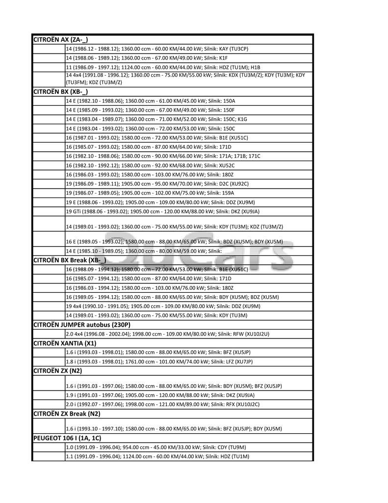 CITROËN AX (ZA-_) 14 (1986.12 - 1988.12); 1360.00 ccm - 60.00 KM/44.00 kW; Silnik: KAY (TU3CP) 14 (1988.06 - 1989.12); 1360.00 ccm - 67.00 KM/49.00 kW; Silnik: K1F 11 (1986.09 - 1997.12); 1124.00 ccm - 60.00 KM/44.00 kW; Silnik: HDZ (TU1M); H1B 14 4x4 (1991.08 - 1996.12); 1360.00 ccm - 75.00 KM/55.00 kW; Silnik: KDX (TU3M/Z); KDY (TU3M); KDY (TU3FM); KDZ (TU3M/Z) CITROËN BX (XB-_) 14 E (1982.10 - 1988.06); 1360.00 ccm - 61.00 KM/45.00 kW; Silnik: 150A 14 E (1985.09 - 1993.02); 1360.00 ccm - 67.00 KM/49.00 kW; Silnik: 150F 14 E (1983.04 - 1989.07); 1360.00 ccm - 71.00 KM/52.00 kW; Silnik: 150C; K1G 14 E (1983.04 - 1993.02); 1360.00 ccm - 72.00 KM/53.00 kW; Silnik: 150C 16 (1987.01 - 1993.02); 1580.00 ccm - 72.00 KM/53.00 kW; Silnik: B1E (XU51C) 16 (1985.07 - 1993.02); 1580.00 ccm - 87.00 KM/64.00 kW; Silnik: 171D 16 (1982.10 - 1988.06); 1580.00 ccm - 90.00 KM/66.00 kW; Silnik: 171A; 171B; 171C 16 (1982.10 - 1992.12); 1580.00 ccm - 92.00 KM/68.00 kW; Silnik: XU52C 16 (1986.03 - 1993.02); 1580.00 ccm - 103.00 KM/76.00 kW; Silnik: 180Z 19 (1986.09 - 1989.11); 1905.00 ccm - 95.00 KM/70.00 kW; Silnik: D2C (XU92C) 19 (1986.07 - 1989.05); 1905.00 ccm - 102.00 KM/75.00 kW; Silnik: 159A 19 E (1988.06 - 1993.02); 1905.00 ccm - 109.00 KM/80.00 kW; Silnik: DDZ (XU9M) 19 GTi (1988.06 - 1993.02); 1905.00 ccm - 120.00 KM/88.00 kW; Silnik: DKZ (XU9JA) 14 (1989.01 - 1993.02); 1360.00 ccm - 75.00 KM/55.00 kW; Silnik: KDY (TU3M); KDZ (TU3M/Z) 16 E (1989.05 - 1993.02); 1580.00 ccm - 88.00 KM/65.00 kW; Silnik: BDZ (XU5M); BDY (XU5M) 14 E (1985.10 - 1989.05); 1360.00 ccm - 80.00 KM/59.00 kW; Silnik: CITROËN BX Break (XB-_) 16 (1988.09 - 1994.12); 1580.00 ccm - 72.00 KM/53.00 kW; Silnik: B1E (XU51C) 16 (1985.07 - 1994.12); 1580.00 ccm - 87.00 KM/64.00 kW; Silnik: 171D 16 (1986.03 - 1994.12); 1580.00 ccm - 103.00 KM/76.00 kW; Silnik: 180Z 16 (1989.05 - 1994.12); 1580.00 ccm - 88.00 KM/65.00 kW; Silnik: BDY (XU5M); BDZ (XU5M) 19 4x4 (1990.10 - 1991.05); 1905.00 ccm - 109.00 KM/80.00 kW; Silnik: DDZ (XU9M) 14 (1989.01 - 1993.02); 1360.00 ccm - 75.00 KM/55.00 kW; Silnik: KDY (TU3M) CITROËN JUMPER autobus (230P) 2.0 4x4 (1996.08 - 2002.04); 1998.00 ccm - 109.00 KM/80.00 kW; Silnik: RFW (XU10J2U) CITROËN XANTIA (X1) 1.6 i (1993.03 - 1998.01); 1580.00 ccm - 88.00 KM/65.00 kW; Silnik: BFZ (XU5JP) 1.8 i (1993.03 - 1998.01); 1761.00 ccm - 101.00 KM/74.00 kW; Silnik: LFZ (XU7JP) CITROËN ZX (N2) 1.6 i (1991.03 - 1997.06); 1580.00 ccm - 88.00 KM/65.00 kW; Silnik: BDY (XU5M); BFZ (XU5JP) 1.9 i (1991.03 - 1997.06); 1905.00 ccm - 120.00 KM/88.00 kW; Silnik: DKZ (XU9JA) 2.0 i (1992.07 - 1997.06); 1998.00 ccm - 121.00 KM/89.00 kW; Silnik: RFX (XU10J2C) CITROËN ZX Break (N2) 1.6 i (1993.10 - 1997.10); 1580.00 ccm - 88.00 KM/65.00 kW; Silnik: BFZ (XU5JP); BDY (XU5M) PEUGEOT 106 I (1A, 1C) 1.0 (1991.09 - 1996.04); 954.00 ccm - 45.00 KM/33.00 kW; Silnik: CDY (TU9M) 1.1 (1991.09 - 1996.04); 1124.00 ccm - 60.00 KM/44.00 kW; Silnik: HDZ (TU1M) 1.0 (1991.09 - 1996.04); 954.00 ccm - 50.00 KM/37.00 kW; Silnik: CDZ (TU9M) PEUGEOT 205 I (741A/C) 1.9 GTI (1987.03 - 1987.10); 1905.00 ccm - 102.00 KM/75.00 kW; Silnik: DFZ (XU9J1) PEUGEOT 205 I kabriolet (741B, 20D) 1.4 CJ (1991.05 - 1994.12); 1361.00 ccm - 75.00 KM/55.00 kW; Silnik: KDY (TU3M); KDZ (TU3M) 1.6 CJ (1992.08 - 1994.12); 1580.00 ccm - 88.00 KM/65.00 kW; Silnik: BDY (XU5M3Z) 1.9 CTI (1987.10 - 1994.12); 1905.00 ccm - 102.00 KM/75.00 kW; Silnik: DFZ (XU9J1) PEUGEOT 205 II (20A/C) 1.4 (1988.07 - 1989.05); 1360.00 ccm - 79.00 KM/58.00 kW; Silnik: 150B (XY8); 150H (XY8) 1.0 (1987.10 - 1998.09); 954.00 ccm - 45.00 KM/33.00 kW; Silnik: TU9 1.1 (1989.07 - 1998.09); 1124.00 ccm - 60.00 KM/44.00 kW; Silnik: HDZ (TU1M) 1.6 Aut. (1990.05 - 1998.09); 1580.00 ccm - 88.00 KM/65.00 kW; Silnik: BDY (XU5M3Z); BDY (XU5M2Z) 1.9 GTI (1987.10 - 1989.05); 1905.00 ccm - 102.00 KM/75.00 kW; Silnik: D2A (XU92C) 1.9 GTI (1987.10 - 1994.10); 1905.00 ccm - 120.00 KM/88.00 kW; Silnik: DKZ (XU9JAZ) 1.9 GTI CAT (1987.10 - 1994.07); 1905.00 ccm - 102.00 KM/75.00 kW; Silnik: DFZ (XU9J1) PEUGEOT 305 II (581M) 1.9 (1986.11 - 1988.12); 1905.00 ccm - 98.00 KM/72.00 kW; Silnik: DFZ (XU9J1) PEUGEOT 305 II Break (581E) 1.9 (1986.11 - 1988.12); 1905.00 ccm - 98.00 KM/72.00 kW; Silnik: DFZ (XU9J1) PEUGEOT 306 (7B, N3, N5) 1.1 (1994.06 - 2001.05); 1124.00 ccm - 60.00 KM/44.00 kW; Silnik: HDZ (TU1M) 1.4 SL (1994.06 - 2001.05); 1360.00 ccm - 75.00 KM/55.00 kW; Silnik: KDX (TU3MC); KFX (TU3JP); KFW (TU3JP) 1.8 ST (1994.06 - 2001.05); 1762.00 ccm - 101.00 KM/74.00 kW; Silnik: LFZ (XU7JP) 2.0 ST (1994.07 - 2001.05); 1998.00 ccm - 121.00 KM/89.00 kW; Silnik: RFX (XU10J2) PEUGEOT 306 hatchback (7A, 7C, N3, N5) 1.1 (1993.05 - 2001.05); 1124.00 ccm - 60.00 KM/44.00 kW; Silnik: HDZ (TU1M) 1.4 (1993.05 - 2001.05); 1360.00 ccm - 75.00 KM/55.00 kW; Silnik: KDX (TU3MC); KFX (TU3JP); KFW (TU3JP) 1.8 (1993.05 - 2001.05); 1762.00 ccm - 101.00 KM/74.00 kW; Silnik: LFZ (XU7JP) PEUGEOT 306 kabriolet (7D, N3, N5) 1.8 (1994.03 - 2002.04); 1762.00 ccm - 101.00 KM/74.00 kW; Silnik: LFZ (XU7JP) PEUGEOT 309 I (10C, 10A) 1.4 (1989.03 - 1989.07); 1360.00 ccm - 75.00 KM/55.00 kW; Silnik: KDY (TU3M); KDZ (TU3M) 1.9 (1986.03 - 1989.07); 1905.00 ccm - 98.00 KM/72.00 kW; Silnik: DFZ (XU9J1) PEUGEOT 309 II (3C, 3A) 1.4 (1989.07 - 1993.12); 1361.00 ccm - 75.00 KM/55.00 kW; Silnik: KDY (TU3M); KDZ (TU3M) 1.6 (1989.07 - 1993.12); 1580.00 ccm - 88.00 KM/65.00 kW; Silnik: BDY (XU5M2Z); BDY (XU5M3Z); BDZ (XU5M) 1.9 (1989.08 - 1993.12); 1905.00 ccm - 98.00 KM/72.00 kW; Silnik: DFZ (XU9J1) 1.9 (1990.10 - 1993.12); 1905.00 ccm - 109.00 KM/80.00 kW; Silnik: DDZ (XU9M) 1.9 GTI (1989.07 - 1993.12); 1905.00 ccm - 120.00 KM/88.00 kW; Silnik: DKZ (XU9JAZ) PEUGEOT 405 I (15B) 1.9 4x4 (1988.07 - 1992.12); 1905.00 ccm - 109.00 KM/80.00 kW; Silnik: DDZ (XU9M) PEUGEOT 405 II (4B) 1.6 (1992.08 - 1995.10); 1580.00 ccm - 88.00 KM/65.00 kW; Silnik: BDY (XU5M2Z); BDY (XU5M3Z); BDZ (XU5M); BFZ (XU5JP) 2.0 (1992.08 - 1995.10); 1998.00 ccm - 121.00 KM/89.00 kW; Silnik: RFX (XU10