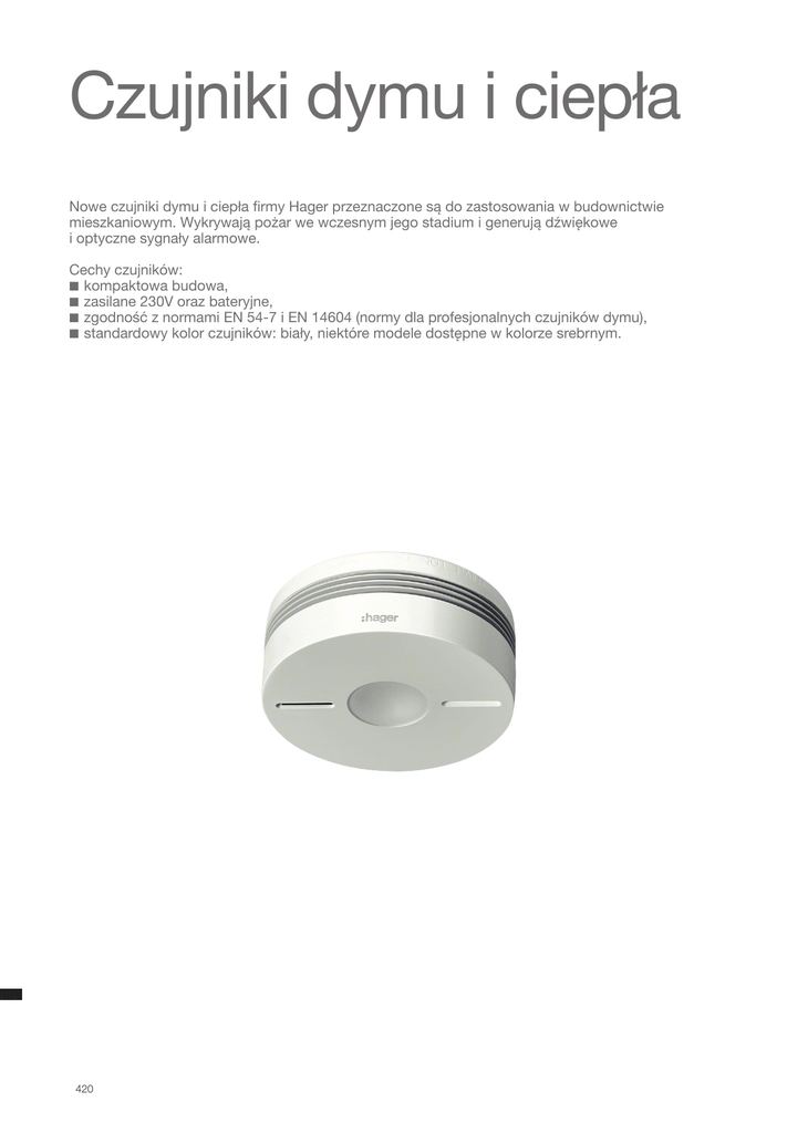 Czujniki dymu i ciepła Nowe czujniki dymu i ciepła firmy Hager przeznaczone są do zastosowania w budownictwie mieszkaniowym. Wykrywają pożar we wczesnym jego stadium i generują dźwiękowe i optyczne sygnały alarmowe. Cechy czujników: 쮿 kompaktowa budowa, 쮿 zasilane 230V oraz bateryjne, 쮿 zgodność z normami EN 54-7 i EN 14604 (normy dla profesjonalnych czujników dymu), 쮿 standardowy kolor czujników: biały, niektóre modele dostępne w kolorze srebrnym. 420 422 Czujniki ciepła 424 Czujniki dymu i ciepła Czujniki dymu 421 Czujniki dymu Nr kat. Nr kat. Czujniki dymu Do pracy samodzielnej i sieciowej Do pracy samodzielnej Czujnik dymu Czujnik dymu biały zasilanie: żywotność baterii czas życia czujnika głośność alarmu w odległości 3 m głośność sygnału testu w odl. 3 m obszar monitorowany temperatura pracy waga wymiary (Ø x wys.) biały, 9 V DC srebrny, 9 V DC biały, 230 V AC TG600A bateria CR123A, 3 V 5 lat 10 lat 85 dB 75 dB maks. 50 m2 -10 do + 65 °C 55 g 97 x 37 mm Czujnik dymu został zaprojektowany do stosowania w zamkniętych pomieszczeniach, takich jak mieszkania, domy jednorodzinne. Do wczesnego wykrycia ognia tlącego oraz ognia otwartego tworzącego dym w pomieszczeniach. Zgodny z normą EN 14604, certyfikat Q zgodnie z dyrektywą VFDB 14-01. Upoważnienie do użytku prywatnego i w obszarach mieszkalnych zgodnie z EN 14676 쮿 optyczny czujnik dymu 쮿 technologia PGSA, cyfrowa analiza sygnału z funkcją autotestu 쮿 małe rozmiary i atrakcyjna stylistyka 쮿 głośny dźwięk ostrzegawczy w przypadku alarmu 쮿 tymczasowe wyłączenia alarmu na 15 min. za pomocą przycisku 쮿 manualny test działania czujnika 쮿 z czerwoną diodą LED alarmu i zasilania 쮿 automatyczny test akumulatora z optyczną i akustyczna sygnalizacją na min. 30 dni przed wymaganą wymianą baterii 쮿 sygnalizacja zanieczyszczenia czujnika 쮿 zabezpieczenie przed demontażem 쮿 do montażu na ścianie i suficie 쮿 montaż możliwy jedynie po założeniu baterii od str. T37 TG500A TG500B TG501A zasilanie zależne od wersji: żywotność baterii obszar detekcji sygnał dźwiękowy maks. długość przewodów łączących wymiary (śr. x wys.) Zgodne z normą EN 14604, 2005-10 (czujniki dymu) i EN 54-7 (profesjonalne czujniki dymu). Do wczesnego wykrycia ognia tlącego oraz ognia otwartego tworzącego dym w pomieszczeniach. 쮿 optyczny czujnik dymu 쮿 nie nadają się do sterowania obwodami zraszaczy przeciwpożarowych 쮿 głośny sygnał ostrzegawczy w przypadku alarmu 쮿 z podświetleniem w przypadku wykrycia alarmu 쮿 z czerwoną diodą LED dla alarmu ciepła lub zasilania 쮿 z zieloną dioda LED sygnalizacji pracy dla zasilania 230V AC 쮿 możliwość tymczasowego wyłączenia alarmu na 15 min. 쮿 przycisk testu do sprawdzenia poprawnej pracy czujnika 쮿 samoczynny monitoring stanu baterii i błędów technicznych 쮿 możliwość połączenia do 40 czujników w sieć 쮿 z osłoną do ochrony przed zakurzeniem podczas prac remontowych 쮿 z zabezpieczeniem przed zawilgoceniem elementów elektronicznych 쮿 montaż możliwy jedynie po założeniu baterii 쮿 wersja zasilania 230 V AC z dodatkową baterią 9 V DC do podtrzymania zasilania 쮿 do montażu na suficie lub płaszczyznach pochyłych 쮿 min. dystans od ścian i kątów pomieszczeń 0,5 m 쮿 zabezpieczenie przed demontażem Czujnik dymu biały zasilanie: żywotność baterii czas życia czujnika głośność alarmu w odległości 3 m głośność sygnału testu w odl. 3 m obszar monitorowany temperatura pracy waga wymiary (Ø x wys.) TG600AL bateria 3 V 10 lat 10 lat 85 dB 75 dB maks. 50 m2 -10 do + 65 °C 55 g 97 x 37 mm Czujnik dymu został zaprojektowany do stosowania w zamkniętych pomieszczeniach, takich jak mieszkania, domy jednorodzinne. Do wczesnego wykrycia ognia tlącego oraz ognia otwartego tworzącego dym w pomieszczeniach. Zgodny z normą EN 14604, certyfikat Q zgodnie z dyrektywą VFDB 14-01. Upoważnienie do użytku prywatnego i w obszarach mieszkalnych zgodnie z EN 14676 쮿 optyczny czujnik dymu 쮿 technologia PGSA, cyfrowa analiza sygnału z funkcją autotestu 쮿 małe rozmiary i atrakcyjna stylistyka 쮿 głośny dźwięk ostrzegawczy w przypadku alarmu 쮿 tymczasowe wyłączenia alarmu na 15 min. za pomocą przycisku 쮿 manualny test działania czujnika 쮿 z czerwoną diodą LED alarmu i zasilania 쮿 zasilany przez wbudowaną baterie litową 3 V (niewymienną) 쮿 automatyczny test akumulatora z optyczną i akustyczna sygnalizacją na min. 30 dni przed wymaganą wymianą urządzenia 쮿 sygnalizacja zanieczyszczenia czujnika 쮿 zabezpieczenie przed demontażem 쮿 do montażu na ścianie i suficie 422 bateria 9V 230 V AC ok 3 lata 50 m2 85 dB do 3 m 400 m 125 x 48 mm Zastrzega się możliwość wprowadzenia zmian technicznych. Dane zawarte w tym katalogu nie są prawnie wiążące. Nowość Wycofywane Czujniki dymu i ciepła Nr kat. Nr kat. Radiowy czujnik dymu komfort Radiowy czujnik dymu i ciepła komfort biały TG550A biały TG551A zasilanie żywotność baterii czas życia czujnika głośność alarmu w odległości 3 m głośność sygnału testu w odl. 3 m obszar monitorowany temperatura pracy waga wymiary (Ø x wys.) 6 V DC 10 lat 10 lat 85 dB 75 dB maks. 50 m2 -10 do + 55 °C 255 g 116 x 49 mm zasilanie żywotność baterii czas życia czujnika głośność alarmu w odległości 3 m głośność sygnału testu w odl. 3 m obszar monitorowany temperatura pracy waga wymiary (Ø x wys.) 6 V DC 10 lat 10 lat 85 dB 75 dB maks. 50 m2 -10 do + 55 °C 255 g 116 x 49 mm Czujnik dymu został zaprojektowany do stosowania w zamkniętych pomieszczeniach, takich jak mieszkania, domy jednorodzinne. Do wczesnego wykrycia ognia tlącego oraz ognia otwartego tworzącego dym w pomieszczeniach. Zgodny z normą EN 14604 Upoważnienie do użytku prywatnego i w obszarach mieszkalnych zgodnie z EN 14676 Uwaga! Po zdjęciu pokrywy zabezpieczającej i deaktywacji funkcji detekcji 