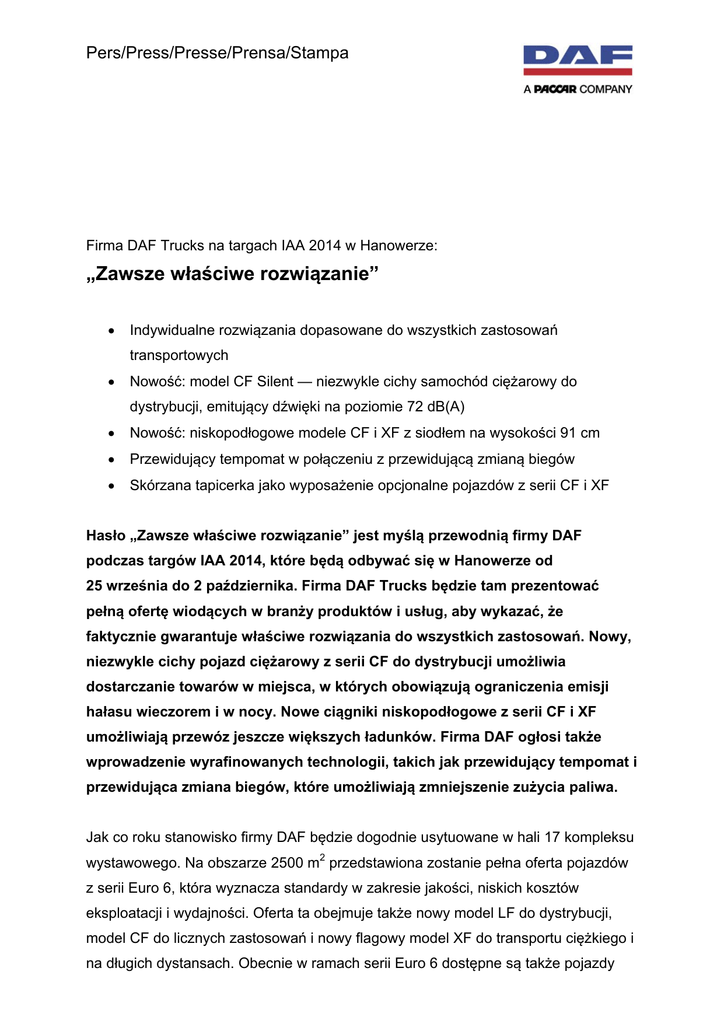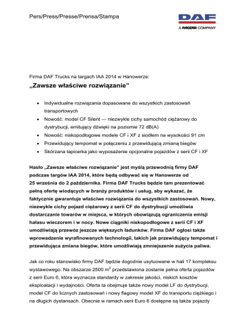 Pers/Press/Presse/Prensa/Stampa Firma DAF Trucks na targach IAA 2014 w Hanowerze: „Zawsze właściwe rozwiązanie” Indywidualne rozwiązania dopasowane do wszystkich zastosowań transportowych Nowość: model CF Silent — niezwykle cichy samochód ciężarowy do dystrybucji, emitujący dźwięki na poziomie 72 dB(A) Nowość: niskopodłogowe modele CF i XF z siodłem na wysokości 91 cm Przewidujący tempomat w połączeniu z przewidującą zmianą biegów Skórzana tapicerka jako wyposażenie opcjonalne pojazdów z serii CF i XF Hasło „Zawsze właściwe rozwiązanie” jest myślą przewodnią firmy DAF podczas targów IAA 2014, które będą odbywać się w Hanowerze od 25 września do 2 października. Firma DAF Trucks będzie tam prezentować pełną ofertę wiodących w branży produktów i usług, aby wykazać, że faktycznie gwarantuje właściwe rozwiązania do wszystkich zastosowań. Nowy, niezwykle cichy pojazd ciężarowy z serii CF do dystrybucji umożliwia dostarczanie towarów w miejsca, w których obowiązują ograniczenia emisji hałasu wieczorem i w nocy. Nowe ciągniki niskopodłogowe z serii CF i XF umożliwiają przewóz jeszcze większych ładunków. Firma DAF ogłosi także wprowadzenie wyrafinowanych technologii, takich jak przewidujący tempomat i przewidująca zmiana biegów, które umożliwiają zmniejszenie zużycia paliwa. Jak co roku stanowisko firmy DAF będzie dogodnie usytuowane w hali 17 kompleksu wystawowego. Na obszarze 2500 m2 przedstawiona zostanie pełna oferta pojazdów z serii Euro 6, która wyznacza standardy w zakresie jakości, niskich kosztów eksploatacji i wydajności. Oferta ta obejmuje także nowy model LF do dystrybucji, model CF do licznych zastosowań i nowy flagowy model XF do transportu ciężkiego i na długich dystansach. Obecnie w ramach serii Euro 6 dostępne są także pojazdy 2 trzy- i czteroosiowe, zatem do każdego zadania związanego z transportem można dobrać odpowiedni samochód ciężarowy DAF. Niezwykle cichy pojazd ciężarowy do dystrybucji: CF Silent Firma DAF opracowała wyjątkowy model CF Silent z myślą o wieczornej i nocnej dystrybucji w mieście. Kiedy w pojeździe CF Silent jest włączony specjalny „Tryb cichy”, poziom emitowanego hałasu nie przekracza 72 dB(A). Oznacza to, że model ten zalicza się do cichych pojazdów i może być wykorzystywany do załadunku i rozładunku towarów w obszarach z ograniczeniami emisji hałasu w porach wieczornych, nocnych i wczesnoporannych. Nowy pojazd DAF CF Silent wyposażony jest w mocny i wydajny silnik PACCAR MX11 Euro 6 o pojemności 10,8 l i mocy od 210 kW/286 KM do 320 kW/435 KM, który jest już dobrze znany z niskiego poziomu emitowanego hałasu. Na desce rozdzielczej znajduje się specjalny przycisk trybu cichej pracy. Naciśnięcie tego przycisku powoduje uruchomienie programu silnika, który ogranicza moment obrotowy i prędkość obrotową silnika, a także umożliwia przełączanie biegów przy niższych prędkościach obrotowych silnika. Również obudowa silnika przyczynia się do zmniejszenia poziomu hałasu. Wyjątkowo cichy pojazd ciężarowy do dystrybucji z serii CF będzie dostępny począwszy od 2015 r. w wersji podwozia pod zabudowę 4×2 z kabiną Day Cab, Sleeper Cab lub Space Cab oraz jednym z wielu rozstawów osi. Nowe modele niskopodłogowe CF i XF: siodło na wysokości 91 cm Jedną z najważniejszych nowości na targach IAA 2014 będą popularne modele CF i XF Euro 6 w wersji niskopodłogowej umożliwiającej transport dużych ładunków. Montaż opon niskoprofilowych (315/45/R22.5) i wykorzystanie zawieszenia pneumatycznego umożliwiło w tych pojazdach obniżenie siodła z wysokości 96 do 91 cm. Dzięki temu do pojazdu można dołączyć naczepę o wysokości wewnętrznej 3 m, nie przekraczając jednocześnie maksymalnej wysokości 4 m i uzyskując maksymalną wydajność przy pojemnościach rzędu 100 m3. Wysokość wewnętrzna 3 m jest szczególnie atrakcyjna w przypadku sektora motoryzacyjnego, ponieważ 3 produkty są pakowane w standardowe kontenery o wysokości 1 m, zatem w tej sytuacji mogą one być ustawiane w trzech warstwach. Nowe ciągniki niskopodłogowe DAF CF i XF są dostępne wersji z zawieszeniem pneumatycznym przedniej osi, a także z nowo opracowanym pojedynczym parabolicznym zawieszeniem piórowym. Nowa owiewka dachowa montowana w niskopodłogowym modelu XF z kabiną Super Space Cab charakteryzuje się optymalnymi właściwościami aerodynamicznymi i gwarantuje o ok 1,5% mniejsze zużycie paliwa i emisję CO2 w porównaniu z owiewką dachową w obecnej wersji. Nowe ciągniki niskopodłogowe DAF będą dostępne w wersji z rozstawem osi 3,60 i 3,80 m, a napędzać je będą silniki PACCAR MX-11 o pojemności 10,8 l i PACCAR MX-13 o pojemności 12,9 l. Przewidujący tempomat i przewidująca zmiana biegów Na targach IAA 2014 firma DAF ogłosi dostępność funkcji Przewidujący tempomat w połączeniu z funkcją Przewidująca zmiana biegów w modelach CF i XF Euro 6 z 12biegową zautomatyzowaną skrzynią biegów AS Tronic jako wyposażenia opcjonalnego począwszy od stycznia 2015 r. Obie te wyrafinowane technologie zostały opracowane przez firmę DAF i przyczyniają się do zwiększenia wydajności pojazdu. Funkcja przewidującego tempomatu wykorzystuje technologię GPS, aby ustalić dokładne położenie pojazdu i określić czynniki, które należy wziąć pod uwagę podczas jazdy przez kolejne 1–2 km. System „spogląda” do przodu i przewiduje pochyłości terenu. Kierowca wstępnie konfiguruje docelową prędkość oraz dopuszczalne odchylenie w górę lub w dół od tej wartości — w zakresie dozwolonego odchylenia w dół możliwe jest ustawienie trzech wartości. Funkcja przewidującego tempomatu ustala idealną prędkość w ramach określonego zakresu, a funkcja przewidującej zmiany biegów wybiera odpowiedni bieg. 4 Zadaniem tych funkcji jest utrzymanie jazdy na najwyższym możliwym bieg
