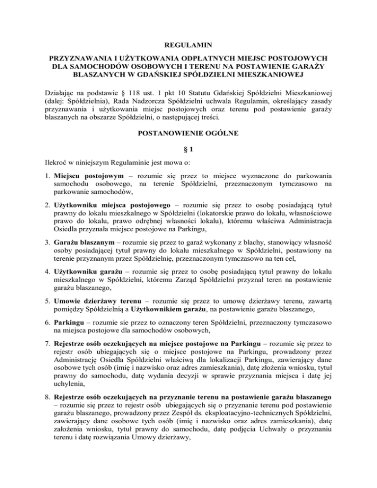 REGULAMIN PRZYZNAWANIA I UŻYTKOWANIA ODPŁATNYCH MIEJSC POSTOJOWYCH DLA SAMOCHODÓW OSOBOWYCH I TERENU NA POSTAWIENIE GARAŻY BLASZANYCH W GDAŃSKIEJ SPÓŁDZIELNI MIESZKANIOWEJ Działając na podstawie § 118 ust. 1 pkt 10 Statutu Gdańskiej Spółdzielni Mieszkaniowej (dalej: Spółdzielnia), Rada Nadzorcza Spółdzielni uchwala Regulamin, określający zasady przyznawania i użytkowania miejsc postojowych oraz terenu pod postawienie garaży blaszanych na obszarze Spółdzielni, o następującej treści. POSTANOWIENIE OGÓLNE §1 Ilekroć w niniejszym Regulaminie jest mowa o: 1. Miejscu postojowym – rozumie się przez to miejsce wyznaczone do parkowania samochodu osobowego, na terenie Spółdzielni, przeznaczonym tymczasowo na parkowanie samochodów, 2. Użytkowniku miejsca postojowego – rozumie się przez to osobę posiadającą tytuł prawny do lokalu mieszkalnego w Spółdzielni (lokatorskie prawo do lokalu, własnościowe prawo do lokalu, prawo odrębnej własności lokalu), któremu właściwa Administracja Osiedla przyznała miejsce postojowe na Parkingu, 3. Garażu blaszanym – rozumie się przez to garaż wykonany z blachy, stanowiący własność osoby posiadającej tytuł prawny do lokalu mieszkalnego w Spółdzielni, postawiony na terenie przyznanym przez Spółdzielnię, przeznaczonym tymczasowo na ten cel, 4. Użytkowniku garażu – rozumie się przez to osobę posiadającą tytuł prawny do lokalu mieszkalnego w Spółdzielni, któremu Zarząd Spółdzielni przyznał teren na postawienie garażu blaszanego, 5. Umowie dzierżawy terenu – rozumie się przez to umowę dzierżawy terenu, zawartą pomiędzy Spółdzielnią a Użytkownikiem garażu, na postawienie garażu blaszanego, 6. Parkingu – rozumie sie przez to oznaczony teren Spółdzielni, przeznaczony tymczasowo na miejsca postojowe dla samochodów osobowych, 7. Rejestrze osób oczekujących na miejsce postojowe na Parkingu – rozumie się przez to rejestr osób ubiegających się o miejsce postojowe na Parkingu, prowadzony przez Administrację Osiedla Spółdzielni właściwą dla lokalizacji Parkingu, zawierający dane osobowe tych osób (imię i nazwisko oraz adres zamieszkania), datę złożenia wniosku, tytuł prawny do samochodu, datę wydania decyzji w sprawie przyznania miejsca i datę jej uchylenia, 8. Rejestrze osób oczekujących na przyznanie terenu na postawienie garażu blaszanego – rozumie się przez to rejestr osób ubiegających się o przyznanie terenu pod postawienie garażu blaszanego, prowadzony przez Zespół ds. eksploatacyjno-technicznych Spółdzielni, zawierający dane osobowe tych osób (imię i nazwisko oraz adres zamieszkania), datę założenia wniosku, tytuł prawny do samochodu, datę podjęcia Uchwały o przyznaniu terenu i datę rozwiązania Umowy dzierżawy, 9. Samochód osobowy – rozumie sie przez to pojazd samochodowy przeznaczony konstrukcyjnie do przewozu nie więcej niż 9 osób łącznie z kierowcą oraz ich bagażu. ZASADY PRZYZNAWANIA MIEJSCA POSTOJOWEGO DLA SAMOCHODU OSOBOWEGO ORAZ TERENU NA POSTAWIENIE GARAŻU BLASZANEGO §2 O przyznanie miejsca postojowego dla samochodu osobowego na Parkingu oraz terenu na postawienie garażu blaszanego, mogą ubiegać się wyłącznie osoby spełniające łącznie podane niżej warunki: a) posiadają tytuł prawny do lokalu mieszkalnego w Spółdzielni (lokatorskie prawo do lokalu, własnościowe prawo do lokalu, prawo odrębnej własności lokalu) i zamieszkują w tym lokalu (dalej: Wnioskodawca), b) posiadają zarejestrowany na swoje nazwisko lub na nazwisko osoby bliskiej (w rozumieniu art. 2 ust. 5 Ustawy o spółdzielniach mieszkaniowych z dnia 15 grudnia 2000r., z późn. zm.) wspólnie zamieszkałej, samochód osobowy lub są współwłaścicielami samochodu osobowego, albo posiadają samochód służbowy lub użytkują samochód na podstawie umowy leasingu zawartej przez Wnioskodawcę albo osobę bliską wspólnie z nim zamieszkałą, c) nie posiadają zaległości wobec Spółdzielni z tytułu opłat za mieszkanie. §3 1. Wniosek o przyznanie miejsca postojowego dla samochodu osobowego na Parkingu oraz terenu na postawienie garażu blaszanego, musi być złożony na piśmie i zawierać: a) imię i nazwisko Wnioskodawcy, b) adres zamieszkania, c) kopię dowodu rejestracyjnego samochodu należącego (w całości lub części) do Wnioskodawcy lub osoby bliskiej zamieszkałej wspólnie z Wnioskodawcą, lub stosownie do okoliczności: d) zaświadczenie pracodawcy o użytkowaniu przez Wnioskodawcę lub osobę bliską, wspólnie z nim zamieszkałą samochodu służbowego, e) zaświadczenie leasingodawcy o umowie leasingu samochodu osobowego zawartej z Wnioskodawcą lub osobą bliską, wspólnie z nim zamieszkałą. 2. Rejestr Wnioskodawców ubiegających się o przyznanie miejsca postojowego na Parkingu, prowadzi właściwa dla lokalizacji Parkingu Administracja Osiedla Spółdzielni. Wzór Rejestru, stanowi Załącznik nr 1 do niniejszego Regulaminu. 3. Rejestr Wnioskodawców ubiegających się o przyznanie terenu na postawienie garażu blaszanego, prowadzi Zespół ds. eksploatacyjno-technicznych Spółdzielni. Wzór Rejestru, stanowi Załącznik nr 2 do Regulaminu. 4. Rejestry wymienione w ust. 2 i 3 winny być prowadzone w formie papierowej, z ponumerowanymi kartkami, w sposób zapewniający wieloletnią rejestrację wniosków wg kolejności zgłoszenia. §4 1. Przydziału miejsca postojowego na Parkingu dokonuje Kierownik Administracji Osiedla właściwej dla lokalizacji Parkingu, zgodnie z kolejnością wynikającą z Rejestru, o którym mowa w § 3 ust. 2 Regulaminu. Przyznania miejsca dokonuje się w formie Decyzji, której wzór stanowi Załącznik nr 3 do niniejszego Regulaminu. 2. Przydzielone miejsce postojowe na Parkingu, nie jest związane z prawem do lokalu mieszkalnego, nie może być przedmiotem podnajmu lub oddania w bezpłatne używanie jakiejkolwiek osobie trzeciej. §5 1. Przyznania terenu pod dzier