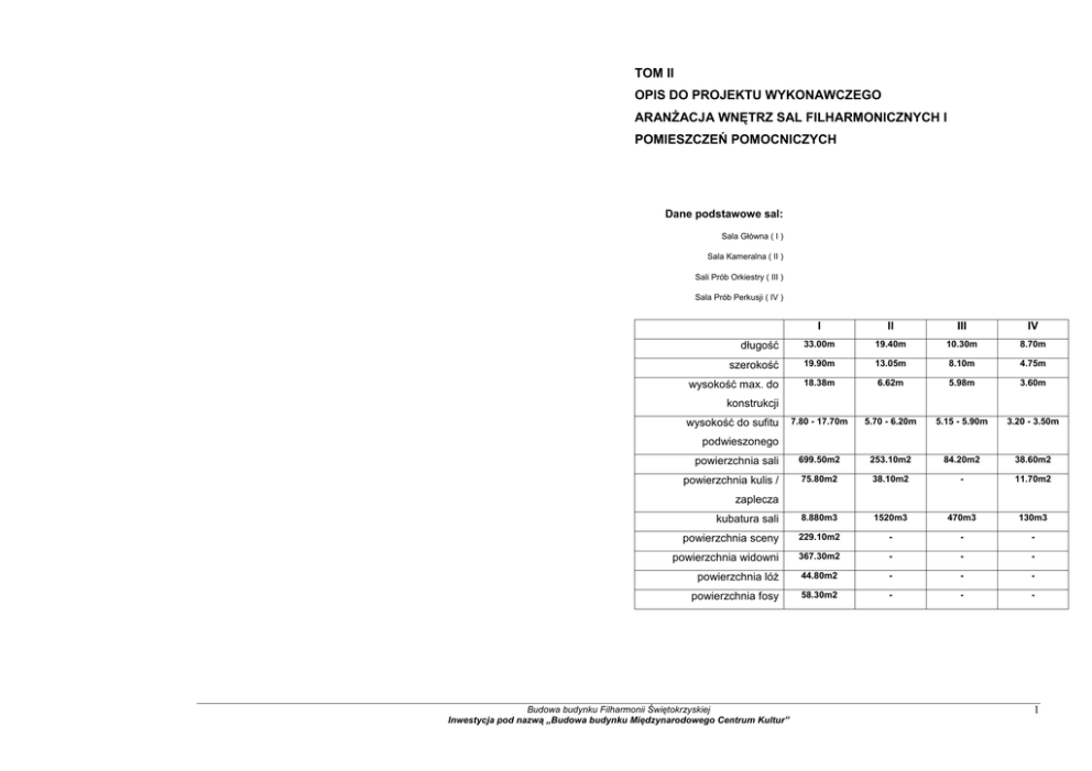 TOM II OPIS DO PROJEKTU WYKONAWCZEGO ARANśACJA WNĘTRZ SAL FILHARMONICZNYCH I POMIESZCZEŃ POMOCNICZYCH Dane podstawowe sal: Sala Główna ( I ) Sala Kameralna ( II ) Sali Prób Orkiestry ( III ) Sala Prób Perkusji ( IV ) I II III IV długość 33.00m 19.40m 10.30m 8.70m szerokość 19.90m 13.05m 8.10m 4.75m wysokość max. do 18.38m 6.62m 5.98m 3.60m 7.80 - 17.70m 5.70 - 6.20m 5.15 - 5.90m 3.20 - 3.50m powierzchnia sali 699.50m2 253.10m2 84.20m2 38.60m2 powierzchnia kulis / 75.80m2 38.10m2 - 11.70m2 kubatura sali 8.880m3 1520m3 470m3 130m3 powierzchnia sceny 229.10m2 - - - powierzchnia widowni 367.30m2 - - - powierzchnia lóŜ 44.80m2 - - - powierzchnia fosy 58.30m2 - - - konstrukcji wysokość do sufitu podwieszonego zaplecza Budowa budynku Filharmonii Świętokrzyskiej Inwestycja pod nazwą „Budowa budynku Międzynarodowego Centrum Kultur” 1 W powierzchni sceny umiejscowiona została zapadnia na fortepian oraz studzienki instalacyjne rozprowadzające instalacje elektryczne i elektroakustyczne po całej jej powierzchni. Przewidziano moŜliwość zlokalizowania demontowalnego podwyŜszenia dla chóru (przy ścianie frontowej estrady) oraz dla orkiestry (w części centralnej), w formie systemowych podestów. TOM II - CZĘŚĆ I OPIS DO PROJEKTU WYKONAWCZEGO Wykończenie ARANśACJA WNĘTRZ SAL FILHARMONICZNYCH Podłoga widowni Sala Główna Podłoga sceny (rezonansowa) wybarwiana klepka dębowa grubości 32mm na korkowyn podkładzie wytłumiającym wybarwiana klepka dębowa grubości 32mm na sklejce z drzew liściastych gr. 22mm, na legarach sosnowych, izolowanych od góry i od dołu przekładkami wytłumiającymi – biała podłoga Koncepcja Sala Główna Filharmonii Świętokrzyskiej została zaprojektowana pod kątem optymalnych warunków dla Ściany odgrywania i odsłuchu koncertów filharmonicznych. Funkcjami dopełniającymi są małe formy sceniczne, kompozycja ustrojów akustycznych o zróŜnicowanej grubości od 15cm do 35cm, wykończonych fornirem, widowiska taneczne i konferencje. Wystrój sali, ukształtowanie akustyczne, oświetlenie, technologia sceny i szczegóły rozwiązań wg projektu akustycznego pozostałe branŜe zostały podporządkowane pod taką hierarchię waŜności. Sufit nad widownią Sala zaprojektowana jest na ok.700 osób. Liczbę tą stanowi 514 miejsc siedzących przeznaczonych dla elementy rozpraszające dźwięk, cięŜka sztablatura gipsowa kasetonowa z otworami na oświetlenie widowni i publiczności oraz ok.200 miejsc dla grupy artystycznej (orkiestra i chór). Sala składa się z następujących stref: odprowadzenie powietrza znad widowni, szczegóły rozwiązań wg projektu akustycznego widownia, scena oraz fosa dla orkiestry odsłaniana na czas małych form scenicznych. Na widownię składa się widownia zasadnicza (486 miejsc) oraz 4 loŜe w formie balkonu (4x7miejsc). Do sali prowadzą 2 wejścia z Sufit nad sceną poziomu +1 (+3.80m) oraz 2 wejścia z poziomu 0 (-0.85m). LoŜe dostępne są z poziomu +2 (+7.20m), gdzie podwieszane ekrany- gruba sklejka liściasta wykończona fornirem, szczegóły rozwiązań wg projektu poziom sceny- 0.00m. akustycznego Rzędy widowni zaprojektowano na odpowiednich poziomach tak, aby zapewnić najlepszą widoczność przy Drzwi wejściowe na widownię maksymalnej liczbie widzów. Fosa dla orkiestry posiada wypełnienie w postaci podestów wypełniających systemowe, dźwiękoszczelne, z ustrojami akustycznymi montowanymi od wewnątrz sali, słuŜące równieŜ jako kubaturę zagłębienia na czas typowych koncertów symfonicznych. Podczas małych form scenicznych wyjście ewakuacyjne z odpowiednimi okuciami typu PANIC, automatycznie zamykane. elementy te są wyjmowane i transportowane do magazynu w podsceniu, a uzyskana przestrzeń udostępniana jest dla orkiestry. Aby zapewnić drogę ewakuacyjną szerokości 1.8m usuwane są 2 przednie rzędy siedzeń, Drzwi wejściowe na scenę oraz montowane podesty ze zintegrowaną barierką, odpowiednio poziomujące podłogę. ściany konstruowane na podstawie systemu drzwiowego wielkoformatowego o wysokości 380cm słuŜące do zmiany aranŜacji sceny. Drzwi wykonane są jako przesuwne, bezprogowe. Do ściany przymocowane są Scena uniesiona jest na wysokość 0.85m względem podłogi pierwszego rzędu. Jest to kompromis miedzy ustroje akustyczne wg wytycznych projektu akustycznego, fornirowane. Ściana zawiera skrzydła drzwiowe 2x dobrą widocznością z widowni, a potrzebą umieszczenia w fosie składu orkiestry w przypadku jej uŜytkowania. 100x255cm. Po rozsunięciu elementy parkowane są na ścianie od strony kulis. Drzwi znajdują się po obu Z poziomu widowni na scenę prowadzą schody o szerokości ok.1.1m usytuowane po obu jej stronach. stronach wejścia na scenę. Do zmiany aranŜacji sceny słuŜą 2 ruchome skrzydła ścian bocznych o wys. 3.8m umieszczone po obu jej stronach. UmoŜliwiają one zmniejszenie powierzchni sceny (np. dla koncertowych form kameralnych) i uzyskanie optymalnych właściwości akustycznych. Budowa budynku Filharmonii Świętokrzyskiej Inwestycja pod nazwą „Budowa budynku Międzynarodowego Centrum Kultur” 2 Akustyka Sali WyposaŜenie Sali ZałoŜeniem projektowym jest jak najlepsze i równomierne rozprowadzenie dźwięku na widowni ze źródeł Fotele Dla widowni zasadniczej przyjęto rozstaw foteli 54cm w osiach i 96 cm między rzędami. Fotele w loŜach – 62 cm szerokości w osiach i 96cm rozstawu między rzędami. Konstrukcja foteli oparta na szkielecie stalowym. Warstwę dekoracyjną kształtek sklejkowych stanowią forniry ze szlachetnych gatunków drzew – klon lub inne jasne drewno. Część miękką fotela stanowią poduchy siedziska i oparcia, wykonane z materiałów gąbczastych odpowiedniej twardości, pokrytych materiałem tapicerskim o wysokich parametrach trwałości i wysokich walorach estetycznych. zlokalizowanych na estradzie i w orkiestronie, oraz wzajemna słyszalność muzyków na scenie. System ten