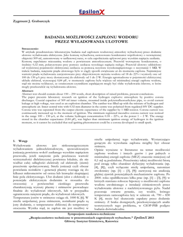 Zygmunt J. Grabarczyk BADANIA MOŻLIWOŚCI ZAPŁONU WODORU PRZEZ WYŁADOWANIA ULOTOWE Streszczenie: W artykule przedstawiono laboratoryjne badania nad zapłonem wodorowej atmosfery wybuchowej przez dodatnie ulotowe wyładowania elektryczne. Jako komorę wybuchową zastosowano kondensator współosiowy o wewnętrznej objętości 509 ml, zamontowany w tarflenowej rurze, w celu zapobieżenia upływowi przy wysokim napięciu zasilania. Komorę napełniano mieszaniną wodoru z powietrzem atmosferycznym. Przewód wewnętrzny kondensatora, o średnicy 0,32 mm, polaryzowano przy pomocy zasilacza wysokiego napięcia stałego. Przewód ulotowy oddzielono od wyjściowej pojemności elektrycznej zasilacza za pomocą rezystora wysokonapięciowego o rezystancji 1 MΩ. W trakcie badania, natężenie prądu ulotowego było w ciągły sposób zwiększane aż do momentu zapłonu. Najmniejsze wartości prądu wyładowania zarejestrowano przy objętościowym stężeniu wodoru od 18 do 22% i wyniosły one od 100 do 130 µA przy mocy dostarczonej do elektrody od 1 do 2 W. Energia zgromadzona w pojemności elektrycznej układu elektrod, wynoszącej 0,84 pF, w momencie zapłonu była większa od minimalnej energii zapłonu wodoru, stąd nie można wykluczyć, ze ostatecznym czynnikiem zapalającym mogły być słabe wyładowania iskrowe, w które mogły przekształcić się wyładowania ulotowe. Abstract: Abstract text should contain about 150 – 250 words, short description of raised problems, present conclusions. The paper presents laboratory research on ignition of the hydrogen explosive atmosphere by positive corona discharges. Coaxial capacitor of 509 ml inner volume, mounted inside polytetrafluoroethylene pipe, to avoid current leakage at high voltage, was used as an explosion chamber. The camber was filled up with the mixture of hydrogen and atmospheric air. Inner central wire with 0.32 mm diameter in the centre was polarised from regulated HV DC supplier. Corona wire was separated from the output electric capacitance of the supplier by 1 MΩ resistor. Corona current was continuously increased up to the moment of ignition. The minimum registered incendive corona current was noticed in the range 100 – 130 µA, at the volume hydrogen concentration 0.18 – 22%, at the power 1 – 2 W. The energy stored in the chamber capacitance (0.84 pF), was higher than minimum ignition energy of hydrogen in the ignition moment, so it cannot be excluded that real igniting phenomenon could be a corona developed to small spark. ———————————— 1. Wstęp Wyładowanie ulotowe jest niskoenergetycznym wyładowaniem jednoelektrodowym, spowodowanym jonizacją powietrza wokół zasilanego wysokim napięciem przewodu, jeżeli natężenie pola przekracza wartość wytrzymałości dielektrycznej powietrza lokalnie, ale nie wzdłuż całej odległości elektrody od elektrody (ziemi) przeciwnie spolaryzowanej. Strefa jonizacji czyli obszar powielania nośników i generacji plazmy rozciąga się do kilkuset mikrometrów od ostrza lub krawędzi skupiającej linie pola elektrycznego. Ulot dodatni (ulot z elektrody o potencjale elektrycznym dodatnim w stosunku do otoczenia) z powierzchni cienkiego przewodu charakteryzują wyrzuty plazmy i strimerów prowadzące finalnie do wyładowań iskrowych, lub w przypadku ograniczenia natężeni prądu, do wyładowań iskrowych. Temperatura jonów w strimerze osiąga ok. 1000 K [6]. W strefie unipolarnej, poza strimerem, nośnikami prądu są jony dodatnie, o temperaturze zbliżonej do temperatury otoczenia. Wynika stąd, że zapłon nie jest możliwy w strefie unipolarnej tego wyładowania. Wystarczająco gorącym do wywołania zapłonu mógłby być obszar strimera. Opinie wyrażane w literaturze na temat możliwości zapłonu wodoru i innych gazów i par palnych o minimalnej energii zapłonu (MEZ) znacznie mniejszej od 0,1 mJ są podzielone. Przeciwnicy takiej możliwości biorą pod uwagę tylko charakter dyfuzyjny wyładowania (np. [4], [8]), czyli wyłącznie strefę unipolarną, natomiast zwolennicy (np. [1] – [3], [9]) zazwyczaj nie analizują głębiej zjawisk potencjalnych mechanizmów zapłonu. Po 2000. roku opublikowano kilka prac (np. [1] – [3], [9]) w których stawiano robocze hipotezy o możliwości zapłonu wodoru uwolnionego z instalacji ciśnieniowych przez wyładowania ulotowe z naelektryzowanego pyłu. Nadal pozostaje otwarte pytanie, czy wodór, którego temperatura samozapłonu leży w zakresie ok. 790 – 830 K [4], może być skutecznie zapalany przez dodatnie strimery. Z braku dostępnych, przekonywujących analiz teoretycznych tego problemu, w CIOP-PIB podjęto badania doświadczalne. Sympozjum naukowo-techniczne „Bezpieczeństwo techniczne w przestrzeniach zagrożonych wybuchem.” EpsilonX 2013 Główny Instytut Górnictwa, Katowice 2. Metoda badań Stanowisko badawcze składało się z: − komory wybuchowej własnej konstrukcji (por. rys. 1), − zasilacza FC60R2-220 (Glassman High Voltage, Inc., USA), stałego wysokiego stałego napięcia o zakresie napięciowym 1 – 60 kV (rozdzielczość 100V) i zakresie prądowym 0 - 2 mA (rozdzielczość 10 µA), − cyfrowych regulatorów przepływu ERG050 and ERG200, (Beta-Erg Sp. z o.o., Polska) o maksymalnej prędkości przepływu odpowiednio 50 i 200 ml/min, − źródło suchego powietrza i wodoru – butle ciśnieniowe o pojemności 10 l/100 barów. − mieszanie powietrza z wodorem w trójniku na wyjściu regulatorów. W celu przeprowadzenia badań, wykonano komorę wybuchową o pojemności 509 ml, pokazaną na rys. 1. Komora składa się ze współosiowego kondensatora o wewnętrznej średnicy przewodu cylindrycznego 73 mm, długości 100 mm i średnicy wolframowego przewodu ulotowego – 0,32 mm. Pojemność własna kondensatora wynosiła 0,84 pF. Kondensator umieszczony jest w komorze tarflonowej zamkniętej szczelnie od dołu oraz przykrytej od góry ruchomą pokrywą unosząca się w czas