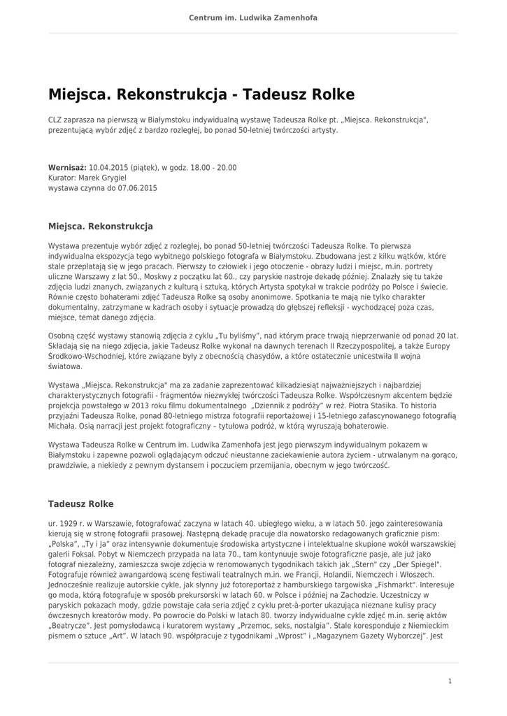 Centrum im. Ludwika Zamenhofa Miejsca. Rekonstrukcja - Tadeusz Rolke CLZ zaprasza na pierwszą w Białymstoku indywidualną wystawę Tadeusza Rolke pt. „Miejsca. Rekonstrukcja", prezentującą wybór zdjęć z bardzo rozległej, bo ponad 50-letniej twórczości artysty. Wernisaż: 10.04.2015 (piątek), w godz. 18.00 - 20.00 Kurator: Marek Grygiel wystawa czynna do 07.06.2015 Miejsca. Rekonstrukcja Wystawa prezentuje wybór zdjęć z rozległej, bo ponad 50-letniej twórczości Tadeusza Rolke. To pierwsza indywidualna ekspozycja tego wybitnego polskiego fotografa w Białymstoku. Zbudowana jest z kilku wątków, które stale przeplatają się w jego pracach. Pierwszy to człowiek i jego otoczenie - obrazy ludzi i miejsc, m.in. portrety uliczne Warszawy z lat 50., Moskwy z początku lat 60., czy paryskie nastroje dekadę później. Znalazły się tu także zdjęcia ludzi znanych, związanych z kulturą i sztuką, których Artysta spotykał w trakcie podróży po Polsce i świecie. Równie często bohaterami zdjęć Tadeusza Rolke są osoby anonimowe. Spotkania te mają nie tylko charakter dokumentalny, zatrzymane w kadrach osoby i sytuacje prowadzą do głębszej refleksji - wychodzącej poza czas, miejsce, temat danego zdjęcia. Osobną część wystawy stanowią zdjęcia z cyklu „Tu byliśmy”, nad którym prace trwają nieprzerwanie od ponad 20 lat. Składają się na niego zdjęcia, jakie Tadeusz Rolke wykonał na dawnych terenach II Rzeczypospolitej, a także Europy Środkowo-Wschodniej, które związane były z obecnością chasydów, a które ostatecznie unicestwiła II wojna światowa. Wystawa „Miejsca. Rekonstrukcja" ma za zadanie zaprezentować kilkadziesiąt najważniejszych i najbardziej charakterystycznych fotografii - fragmentów niezwykłej twórczości Tadeusza Rolke. Współczesnym akcentem będzie projekcja powstałego w 2013 roku filmu dokumentalnego „Dziennik z podróży” w reż. Piotra Stasika. To historia przyjaźni Tadeusza Rolke, ponad 80-letniego mistrza fotografii reportażowej i 15-letniego zafascynowanego fotografią Michała. Osią narracji jest projekt fotograficzny – tytułowa podróż, w którą wyruszają bohaterowie. Wystawa Tadeusza Rolke w Centrum im. Ludwika Zamenhofa jest jego pierwszym indywidualnym pokazem w Białymstoku i zapewne pozwoli oglądającym odczuć nieustanne zaciekawienie autora życiem - utrwalanym na gorąco, prawdziwie, a niekiedy z pewnym dystansem i poczuciem przemijania, obecnym w jego twórczość. Tadeusz Rolke ur. 1929 r. w Warszawie, fotografować zaczyna w latach 40. ubiegłego wieku, a w latach 50. jego zainteresowania kierują się w stronę fotografii prasowej. Następną dekadę pracuje dla nowatorsko redagowanych graficznie pism: „Polska”, „Ty i Ja” oraz intensywnie dokumentuje środowiska artystyczne i intelektualne skupione wokół warszawskiej galerii Foksal. Pobyt w Niemczech przypada na lata 70., tam kontynuuje swoje fotograficzne pasje, ale już jako fotograf niezależny, zamieszcza swoje zdjęcia w renomowanych tygodnikach takich jak „Stern" czy „Der Spiegel". Fotografuje również awangardową scenę festiwali teatralnych m.in. we Francji, Holandii, Niemczech i Włoszech. Jednocześnie realizuje autorskie cykle, jak słynny już fotoreportaż z hamburskiego targowiska „Fishmarkt". Interesuje go moda, którą fotografuje w sposób prekursorski w latach 60. w Polsce i później na Zachodzie. Uczestniczy w paryskich pokazach mody, gdzie powstaje cała seria zdjęć z cyklu pret-à-porter ukazująca nieznane kulisy pracy ówczesnych kreatorów mody. Po powrocie do Polski w latach 80. tworzy indywidualne cykle zdjęć m.in. serię aktów „Beatrycze”. Jest pomysłodawcą i kuratorem wystawy „Przemoc, seks, nostalgia”. Stale koresponduje z Niemieckim pismem o sztuce „Art”. W latach 90. współpracuje z tygodnikami „Wprost” i „Magazynem Gazety Wyborczej”. Jest 1 Centrum im. Ludwika Zamenhofa wieloletnim członkiem Związku Polskich Artystów Fotografików, jurorem wielu konkursów fotograficznych, wykładowcą w Warszawskiej Szkole Fotografii i na Wydziale Dziennikarstwa Uniwersytetu Warszawskiego. W 2009 roku odbywa się jego największa jak do tej pory wystawa pt. „Wszystko jest fotografią” w Centrum Sztuki Współczesnej w Warszawie. W 2009 roku zostaje uhonorowany medalem Zasłużony Kulturze Gloria Artis. Fotografie Tadeusza Rolke pokazywano na licznych wystawach w kraju i za granicą oraz publikowano w poświęconych artyście albumach. W ostatnich latach ukazały się: „Tadeusz Rolke. Fotografie 1944-2005" (2006), „Kobieta to..." (2008) oraz „Tu byliśmy. Ostatnie ślady zaginionej kultury" (2008). Partnerzy: 2