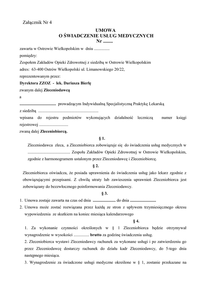 Załącznik Nr 4 UMOWA O ŚWIADCZENIE USŁUG MEDYCZNYCH Nr ........ zawarta w Ostrowie Wielkopolskim w dniu ............... pomiędzy: Zespołem Zakładów Opieki Zdrowotnej z siedzibą w Ostrowie Wielkopolskim adres: 63-400 Ostrów Wielkopolski ul. Limanowskiego 20/22, reprezentowanym przez: Dyrektora ZZOZ - lek. Dariusza Bierłę zwanym dalej Zleceniodawcą a ................................... prowadzącym Indywidualną Specjalistyczną Praktykę Lekarską z siedzibą .......................................................... wpisana do rejestru podmiotów wykonujących działalność leczniczą numer księgi rejestrowej ............................ zwaną dalej Zleceniobiorcą. § 1. Zleceniodawca zleca, a Zleceniobiorca zobowiązuje się do świadczenia usług medycznych w ......................................... Zespołu Zakładów Opieki Zdrowotnej w Ostrowie Wielkopolskim, zgodnie z harmonogramem ustalonym przez Zleceniodawcę i Zleceniobiorcę. § 2. Zleceniobiorca oświadcza, że posiada uprawnienia do świadczenia usług jako lekarz zgodnie z obowiązującymi przepisami. Z chwilą utraty lub zawieszenia uprawnień Zleceniobiorca jest zobowiązany do bezzwłocznego poinformowania Zleceniodawcy. § 3. 1. Umowa zostaje zawarta na czas od dnia ...................... do dnia ......................... 2. Umowa może zostać rozwiązana przez każdą ze stron z upływem trzymiesięcznego okresu wypowiedzenia ze skutkiem na koniec miesiąca kalendarzowego § 4. 1. Za wykonanie czynności określonych w § 1 Zleceniobiorca będzie otrzymywał wynagrodzenie w wysokości ............... brutto za godzinę świadczenia usług. 2. Zleceniobiorca wystawi Zleceniodawcy rachunek za wykonane usługi i po zatwierdzeniu go przez Zleceniodawcę dostarczy rachunek do działu kadr Zleceniodawcy, do 5-tego dnia następnego miesiąca. 3. Wynagrodzenie za świadczone usługi medyczne określone w § 1, zostanie przekazane na rachunek bankowy wskazany przez Zleceniobiorcę w terminie do 15-tego następnego miesiąca. 4. Warunkiem wypłaty wynagrodzenia jest zatwierdzenie wykonania usługi przez Zleceniodawcę. § 5. 1. Zleceniobiorca w związku z realizacją niniejszej umowy zobowiązany jest do: 1) przestrzegania praw pacjenta określonych w obowiązujących przepisach; 2) prowadzenie dokumentacji medycznej zgodnie z obowiazującymi przepisami prawa ; 3) poddaniu się kontroli wykonywanych usług i ich jakości u Zleceniodawcy; 4) do przestrzegania obowiązujących zasad Systemu Jakości u Zleceniodawcy; 5) ponoszenia kosztów szkoleń z zakresu BHP, badań lekarskich wymaganych zgodnie z obowiązującymi przepisami; 6) ponoszenia kosztów odzieży roboczej; 7) wykonywania umowy z należytą starannością przy wykorzystaniu najlepszej wiedzy medycznej i nabytych kwalifikacji; 8) dbałości o powierzony sprzęt medyczny i wykorzystania powierzonyego sprzętu tylko do realizacji zadań objętych niniejszą umową; 9) świadczenia usług medycznych wskazanych w § 1 umowy zgodnie z harmonogramami ustalonymi przez Zleceniodawcę; 10) potwierdzania rozpoczęcia i zakończenia świadczenia usług medycznych określonych w § 1 umowy w sposób wskazany i obowiązujący u Zleceniodawcy. 2. W przypadku niemożliwości osobistego świadczenia z innych przyczyn niż określone w ust 3, Zleceniobiorca zapewnia we własnym zakresie zastępstwo innego lekarza z oddziału o kwalifikacjach nie niższych niż swoje przy koniecznej akceptacji Zleceniodawcy. 3. Niemożność świadczenia usług z powodu choroby Zleceniobiorca usprawiedliwia przedkładając Zleceniodawcy kopię stosownego zaświadczenia lekarskiego. 4. Zleceniobiorca może powierzyć wykonanie czynności wynikających z niniejszej umowy osobie trzeciej, tylko za zgodą Zleceniodawcy. § 6. 1. W związku z realizacją niniejszej umowy Zleceniodawca zobowiązuje się do zapewnienia Zleceniobiorcy: 1) aparatury i sprzętu medycznego 2) leków i materiałów opatrunkowych 3) pomieszczeń niezbędnych do realizacji umowy. 4) udostępnienia Zleceniobiorcy dokumentacji medycznej związanej z wykonywaniem przez niego niniejszej umowy. § 7. 1. Zleceniobiorca i Zleceniodawca ponoszą solidarną odpowiedzialność za szkody wyrządzone osobom trzecim wynikłe z niewykonania lub nienależytego wykonania niniejszej umowy. 2. Zleceniobiorca zobowiązany jest do ubezpieczenia się od odpowiedzialności cywilnej, zgodnie z rozporządzeniem Ministra Finansów z dnia 22 grudnia 2011 r. w sprawie obowiązkowego ubezpieczenia odpowiedzialności cywilnej podmiotu wykonującego działalność leczniczą (Dz.U. Nr 293 poz. 1729) oraz do kontynuowania ubezpieczenia w trakcie trwania niniejszej umowy i przedstawiania Zleceniodawcy aktualnego dowodu ubezpieczenia. § 8. 1.Zleceniobiorcy przysługuje ......... dni wolnych od świadczenia usług w okresie roku kalendarzowego, za które przysługuje Zleceniobiorcy wynagrodzenie. 2.Zleceniobiorcy przysługuje ........ dni wolnych od świadczenia usług w okresie roku kalendarzowego, związanych z doskonaleniem zawodowym, za które przysługuje Zleceniobiorcy wynagrodzenie. 3. Strony ustalaja , że dzien wolny od świadczenia usług o, którym mowa w ust. 1 i 2 odpowiada ........... godz. 4.Niewykorzystane dni wolne od świadczenia usług, określone w ust. 1 i 2, nie przechodzą na następne okresy. 5.Po rozwiązaniu lub wygaśnięciu umowy, Zleceniobiorcy nie przysługują roszczenia z tytułu niewykorzystania dni wolnych od świadczenia usług. § 9. 1. Za naruszenie § 5 ust. 1 pkt 9, Zleceniobiorca zapłaci Zleceniodawcy kary umowne w wysokości iloczynu dwukrotności stawki określonej w § 4 ust. 1 i ilości godzin w których Zleceniobiorca nie świadczył usług medycznych zgodnie z harmonogramem. 2. Za naruszenie § 5 ust. 1 pkt 10, Zleceniobiorca zapłaci Zleceniodawcy kary umowne w wysokości iloczynu dwukrotności stawki określonej w § 4 ust. 1 i ilości niepotwierdzonych godzin zgodnie z § 5 ust. 1 pkt 10. 3. W przy