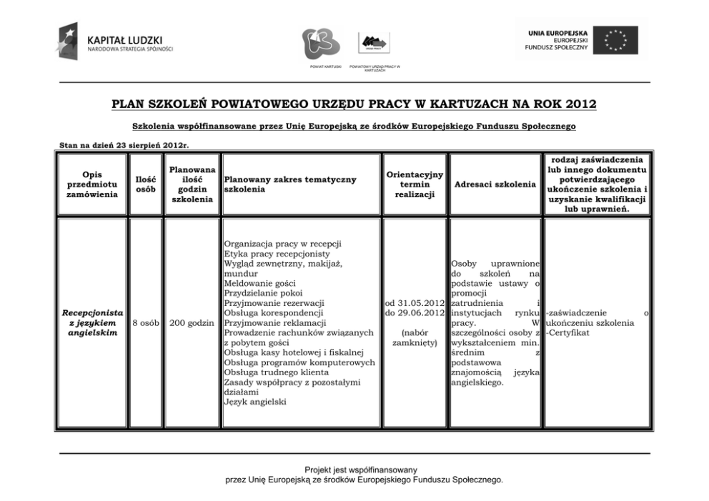 POWIAT KARTUSKI POWIATOWY URZĄD PRACY W KARTUZACH PLAN SZKOLEŃ POWIATOWEGO URZĘDU PRACY W KARTUZACH NA ROK 2012 Szkolenia współfinansowane przez Unię Europejską ze środków Europejskiego Funduszu Społecznego Stan na dzień 23 sierpień 2012r. Opis przedmiotu zamówienia Recepcjonista z językiem angielskim Ilość osób 8 osób rodzaj zaświadczenia lub innego dokumentu potwierdzającego ukończenie szkolenia i uzyskanie kwalifikacji lub uprawnień. Planowana ilość godzin szkolenia Planowany zakres tematyczny szkolenia Orientacyjny termin realizacji 200 godzin Organizacja pracy w recepcji Etyka pracy recepcjonisty Wygląd zewnętrzny, makijaż, mundur Meldowanie gości Przydzielanie pokoi Przyjmowanie rezerwacji Obsługa korespondencji Przyjmowanie reklamacji Prowadzenie rachunków związanych z pobytem gości Obsługa kasy hotelowej i fiskalnej Obsługa programów komputerowych Obsługa trudnego klienta Zasady współpracy z pozostałymi działami Język angielski Osoby uprawnione do szkoleń na podstawie ustawy o promocji od 31.05.2012 zatrudnienia i do 29.06.2012 instytucjach rynku -zaświadczenie pracy. W ukończeniu szkolenia (nabór szczególności osoby z -Certyfikat zamknięty) wykształceniem min. średnim z podstawowa znajomością języka angielskiego. Adresaci szkolenia Projekt jest współfinansowany przez Unię Europejską ze środków Europejskiego Funduszu Społecznego. o POWIAT KARTUSKI Kadry i Płace z obsługą programu Symfonia i Płatnik Opiekunka dziecięca z językiem kaszubskim 10 osób 5 osób 150 godz. POWIATOWY URZĄD PRACY W KARTUZACH Obsługa programu MS WORD, MS EXCEL, Internet, poczta elektroniczna – wyrównanie poziomów Prawo pracy Rodzaje wynagrodzeń oraz wymiary czasu pracy Urlopy Obsługa dokumentacji kadrowej i płacowej Ubezpieczenia społeczne Płace Podatki i ich rodzaje Podatek VAT Podatkowa księga przychodów i rozchodów Ewidencjonowanie przychodów Ewidencjonowanie kosztów uzyskania przychodów Obsługa komputerowego programu Symfonia i Płatnik Osoby uprawnione do szkoleń na podstawie ustawy o od 01.06.2012 promocji do 28.06.2012 -zaświadczenie zatrudnienia i o ukończeniu szkolenia instytucjach rynku (nabór -Certyfikat pracy. W zamknięty) szczególności osoby z wykształceniem ekonomicznym. Program szkolenia dla opiekuna Osoby uprawnione dziennego zgodny z rozporządzeniem do szkoleń na Ministra Pracy i Polityki Społecznej z od 23.05.2012 podstawie ustawy o dnia 25 marca 2011 r. w sprawie do 29.06.2012 promocji -zaświadczenie 160 godz. zatrudnienia i o ukończeniu szkolenia zakresu programów szkoleń dla + 100 godz. opiekuna w żłobku lub klubie instytucjach rynku -Certyfikat (nabór dziecięcym, wolontariusza oraz zamknięty) pracy. W dziennego opiekuna (Dz. U. Nr 69, szczególności osoby z poz. 368) wzbogacony o 100 godz. wykształceniem Projekt jest współfinansowany przez Unię Europejską ze środków Europejskiego Funduszu Społecznego. POWIAT KARTUSKI Kurs spawania blach i rur ze stali nierdzewnej spoinami pachwinowym i i czołowymi metodą TIG (141) Profesjonalne przygotowani e pizzy POWIATOWY URZĄD PRACY W KARTUZACH zajęć z zakresu jez. kaszubskiego. pedagogicznym. 5 osób 200 godz. Wiadomości ogólne z zakresu spawania Materiałoznawstwo i technologia metali Metody łączenia metali Rysunek techniczny Podstawy elektrotechniki Maszyny i urządzenia do spawania Od metodą TIG, budowa i działanie 23.07.2012 do urządzeń 28.08.2012 Metalurgia spawania Przygotowanie materiałów do (nabór spawania zamknięty) Techniki wykonywania spoin podczas spawania Zajęcia praktyczne z zakresu spawania Spawanie w pozycji pionowej i podolnej Egzamin zewnętrzny teoretyczny i praktyczny Osoby uprawnione do szkoleń na podstawie ustawy o promocji zatrudnienia i instytucjach rynku pracy. W szczególności osoby z zawodem ślusarza oraz pracownicy gospodarczy. 5 osób omówienie technologiczne składników, klasyfikacja mąk, omówienie GLUTENU i Enzymów, omówienie przepisu na podstawowe ciasto włoskie omówienie fermentacji i dojrzewania ciasta omówienie procesu wyrobu ciasta omówienie temperatury ciasta i otoczenia praktyczne wyrabianie ciasta metodą maszynową lub ręczną 60 godzin -zaświadczenie ukończeniu szkolenia -Certyfikat -książeczka spawacza Osoby uprawnione do szkoleń na Od podstawie ustawy o 02.08.2012 do promocji -zaświadczenie 14.08.2012 zatrudnienia i o ukończeniu szkolenia instytucjach rynku -Certyfikat pracy. W (nabór szczególności osoby z zamknięty) wykształceniem w zawodzie: kucharz. Projekt jest współfinansowany przez Unię Europejską ze środków Europejskiego Funduszu Społecznego. o POWIAT KARTUSKI POWIATOWY URZĄD PRACY W KARTUZACH wyrabianie i formowanie porcji ciasta "palline" formowanie placka, tylko ręcznie, 2 metody omówienie piekarników: elektryczny i opalany drewnem wypiek samego placka w piekarniku elektrycznym i opalanym drewnem przygotowanie sosu do pizzy i omówienie dodatków wypiek klasycznej pizzy włoskiej w piekarniku elektrycznym i opalanym drewnem omówienie i praktyczne wyrabianie ciasta FOCACCIA omówienie i praktyczne wyrabianie specjalnego ciasta pizza NAPOLITAŃSKA omówienie i praktyczne wyrabianie specjalnego ciasta FOCACCIA omówienie i praktyczne wyrabianie pizzy CALZONE próby akrobatyczne z plackiem przygotowanie własnej pizzy Uprawnienia energetyczne w zakresie Eksploatacji i Dozoru 6 osób 80 godzin przepisy ogólne i wybrane zagadnienia, Od - obowiązki osób na stanowisku 01.08.2012 do elektryka E, 14.08.2012 - organizacja pracy przy urządzeniach elektroenergetycznych G1, (nabór - ochrona od porażeń w sieci do 1kV i zamknięty) wzwyż, - układy sieciowe, Osoby uprawnione do szkoleń na podstawie ustawy o promocji zatrudnienia i instytucjach rynku pracy. W szczególności osoby z zawodem elektryka. Projekt jest współfinansowany przez Unię Europejską ze środków Europejskiego Funduszu Społecznego. -zaświadczenie oukończeniu sz