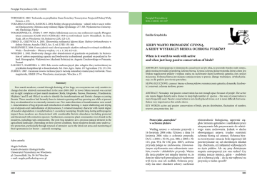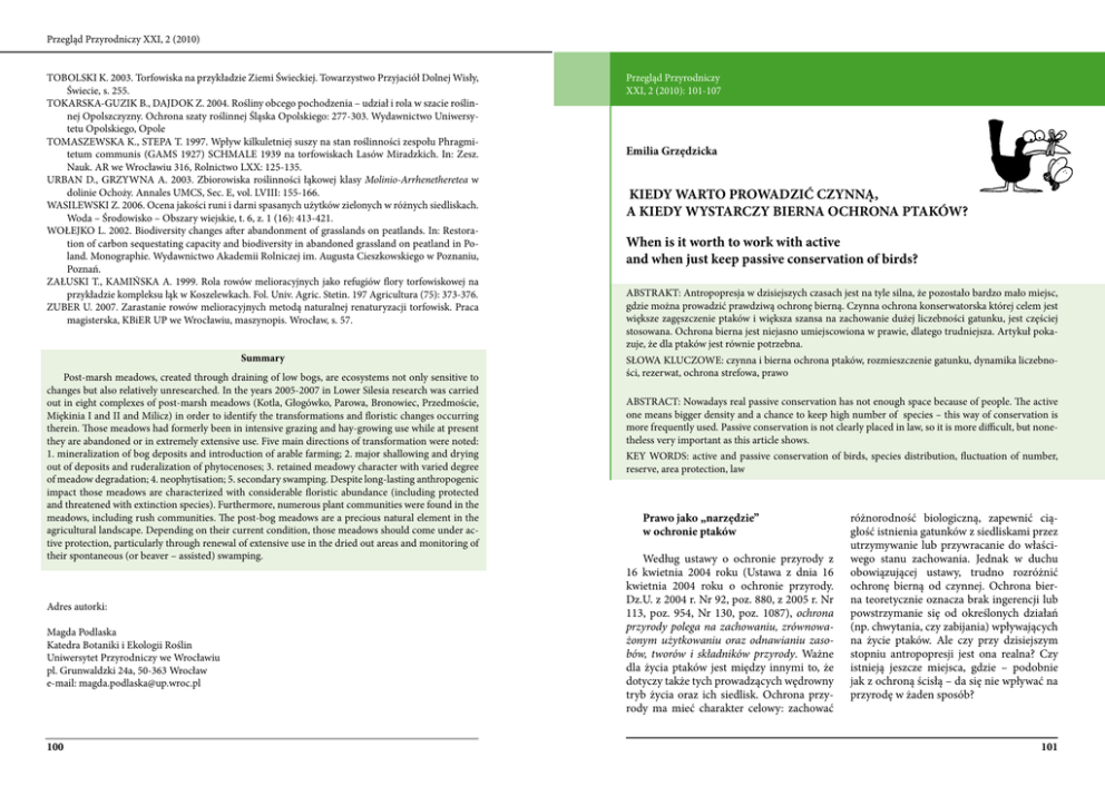 Przegląd Przyrodniczy XXI, 2 (2010) TOBOLSKI K. 2003. Torfowiska na przykładzie Ziemi Świeckiej. Towarzystwo Przyjaciół Dolnej Wisły, Świecie, s. 255. TOKARSKA-GUZIK B., DAJDOK Z. 2004. Rośliny obcego pochodzenia – udział i rola w szacie roślinnej Opolszczyzny. Ochrona szaty roślinnej Śląska Opolskiego: 277-303. Wydawnictwo Uniwersytetu Opolskiego, Opole TOMASZEWSKA K., STEPA T. 1997. Wpływ kilkuletniej suszy na stan roślinności zespołu Phragmitetum communis (GAMS 1927) SCHMALE 1939 na torfowiskach Lasów Miradzkich. In: Zesz. Nauk. AR we Wrocławiu 316, Rolnictwo LXX: 125-135. URBAN D., GRZYWNA A. 2003. Zbiorowiska roślinności łąkowej klasy Molinio-Arrhenetheretea w dolinie Ochoży. Annales UMCS, Sec. E, vol. LVIII: 155-166. WASILEWSKI Z. 2006. Ocena jakości runi i darni spasanych użytków zielonych w różnych siedliskach. Woda – Środowisko – Obszary wiejskie, t. 6, z. 1 (16): 413-421. WOŁEJKO L. 2002. Biodiversity changes after abandonment of grasslands on peatlands. In: Restoration of carbon sequestating capacity and biodiversity in abandoned grassland on peatland in Poland. Monographie. Wydawnictwo Akademii Rolniczej im. Augusta Cieszkowskiego w Poznaniu, Poznań. ZAŁUSKI T., KAMIŃSKA A. 1999. Rola rowów melioracyjnych jako refugiów flory torfowiskowej na przykładzie kompleksu łąk w Koszelewkach. Fol. Univ. Agric. Stetin. 197 Agricultura (75): 373-376. ZUBER U. 2007. Zarastanie rowów melioracyjnych metodą naturalnej renaturyzacji torfowisk. Praca magisterska, KBiER UP we Wrocławiu, maszynopis. Wrocław, s. 57. Summary Post-marsh meadows, created through draining of low bogs, are ecosystems not only sensitive to changes but also relatively unresearched. In the years 2005-2007 in Lower Silesia research was carried out in eight complexes of post-marsh meadows (Kotla, Głogówko, Parowa, Bronowiec, Przedmoście, Miękinia I and II and Milicz) in order to identify the transformations and floristic changes occurring therein. Those meadows had formerly been in intensive grazing and hay-growing use while at present they are abandoned or in extremely extensive use. Five main directions of transformation were noted: 1. mineralization of bog deposits and introduction of arable farming; 2. major shallowing and drying out of deposits and ruderalization of phytocenoses; 3. retained meadowy character with varied degree of meadow degradation; 4. neophytisation; 5. secondary swamping. Despite long-lasting anthropogenic impact those meadows are characterized with considerable floristic abundance (including protected and threatened with extinction species). Furthermore, numerous plant communities were found in the meadows, including rush communities. The post-bog meadows are a precious natural element in the agricultural landscape. Depending on their current condition, those meadows should come under active protection, particularly through renewal of extensive use in the dried out areas and monitoring of their spontaneous (or beaver – assisted) swamping. Adres autorki: Magda Podlaska Katedra Botaniki i Ekologii Roślin Uniwersytet Przyrodniczy we Wrocławiu pl. Grunwaldzki 24a, 50-363 Wrocław e-mail: [email protected] 100 Przegląd Przyrodniczy XXI, 2 (2010): 101-107 Przegląd Przyrodniczy XXI, 1 (2010): Emilia Grzędzicka KIEDY WARTO PROWADZIĆ CZYNNĄ, A KIEDY WYSTARCZY BIERNA OCHRONA PTAKÓW? When is it worth to work with active and when just keep passive conservation of birds? ABSTRAKT: Antropopresja w dzisiejszych czasach jest na tyle silna, że pozostało bardzo mało miejsc, gdzie można prowadzić prawdziwą ochronę bierną. Czynna ochrona konserwatorska której celem jest większe zagęszczenie ptaków i większa szansa na zachowanie dużej liczebności gatunku, jest częściej stosowana. Ochrona bierna jest niejasno umiejscowiona w prawie, dlatego trudniejsza. Artykuł pokazuje, że dla ptaków jest równie potrzebna. SŁOWA KLUCZOWE: czynna i bierna ochrona ptaków, rozmieszczenie gatunku, dynamika liczebności, rezerwat, ochrona strefowa, prawo ABSTRACT: Nowadays real passive conservation has not enough space because of people. The active one means bigger density and a chance to keep high number of species – this way of conservation is more frequently used. Passive conservation is not clearly placed in law, so it is more difficult, but nonetheless very important as this article shows. KEY WORDS: active and passive conservation of birds, species distribution, fluctuation of number, reserve, area protection, law Prawo jako „narzędzie” w ochronie ptaków Według ustawy o ochronie przyrody z 16 kwietnia 2004 roku (Ustawa z dnia 16 kwietnia 2004 roku o ochronie przyrody. Dz.U. z 2004 r. Nr 92, poz. 880, z 2005 r. Nr 113, poz. 954, Nr 130, poz. 1087), ochrona przyrody polega na zachowaniu, zrównoważonym użytkowaniu oraz odnawianiu zasobów, tworów i składników przyrody. Ważne dla życia ptaków jest między innymi to, że dotyczy także tych prowadzących wędrowny tryb życia oraz ich siedlisk. Ochrona przyrody ma mieć charakter celowy: zachować różnorodność biologiczną, zapewnić ciągłość istnienia gatunków z siedliskami przez utrzymywanie lub przywracanie do właściwego stanu zachowania. Jednak w duchu obowiązującej ustawy, trudno rozróżnić ochronę bierną od czynnej. Ochrona bierna teoretycznie oznacza brak ingerencji lub powstrzymanie się od określonych działań (np. chwytania, czy zabijania) wpływających na życie ptaków. Ale czy przy dzisiejszym stopniu antropopresji jest ona realna? Czy istnieją jeszcze miejsca, gdzie – podobnie jak z ochroną ścisłą – da się nie wpływać na przyrodę w żaden sposób? 101 Przegląd Przyrodniczy XXI, 2 (2010) Ustawa o ochronie przyrody nie zawiera pojęcia „ochrona bierna”. Mimo iż nie napisano tego wprost, za jej formę można uznać jednak fakt objęcia wielu przedstawicieli awifauny ochroną gatunkową. Oznacza ona: zakaz zabijania, okaleczania, chwytani