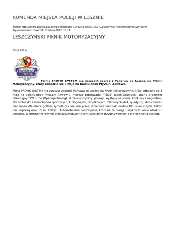 KOMENDA MIEJSKA POLICJI W LESZNIE Źródło: http://leszno.policja.gov.pl/w13/informacje-1/z-zycia-policji/70527,Leszczynski-Piknik-Motoryzacyjny.html Wygenerowano: Czwartek, 2 marca 2017, 10:11 LESZCZYŃSKI PIKNIK MOTORYZACYJNY 05.05.2011r. Firma PROMO SYSTEM ma zaszczyt zaprosić Państwa do Leszna na Piknik Motoryzacyjny, który odbędzie się 8 maja na boisku obok Pływalni Akwawit. Firma PROMO SYSTEM ma zaszczyt zaprosić Państwa do Leszna na Piknik Motoryzacyjny, który odbędzie się 8 maja na boisku obok Pływalni Akwawit. Imprezę poprowadzi "TEDE" Jacek Graniecki, znany prezenter telewizyjny TVN Turbo (Operacja Tuning). W trakcie imprezy: pokazy i występy na scenie, konkursy z nagrodami, zlot motocykli i samochodów sportowych, tuningowych, zabytkowych, militarnych, 4x4, quady itp., dmuchańce i plac zabaw dla dzieci, grillbar, symulatory pneumatyczne, strzelnica paintball, modele RC i wiele innych. Patron nad imprezą objęli m.in. Policja i Automobilklub Leszczyński, które na tą okazję uszykowali wiele atrakcji i pokazów. W programie również przejażdżki SEGWAY-ami, specjalnie przygotowany tor z profesjonalną obsługą. Ocena: 0/5 (0) Tweetnij