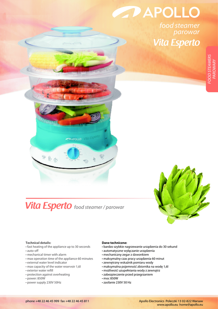 FOOD STEAMERS PAROWARY food steamer parowar food steamer / parowar Technical details: • fast heating of the appliance up to 30 seconds • auto-off • mechanical timer with alarm • max operation time of the appliance 60 minutes • external water level indicator • max capacity of the water reservoir 1,6l • exterior water refill • protection against overheating • power: 850W • power supply 230V 50Hz phone +48 22 46 45 999 fax +48 22 46 45 811 Dane techniczne: • bardzo szybkie nagrzewanie urządzenia do 30 sekund • automatyczne wyłączanie urządzenia • mechaniczny zegar z dzwonkiem • maksymalny czas pracy urządzenia 60 minut • zewnętrzny wskaźnik pomiaru wody • maksymalna pojemność zbiornika na wodę 1,6l • możliwość uzupełniania wody z zewnątrz • zabezpieczenie przed przegrzaniem • moc 850W • zasilanie 230V 50 Hz Apollo Electronics Poleczki 13 02-822 Warsaw www.apollo.eu [email protected] Accessories: • 3 baskets with total capacity 9l • collapsible baskets 3 in 1 – possibility to safe place for the appliance storage • additional rice bowl with capacity 1,0l • tray for eggs cooking Akcesoria: • 3 pojemniki o łącznej pojemności 9l • składane pojemniki 3 w 1 – możliwość oszczędzenia przestrzeni podczas przechowywania urządzenia • dodatkowa miseczka do gotowania ryżu na parze o pojemności 1,0l • tacka do gotowania jajek DISHWASHER SAFE MOŻLIWOŚĆ MYCIA W ZMYWARCE EXTERIOR WATER REFILL MOŻLIWOŚĆ UZUPEŁNIANIA WODY Z ZEWNĄTRZ ADDITIONAL RICE BOWL IN THE SET DODATKOWA MISECZKA NA RYŻ W KOMPLECIE COMPACT STORAGE KOMPAKTOWE ROZWIĄZANIE DO PRZECHOWYWANIA phone +48 22 46 45 999 fax +48 22 46 45 811 PCS. PER CARTON / KARTON (SZT.) SYMBOL COLOUR / KOLOR PPE-850-3-BLUE BLUE / NIEBIESKI 5908237134947 Apollo Electronics Poleczki 13 02-822 Warsaw www.apollo.eu [email protected] FOOD STEAMERS PAROWARY food steamer / parowar