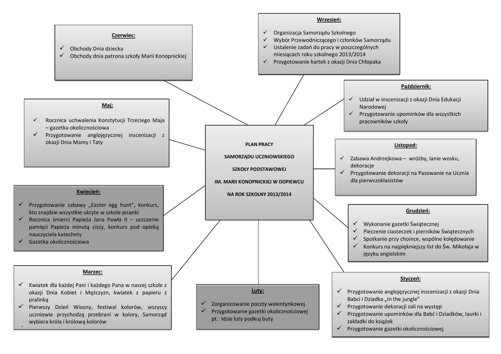 Wrzesień: Czerwiec: Obchody Dnia dziecka Obchody dnia patrona szkoły Marii Konopnickiej Organizacja Samorządu Szkolnego Wybór Przewodniczącego i członków Samorządu Ustalenie zadań do pracy w poszczególnych miesiącach roku szkolnego 2013/2014 Przygotowanie kartek z okazji Dnia Chłopaka Październik: Maj: Rocznica uchwalenia Konstytucji Trzeciego Maja – gazetka okolicznościowa Przygotowanie anglojęzycznej inscenizacji z okazji Dnia Mamy i Taty PLAN PRACY SAMORZĄDU UCZNIOWSKIEGO SZKOŁY PODSTAWOWEJ IM. MARII KONOPNICKIEJ W DOPIEWCU Kwiecień: Udział w inscenizacji z okazji Dnia Edukacji Narodowej Przygotowanie upominków dla wszystkich pracowników szkoły Listopad: Zabawa Andrzejkowa – wróżby, lanie wosku, dekoracje Przygotowanie dekoracji na Pasowanie na Ucznia dla pierwszoklasistów NA ROK SZKOLNY 2013/2014 Przygotowanie zabawy „Easter egg hunt”, konkurs, Grudzień: kto znajdzie wszystkie ukryte w szkole pisanki Rocznica śmierci Papieża Jana Pawła II – uczczenie pamięci Papieża minutą ciszy, konkurs pod opieką nauczyciela katechety Gazetka okolicznościowa Wykonanie gazetki Świątecznej Pieczenie ciasteczek i pierników Świątecznych Spotkanie przy choince, wspólne kolędowanie Konkurs na najpiękniejszy list do Św. Mikołaja w języku angielskim Marzec: Kwiatek dla każdej Pani i każdego Pana w naszej szkole z okazji Dnia Kobiet i Mężczyzn, kwiatek z papieru z pralinką Pierwszy Dzień Wiosny, festiwal kolorów, wszyscy uczniowie przychodzą przebrani w kolory, Samorząd wybiera króla i królową kolorów Gazetka okolicznościowa Styczeń: Luty: Zorganizowanie poczty walentynkowej Przygotowanie gazetki okolicznościowej pt.: Idzie luty podkuj buty Przygotowanie anglojęzycznej inscenizacji z okazji Dnia Babci i Dziadka „In the jungle” Przygotowanie dekoracji sali na występ Przygotowanie upominków dla Babć i Dziadków, laurki i zakładki do książek Przygotowanie gazetki okolicznościowej