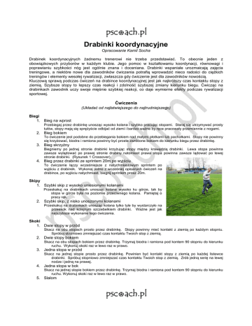 Drabinki koordynacyjne Opracowanie Kamil Socha Drabinek koordynacyjnych Ŝadnemu trenerowi nie trzeba przedstawiać. To obecnie jeden z obowiązkowych przyborów w kaŜdym klubie. Jego pomoc w kształtowaniu koordynacji, równowagi i poprawianiu szybkości nóg jest ogólnie znana i doceniana. Drabinki wspaniale urozmaicają zajęcia treningowe, a niektóre nowe dla zawodników ćwiczenia potrafią wprowadzić nieco radości do cięŜkich treningów i elementy wesołej rywalizacji, zwłaszcza gdy ćwiczenie jest dla zawodników nowością. Kluczową sprawą podczas ćwiczeń na drabince koordynacyjnej jest jak najkrótszy czas kontaktu stopy z ziemią. Szybsze stopy to lepszy czas reakcji i zdolność szybszej zmiany kierunku biegu. Ćwicząc na drabinkach zawodnik uczy swoje mięśnie szybkiej reakcji, co daje wymierne efekty podczas rywalizacji sportowej. Ćwiczenia (Układać od najłatwiejszego do najtrudniejszego) Biegi 1. Bieg na wprost Przebiegaj przez drabinkę unosząc wysoko kolana i szybko pracując stopami. Staraj się utrzymywać prosty tułów, stopy mają się spręŜyście odbijać od ziemi i bardzo waŜne by ręce pracowały przemiennie z nogami. 2. Bieg bokiem To ćwiczenie jest podobne do przebiegania bokiem nad małymi płotkami lub pachołkami. Stopy nie powinny się krzyŜować, biodra i ramiona powinny być proste zwrócone bokiem do kierunku biegu przez drabinkę. 3. Bieg skrzyŜny Biegniemy po jednej stronie drabinki krzyŜując stopy między krawędzią drabinki. Lewa stopa powinna zawsze wylądować po prawej stronie drabiny natomiast prawa stopa powinna zawsze lądować po lewej stronie drabinki. (Rysunek 1 Crossover). 4. Bieg przez drabinki ze sprintem 20m po wyjściu To ćwiczenie łączy wcześniejsze z natychmiastowym sprintem po wyjściu z drabinek. Wykonaj jedno z wcześniej opisanych ćwiczeń na drabince, po wyjściu natychmiast, biegnij sprintem przez 20m. Skipy 1. Szybki skip z wysoko uniesionymi kolanami Przeskakuj na drabinkach unosząc kolana wysoko ku górze, tak by stopa w górze była na poziomie przeciwnego kolana. Pamiętaj o pracy rąk. 2. Szybki skip, z nisko unoszonymi kolanami Przeskakuj na drabinkach unosząc kolana tylko tyle by wystarczyło na przeskok nad kolejnym szczebelkiem drabinki. WaŜne jest jak najszybsze wykonanie tego ćwiczenia. Skoki 1. Dwie stopy w przód Skacz na obu stopach prosto przez drabinkę. Stopy powinny mieć kontakt z ziemią po kaŜdym stopniu. Spróbuj stopniowo zmniejszać czas kontaktu Twoich stop z ziemią. 2. Dwie stopy bokiem Skacz na obu stopach bokiem przez drabinkę. Trzymaj biodra i ramiona pod kontem 90 stopniu do kierunku ruchu. Wykonuj skoki raz w lewo raz w prawo. 3. Jedna stopa w przód Skacz na jednej stopie prosto przez drabinkę. Powinien być kontakt stopy z ziemią po kaŜdej listewce drabinki. Spróbuj stopniowo zmniejszać czas kontaktu Twoich stop z ziemią. Zrób jedną serię na lewej nodze i jedną na prawej. 4. Jedna stopa w bok Skacz na jednej stopie bokiem przez drabinkę. Trzymaj biodra i ramiona pod kontem 90 stopniu do kierunku ruchu. Wykonuj skoki raz w lewo raz w prawo. 5. Slalom Wykonuj zygzakiem skoki na zł złączonych stopach na jednejj stronie drabinki. (Rysunek 2 Slalom Jump). Zwiększając trudność ść moŜna mo wykonywać to ćwiczenie równieŜ na jednej nodze. 6. Twist Jumps Świetne ćwiczenie wiczenie zmuszają zmuszające ćwiczącego cego do pracy biodrami. (Rysunek 3 Twist Jumps). Szuranie nogami Zobacz rysunki od 4 do 8: 1. Cariocca 2. Front - Back 3. In - Out Shuffle 4. Zig - Zag Shuffle 5. Shuffle Agility Ćwiczenia kombinowane Drabinka koordynacyjna moŜe Ŝe być by roŜnie składana by zwiększyć kombinacje ćwiczeń. ć MoŜe być np. złoŜona pod kątem 90 stopni, np. w liter literę T. Pozwala to na tworzenie nieograniczonej ilości ilo ćwiczeń, które mogą być wykonywane łącząc łącz np. dowolne dwa, opisane wcześniej, niej, w jedno. Kilka przykładów podajemy poniŜej. Układającc swoje własne ćwiczenia uwzględniaj teŜ dyscyplinę ę jaką jak trenujesz i staraj się modyfikować ćwiczenia wiczenia do jej potrzeb. Przykłady ćwiczeń kombinowanych: 1. 2. 3. 4. Ustaw drabinkę w kształcie litery T. Biegnij przodem przez ka kaŜdy szczebelek, na końcu ko bieg bokiem w prawo lub lewo i szybki po wyjściu wyj z drabinek Biegnij prawym, później niej lewym bokiem, na ko końcu cu bieg przodem przez szczebelki i sprint Biegnij bokiem jak w ćwiczeniu Cariocca, a nast następnie przejdź do biegu na wprost wprost. Skacz slalomem najpierw dwa skoki na obu stopach i dwa na jednej. CROSSOVER 1. Stań na początku tku drabinki jak na obrazku 2. Postaw stopę za pierwszym szczebelkiem i biegnij po jednej stronie drabinki krzy krzyŜując stopy po kaŜdym kroku. SLALOM JUMP 1. Stań na początku tku drabinki jak na obrazku 2. Trzymaj obie stopy razem, skacz zygzaki zygzakiem em do przodu po jednym boku drabinki. 3. Ćwiczenie moŜna na wykonywać teŜ na jednej nodze. TWIST JUMP 1. Stań na początku tku drabinki jak na obrazku 2. Trzymaj obie stopy razem, wykonaj seri serię skoków jak pokazano na rysunku. 3. To ćwiczenie wiczenie zmusza do pracy bioder bi podczas kaŜdego skoku. 1. Stań bokiem na początku ątku drabinki. Postaw prawą stopę za pierwszym szczebelkiem. 2. SkrzyŜuj drugą stopę stawiaj stawiając ją za kolejnym szczebelkiem. Lewa stopa powinna się si skrzyŜować z przodu prawej stopy. 3. Postaw prawą stopę za trzeci szczebelek. Prawa stopa powinna się si skrzyŜować skrzyŜ za lewą stopą. 4. Jeszcze raz, lewa stopa przejdzie z przodu prawej stopy. Powtórz tą kolejność na drabince. Zwracaj uwagę uwag na wysokie unoszenie kolan kiedy krzyŜujesz krzy nogi z przodu. 1. Stań bokiem za pierwszym szczebelkiem na początku tku drabinki. Wystaw do przodu prawą praw stopę przed drabinkę drabinkę. Uwaga: Zawsze wystawiaj stopę bliŜszą kierunku biegu. (ruszając (ruszaj w prawo, wystawiasz prawą praw sto