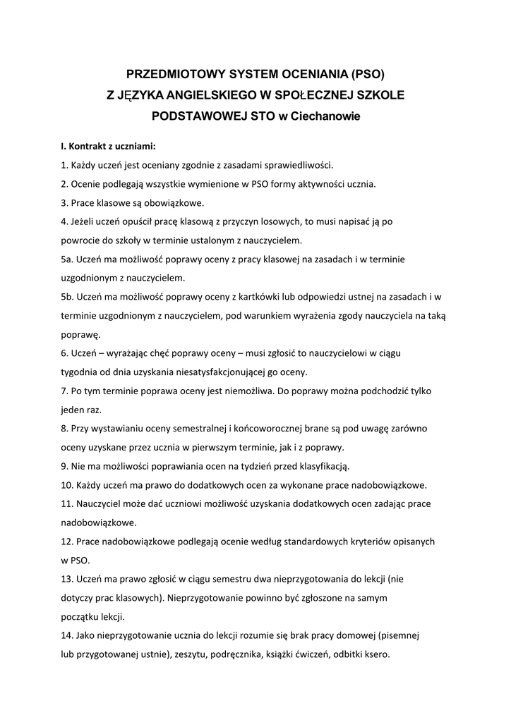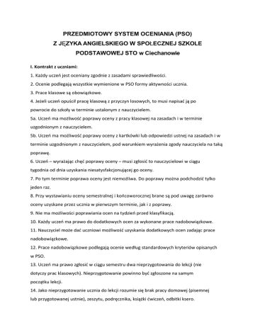 PRZEDMIOTOWY SYSTEM OCENIANIA (PSO) Z JĘZYKA ANGIELSKIEGO W SPOŁECZNEJ SZKOLE PODSTAWOWEJ STO w Ciechanowie I. Kontrakt z uczniami: 1. Każdy uczeń jest oceniany zgodnie z zasadami sprawiedliwości. 2. Ocenie podlegają wszystkie wymienione w PSO formy aktywności ucznia. 3. Prace klasowe są obowiązkowe. 4. Jeżeli uczeń opuścił pracę klasową z przyczyn losowych, to musi napisać ją po powrocie do szkoły w terminie ustalonym z nauczycielem. 5a. Uczeń ma możliwość poprawy oceny z pracy klasowej na zasadach i w terminie uzgodnionym z nauczycielem. 5b. Uczeń ma możliwość poprawy oceny z kartkówki lub odpowiedzi ustnej na zasadach i w terminie uzgodnionym z nauczycielem, pod warunkiem wyrażenia zgody nauczyciela na taką poprawę. 6. Uczeń – wyrażając chęć poprawy oceny – musi zgłosić to nauczycielowi w ciągu tygodnia od dnia uzyskania niesatysfakcjonującej go oceny. 7. Po tym terminie poprawa oceny jest niemożliwa. Do poprawy można podchodzić tylko jeden raz. 8. Przy wystawianiu oceny semestralnej i końcoworocznej brane są pod uwagę zarówno oceny uzyskane przez ucznia w pierwszym terminie, jak i z poprawy. 9. Nie ma możliwości poprawiania ocen na tydzień przed klasyfikacją. 10. Każdy uczeń ma prawo do dodatkowych ocen za wykonane prace nadobowiązkowe. 11. Nauczyciel może dać uczniowi możliwość uzyskania dodatkowych ocen zadając prace nadobowiązkowe. 12. Prace nadobowiązkowe podlegają ocenie według standardowych kryteriów opisanych w PSO. 13. Uczeń ma prawo zgłosić w ciągu semestru dwa nieprzygotowania do lekcji (nie dotyczy prac klasowych). Nieprzygotowanie powinno być zgłoszone na samym początku lekcji. 14. Jako nieprzygotowanie ucznia do lekcji rozumie się brak pracy domowej (pisemnej lub przygotowanej ustnie), zeszytu, podręcznika, książki ćwiczeń, odbitki ksero. 15. Za nieprzygotowanie do lekcji uczeń uzyskuje ocenę niedostateczna, którą może poprawić. 16. Nieobecność ucznia na zajęciach nie zwalnia go z obowiązku uzupełnienia wiadomości. W razie dłuższej usprawiedliwionej nieobecności, termin nadrobienia zaległości uczeń ustala z nauczycielem. 17. Aktywność ucznia może być oceniana w czasie lekcji plusami ,,+" lub minusami „-”. Pięć plusów daje ocenę bardzo dobrą, sześć plusów daje ocenę celującą, natomiast za trzy minusy uczeń dostaje ocenę niedostateczną. 18. Plus otrzymuje uczeń, który zgłasza się wielokrotnie do odpowiedzi w czasie lekcji (pod warunkiem, że podaje poprawne odpowiedzi) i wykonuje poprawnie prace dodatkowe zadane przez nauczyciela w czasie lekcji. Minusa otrzymuje uczeń, który nie wykonuje prac zadanych przez nauczyciela w czasie lekcji i który kilkukrotnie w czasie lekcji nie potrafi udzielić prawidłowej odpowiedzi. II. Obszary aktywności podlegające ocenianiu: 1. Ocenie podlegają: - prace kontrolne - kartkówki - odpowiedź ustna - praca domowa - aktywność ucznia - prace wykonane podczas zajęć 2. Podstawowym kryterium oceny jest umiejętność komunikacji w języku angielskim. 3. Pozostałe kryteria oceny to: - poprawność wypowiedzi (fonetyczna i gramatyczna) - płynność wypowiedzi - odpowiedni dobór środków wypowiedzi (słownictwo, intonacja wypowiedzi). III. Formy aktywności Formy aktywności Liczba ocen w semestrze ( minimum) Prace klasowe 3 Kartkówki 1 Mówienie 1 Prace domowe 1 Praca w grupach 1 Rozumienie ze słuch 1 IV. Kryteria oceniania poszczególnych form aktywności 1. Praca pisemna jest oceniana według skali procentowej: poniżej 44% - ocena niedostateczna 45% - 59% - ocena dopuszczająca 60% - 74% - ocena dostateczna 75% - 89% - ocena dobra 90% - 100% - ocena bardzo dobra powyżej 100% - ocena celująca 2. Nauczyciel ma możliwość podwyższenia lub obniżenia skali. 3. Ocenę celującą otrzymuje uczeń, który • spełnia wymagania na ocenę bardzo dobrą oraz wykazuje się umiejętnościami ponadprogramowymi. • uzyskuje oceny celujące z prac klasowych, sprawdzianów i prac domowych, • systematycznie wykonuje prace nadobowiązkowe, • polecenia nauczyciela wypełnia zawsze systematycznie i sumiennie, prezentując wzorowy stosunek do przedmiotu, • uczestniczy i zdobywa nagrody w konkursach przedmiotowych w szkole lub poza szkołą. V. Sposób ustalania oceny semestralnej i końcoworocznej Przy ustalaniu oceny semestralnej nauczyciel bierze pod uwagę stopnie ucznia z poszczególnych obszarów aktywności według następującej kolejności: • prace klasowe • sprawdziany • odpowiedzi • prace domowe • prace dodatkowe • aktywność na lekcji • praca w grupach VI. Informowanie uczniów i rodziców o wymaganiach i postępach ucznia a. nauczyciel - uczeń • nauczyciel przekazuje uczniowi komentarz do każdej wystawionej oceny; • uczeń ma możliwość otrzymywania dodatkowych wyjaśnień i uzasadnień do wystawionej oceny jeśli wyrazi taką chęć; b. nauczyciel - rodzic • podczas wywiadówek lub indywidualnych konsultacji rodzic może uzyskać informacje o postępach w nauce dziecka; • rodzice są zobowiązani do podpisywania ocen z prac klasowych i sprawdzianów. VII. Wymagania na poszczególne oceny Ocena niedostateczna Uczeń nie spełnia wymagań podanych niżej kryteriów ocen pozytywnych. Nie potrafi samodzielnie budować wypowiedzi ustnych, reprodukować ich lub budować na drodze naśladowania. Błędy leksykalne, gramatyczne i fonetyczne zupełnie zacierają intencje komunikacyjne. Uczeń nie rozumie informacji przekazywanych audialnie i audiowizualnie. Nie wykonuje prac domowych, nie wykazuje zainteresowania różnymi formami pracy na zajęciach, jest niesystematyczny. Ocena dopuszczająca Wypowiedzi ucznia są bardzo ograniczone, odpowiada na pytania jednym słowem. Uczeń w ograniczonym stopniu rozumie intencje rozmówcy i polecenia nauczyciela, często muszą być poparte gestem. Niewielka samodzielność pracy, nawet z pomocą nauczyciela uczeń ma poważne problemy z wyko