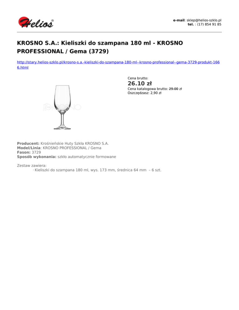 e-mail: [email protected] tel. : (17) 854 91 85 KROSNO S.A.: Kieliszki do szampana 180 ml - KROSNO PROFESSIONAL / Gema (3729) http://stary.helios-szklo.pl/krosno-s.a.-kieliszki-do-szampana-180-ml--krosno-professional--gema-3729-produkt-166 6.html Cena brutto: 26.10 zł Cena katalogowa brutto: 29.00 zł Oszczędzasz: 2,90 zł Producent: Krośnieńskie Huty Szkła KROSNO S.A. Model/Linia: KROSNO PROFESSIONAL / Gema Fason: 3729 Sposób wykonania: szkło automatycznie formowane Zestaw zawiera: · Kieliszki do szampana 180 ml, wys. 173 mm, średnica 64 mm – 6 szt.