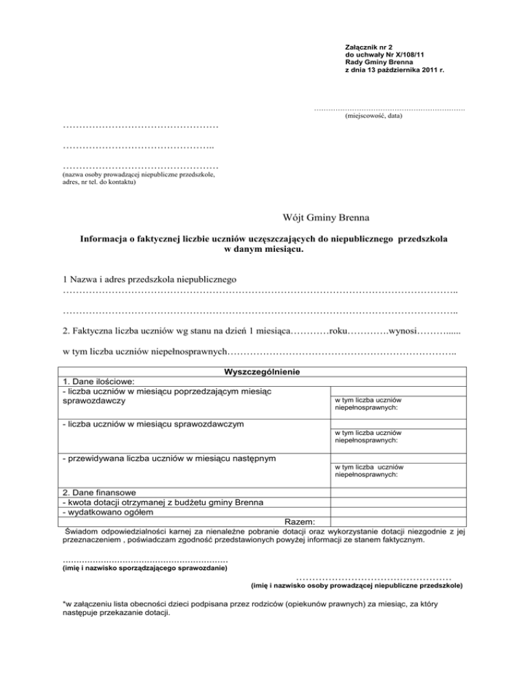 Załącznik nr 2 do uchwały Nr X/108/11 Rady Gminy Brenna z dnia 13 października 2011 r. ………………………………………………………. (miejscowość, data) ………………………………………… ……………………………………….. ………………………………………… (nazwa osoby prowadzącej niepubliczne przedszkole, adres, nr tel. do kontaktu) Wójt Gminy Brenna Informacja o faktycznej liczbie uczniów uczęszczających do niepublicznego przedszkola w danym miesiącu. 1 Nazwa i adres przedszkola niepublicznego ………………………………………………………………………………………………………….. ………………………………………………………………………………………………………….. 2. Faktyczna liczba uczniów wg stanu na dzień 1 miesiąca…………roku………….wynosi………...... w tym liczba uczniów niepełnosprawnych…………………………………………………………….. Wyszczególnienie 1. Dane ilościowe: - liczba uczniów w miesiącu poprzedzającym miesiąc sprawozdawczy w tym liczba uczniów niepełnosprawnych: - liczba uczniów w miesiącu sprawozdawczym w tym liczba uczniów niepełnosprawnych: - przewidywana liczba uczniów w miesiącu następnym w tym liczba uczniów niepełnosprawnych: 2. Dane finansowe - kwota dotacji otrzymanej z budŜetu gminy Brenna - wydatkowano ogółem Razem: Świadom odpowiedzialności karnej za nienaleŜne pobranie dotacji oraz wykorzystanie dotacji niezgodnie z jej przeznaczeniem , poświadczam zgodność przedstawionych powyŜej informacji ze stanem faktycznym. ............................................................. (imię i nazwisko sporządzającego sprawozdanie) ………………………………………… (imię i nazwisko osoby prowadzącej niepubliczne przedszkole) *w załączeniu lista obecności dzieci podpisana przez rodziców (opiekunów prawnych) za miesiąc, za który następuje przekazanie dotacji.