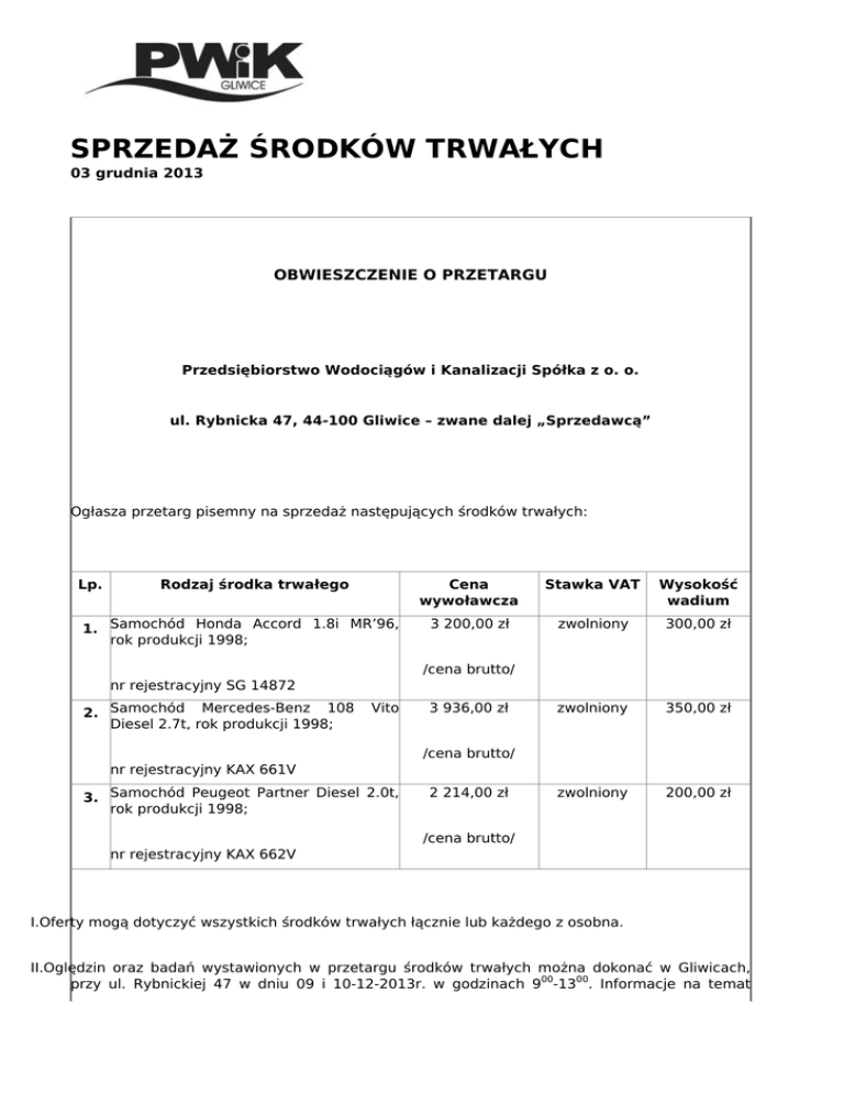 SPRZEDAŻ ŚRODKÓW TRWAŁYCH 03 grudnia 2013 OBWIESZCZENIE O PRZETARGU Przedsiębiorstwo Wodociągów i Kanalizacji Spółka z o. o. ul. Rybnicka 47, 44-100 Gliwice – zwane dalej „Sprzedawcą” Ogłasza przetarg pisemny na sprzedaż następujących środków trwałych: Lp. Rodzaj środka trwałego 1. Samochód Honda Accord 1.8i MR’96, rok produkcji 1998; Cena wywoławcza Stawka VAT Wysokość wadium 3 200,00 zł zwolniony 300,00 zł zwolniony 350,00 zł zwolniony 200,00 zł /cena brutto/ nr rejestracyjny SG 14872 2. Samochód Mercedes-Benz 108 Diesel 2.7t, rok produkcji 1998; Vito 3 936,00 zł /cena brutto/ nr rejestracyjny KAX 661V 3. Samochód Peugeot Partner Diesel 2.0t, rok produkcji 1998; 2 214,00 zł /cena brutto/ nr rejestracyjny KAX 662V I.Oferty mogą dotyczyć wszystkich środków trwałych łącznie lub każdego z osobna. II.Oględzin oraz badań wystawionych w przetargu środków trwałych można dokonać w Gliwicach, przy ul. Rybnickiej 47 w dniu 09 i 10-12-2013r. w godzinach 900-1300. Informacje na temat sprzedawanego środka trwałego można uzyskać od Pana Stefana Bernaczka pod nr tel. (32) 338-71-81 od poniedziałku do piątku w godz. 700-1500. III.Oferty należy składać w siedzibie Sprzedawcy w pokoju 308 do dnia 11-12-2013r. do godziny 900. IV.Wadium należy wpłacić w siedzibie Sprzedawcy w kasie lub na konto Sprzedawcy w Bank Handlowy w Warszawie S.A. o nr 30 1030 1508 0000 0008 0434 7003 z adnotacją: Wadium – przetarg na sprzedaż (podać nazwę środka trwałego i nr identyfikacyjny/rejestracyjny). Wadium musi zostać zaksięgowane na koncie Sprzedawcy w dniu otwarcia ofert do godziny 900. V.Wadium przepada na rzecz Sprzedawcy jeżeli żaden z uczestników licytacji nie zaoferuje ceny nabycia równej co najmniej cenie wywoławczej. VI.Oferentom, których oferty nie zostaną przyjęte, wadium zostanie zwrócone bezpośrednio po dokonaniu wyboru oferty, a Oferentowi , którego oferta została przyjęta, zostanie zaliczone na poczet ceny; VII.Jeżeli Oferent, którego oferta została przyjęta uchyli się od zawarcia umowy, wówczas wniesione przez niego wadium przepada na rzecz Sprzedawcy. VIII.Oferent zamieści ofertę w kopercie, która będzie zaadresowana na Sprzedawcę (jak w nagłówku) oraz będzie posiadać następujące oznaczenie: Przetarg pisemny na sprzedaż: (wpisać nazwę środka trwałego i numer identyfikacyjny/rejestracyjny) nie otwierać do dnia 11-12-2013r. do godziny 930 IX.Poza oznaczeniami podanymi powyżej koperta będzie również posiadać nazwę i adres Oferenta. X.Otwarcie Ofert nastąpi w dniu 11-12-2013r. o godzinie 930 w siedzibie Sprzedawcy. XI.Sprzedawca informuje, iż przysługuje mu prawo swobodnego wyboru oferty jeżeli uczestnicy przetargu zaoferują tą samą cenę. Powered by TCPDF (www.tcpdf.org)