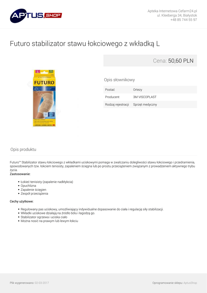 Apteka Internetowa Cefarm24.pl ul. Kleeberga 34, Białystok +48 85 744 55 97 Futuro stabilizator stawu łokciowego z wkładką L Cena: 50,60 PLN Opis słownikowy Postać Ortezy Producent 3M VISCOPLAST Rodzaj rejestracji Sprzęt medyczny Opis produktu Futuro™ Stabilizator stawu łokciowego z wkładkami uciskowymi pomaga w zwalczaniu dolegliwości stawu łokciowego i przedramienia, spowodowanych tzw. łokciem tenisisty, zapaleniem ścięgna lub po prostu przeciążeniem związanym z prowadzeniem aktywnego trybu życia. Zastosowanie: Łokieć tenisisty (zapalenie nadkłykcia) Opuchlizna Zapalenie ścięgien Zespół przeciążenia Cechy użytkowe: Regulowany pas uciskowy, umożliwiający indywidualne dopasowanie do ciała i regulację siły stabilizacji. Wkładki uciskowe działają na źródło bólu i łagodzą go. Stabilizator ogrzewa i uciska ciało Można nosić na prawym lub lewym łokciu Plik wygenerowano: 02-03-2017 Powered by TCPDF (www.tcpdf.org) Oprogramowanie sklepu: AptusShop