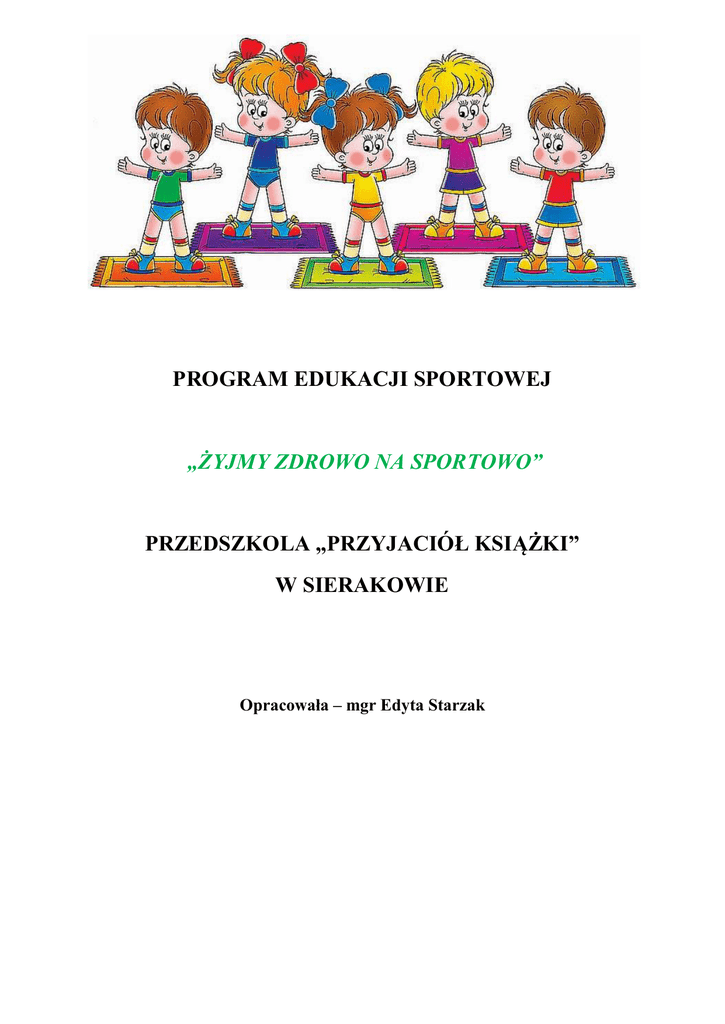 PROGRAM EDUKACJI SPORTOWEJ „ŻYJMY ZDROWO NA SPORTOWO” PRZEDSZKOLA „PRZYJACIÓŁ KSIĄŻKI” W SIERAKOWIE Opracowała – mgr Edyta Starzak Wstęp Ruch jest przejawem życia, a aktywność fizyczna jest czynnikiem kształtującym organizm człowieka i jego funkcje. Człowiek potrzebuje aktywności fizycznej tak samo, jak pożywienia i powietrza. Występujący u dzieci "głód ruchu" jest wyrazem podświadomej chęci zaspokajania tej bardzo ważnej potrzeby, zapewnienia niezbędnego czynnika stymulującego rozwój: fizyczny, umysłowy, emocjonalny i społeczny. Szczególnie w wieku przedszkolnym poruszanie się jest ważnym środkiem zdobywania informacji na temat otaczającego świata. Przez ruch dziecko ma możliwość poznawania siebie samego, własnego ciała i własnych możliwości, oszacowania swoich umiejętności, a także rozwijania wiary we własne siły oraz zdobywania w trakcie zabaw ruchowych społecznych doświadczeń z innymi osobami. Okres przedszkolny jest szczególnie znaczący dla kształtowania motoryczności dziecka. Dziecko nabywa wówczas pewnych umiejętności, które w dalszych etapach życia jedynie doskonali. W okresie tym aktywność ruchowa przyczynia się w znaczącym stopniu do wzmocnienia odporności organizmu na szkodliwy wpływ czynników środowiskowych, a umiejętności ruchowe często wyznaczają pozycję dziecka w grupie rówieśniczej. Dlatego należy dbać o prawidłowy rozwój fizyczny dziecka, o zapewnienie mu odpowiedniej ilości wszechstronnego ruchu. Jeżeli dziecko w wieku przedszkolnym będzie poddawane systematycznym ćwiczeniom, odpowiadającym jego rozwojowi i naturalnym zainteresowaniom, może osiągnąć wysoki poziom sprawności ruchowej. Aktywność ruchowa spełnia cztery podstawowe funkcje, do których zaliczamy: -stymulację, - adaptację, - kompensację, - korektywę. RUCH JAKO CZYNNIK STYMUJUJĄCY: Ruch pobudza rozwój organizmu. Dzięki niemu poprawia się motoryka i sprawność fizyczna człowieka: - mięśnie wykonujące pracę zwiększają swój przekrój, objętość, siłę i sprężystość, następuje wzmacnianie i wzrost elastyczności i wytrzymałości ścięgien oraz więzadeł, - ruch sprzyja mineralizacji kości, - wysiłek fizyczny mobilizuje układ krążeniowo- naczyniowy, powoduje wzmożoną akcję serca, które wzmacnia się i rozbudowuje; wysiłkowi fizycznemu towarzyszą skurcze mięśni, które ułatwiają krążenie krwi w organizmie, - ruch uaktywnia układ oddechowy, gdyż płuca muszą wykonać zwiększoną pracę, dzięki czemu wzrasta pojemność życiowa płuc, a także ilość przyswajanego tlenu; więcej go dociera do rozwijających się narządów, - ćwiczenia fizyczne przyczyniają się bezpośrednio do podwyższenia sprawności żołądka i jelit, a pośrednio wpływają na wydolność wątroby i nerek, - aktywność fizyczna pobudza dojrzewanie układu nerwowego; szybciej dojrzewają ośrodki mózgu zawiadujące ruchami (przyspiesza to rozwój motoryczności); jednocześnie następuje wzrost szybkości przewodzenia impulsów nerwowych, co usprawnia koordynację ruchową, - dzięki ruchowi dziecko poznaje otaczający je świat, wzbogaca swoje doświadczenia, kształtuje pamięć i uwagę, - ruch rozwija samodzielność dziecka, - zabawy i ćwiczenia w grupie rozwijają zachowania prospołeczne; dziecko podporządkowuje się obowiązującym normom i zasadom, - aktywność fizyczna wpływa na rozwój charakteru i osobowości. RUCH JAKO CZYNNIK ADAPTACYJNY: - aktywność ruchowa rozwija zdolność przystosowania organizmu dziecka do zmieniających się warunków życia: klimatu, temperatury, ciśnienia, warunków atmosferycznych, trudności dnia codziennego, itp. - przez ruch i ćwiczenia fizyczne można hartować organizm, czyli doprowadzać do podwyższania granicy tolerancji na bodźce czy czynniki ze strony środowiska, a także kształtować odporność na czynniki psychiczne (np. stres) i społeczne. RUCH JAKO CZYNNIK KOMPENSACYJNY: - kompensacja to inaczej wyrównanie; aktywność fizyczna ma przywrócić niezbędną dla prawidłowego rozwoju organizmu dziecka równowagę czynników korzystnych i szkodliwych. RUCH JAKO CZYNNIK KOREKTYWNY: - działania korekcyjne, przy użyciu odpowiednio dobranej i sterowanej aktywności fizycznej, podejmowane są w tych przypadkach, gdy powstałe odchylenia rozwojowe można zlikwidować lub złagodzić przy użyciu ćwiczeń korekcyjnych. Funkcja korekcyjna jest funkcją terapeutyczną i leczniczą. Tak więc w przedszkolu nie sposób zrezygnować z ruchu i sportu. Każdego dnia dzieci muszą mieć wystarczająco dużo okazji do fizycznej aktywności, nie tylko w związku z fizycznym usprawnianiem dzieci, ale również całościowym rozwojem osobowości dziecka poprzez ruch. W tym celu dzieci muszą mieć do dyspozycji przede wszystkim wystarczająco dużo przestrzeni (łąka, plac zabaw, sala gimnastyczna) oraz odpowiednie przyrządy gimnastyczne, które zachęcają je do motorycznych zabaw. Przy doborze ćwiczeń należy kierować się: -aktualnymi potrzebami dzieci, -umiejętnościami dzieci, -pomieszczeniem oraz materiałami, jakie mają do dyspozycji. Optymalny czas ćwiczeń to 20-30 min. Czas ten należy każdorazowo dostosowywać do chęci, możliwości i zaangażowania dzieci. Ćwiczeniom musi towarzyszyć odpowiednia atmosferawzajemnej życzliwości, pogody, przyjaźni, a także wyrozumiałości; wtedy będą one dla dziecka przyjemnością i źródłem radości. Bardzo istotna jest właściwa promocja aktywności fizycznej wśród najmłodszych. Program sportowy a podstawa programowa. Przedszkole, jako instytucja opiekuńczo – wychowawcza ma za zadanie wspierać rozwój i wczesną edukację dzieci od trzeciego roku życia do osiągnięcia przez wychowanka „gotowości szkolnej”. Głównym, zatem celem wychowania przedszkolnego jest przygotowanie dziecka do nauki szkolnej, ale także ułatwienie i kontrola właściwego rozwoju umysłowe