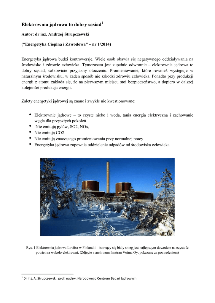 Elektrownia jądrowa to dobry sąsiad1 Autor: dr inż. Andrzej Strupczewski (“Energetyka Cieplna i Zawodowa” – nr 1/2014) Energetyka jądrowa budzi kontrowersje. Wiele osób obawia się negatywnego oddziaływania na środowisko i zdrowie człowieka. Tymczasem jest zupełnie odwrotnie – elektrownia jądrowa to dobry sąsiad, całkowicie przyjazny otoczeniu. Promieniowanie, które również występuje w naturalnym środowisku, w żaden sposób nie szkodzi zdrowiu człowieka. Ponadto przy produkcji energii z atomu zakłada się, że na pierwszym miejscu stoi bezpieczeństwo, a dopiero w dalszej kolejności produkcja energii. Zalety energetyki jądrowej są znane i zwykle nie kwestionowane: Elektrownie jądrowe – to czyste niebo i woda, tania energia elektryczna i zachowanie węgla dla przyszłych pokoleń Nie emitują pyłów, SO2, NOx, Nie emitują CO2 Nie emitują znaczącego promieniowania przy normalnej pracy Energetyka jądrowa zapewnia oddzielenie odpadów od środowiska człowieka Rys. 1 Elektrownia jądrowa Loviisa w Finlandii – iskrzący się biały śnieg jest najlepszym dowodem na czystość powietrza wokoło elektrowni. (Zdjęcie z archiwum Imatran Voima Oy, pokazane za pozwoleniem) 1 Dr inż. A. Strupczewski, prof. nadzw. Narodowego Centrum Badań Jądrowych Ale mimo to ludzie boją się promieniowania w czasie normalnej pracy, a tym bardziej w przypadku awarii, nawet nieistotnych dla bezpieczeństwa elektrowni. Spróbujmy więc w ramach kilku artykułów przedstawić te zagrożenia w prawidłowej perspektywie, tak byśmy wydawali sąd o energetyce jądrowej znając fakty, a nie tylko plotki i obawy. Zacznijmy od rozpatrzenia wpływu energetyki jądrowej na środowisko przy normalnej pracy elektrowni, a w następnych artykułach omówimy skutki możliwych awarii i na koniec wpływ całego cyklu eksploatacji, od wydobycia uranu do unieszkodliwiania odpadów włącznie. Co z tym promieniowaniem? Elektrownie jądrowe emitują promieniowanie – bardzo mało, ale jednak...Rozważmy więc, czy małe dawki promieniowania są groźne? Promieniowanie to nieodłączny element naszego środowiska. Było ono gdy powstawała Ziemia, gdy kształtowały się pierwsze komórki i jest z nami wciąż, wcale nie z powodu działań człowieka, a wskutek rozpadów jąder atomowych zachodzących przez miliardy lat. Towarzyszy też człowiekowi od pierwszych chwil jego życia, gdy dziecko jeszcze przed urodzeniem otrzymuje promieniowanie w łonie matki, gdy rodzi się i odczuwa promieniowanie z kosmosu i z otaczających go ścian domu i gdy jako niemowlę pije mleko z piersi matki – mleko, w którym znajdują się atomy potasu K-40, promieniotwórczego izotopu, nieodłącznie związanego z mlekiem. Promieniowanie jest nawet w wodzie – nie tylko w wodzie morskiej, ale i w wodzie płynącej z krystalicznie czystych potoków alpejskich. I to promieniowanie nie szkodzi ludziom. Nasze organizmy przywykły do promieniowania. Co więcej, gdy powstawały pierwsze komórki, poziom promieniowania był wyższy niż obecnie. Po prostu dlatego, że z każdym rozpadem radioaktywnego atomu powodującym emisję promieniowania jeden atom promieniotwórczy znika – więc źródeł promieniotwórczości jest coraz mniej. Procesy zapewniające ochronę naszego organizmu przed promieniowaniem działają też skutecznie na inne zagrożenia naszych komórek, a ponieważ kształtowały się one gdy promieniowanie było silniejsze niż dzisiaj, przeto są one skuteczniejsze w warunkach nieco podwyższonego promieniowania. Dlatego wahania tła promieniowania – czy to dającego wciągu 70 lat życia dawki około 200 mSv jak w Polsce, czy 500 mSv jak w Finlandii (rys. 2), nie mają wpływu na zdrowie ludzi. Aby wykryć możliwy wpływ promieniowania na zdrowie ludzi, badano mieszkańców prowincji Yangjiang w Chinach (max. 6,4 mGy/rok) , rejonu Kerala w Indiach (max 35 mGy/rok) , Ramsar w Iranie, gdzie średnia mocy dawki wynosi 10,2 mGy/rok, a max moce dawki sięgają 260 mGy/rok. Dziesiątków innych obszarów o podwyższonym promieniowaniu Dawka, mSv (w ciągu 70 lat) 600 Srednia dawka promieniowania w ciągu życia w krajach Europy 500 wg [IAEA: Sustainable Development and Nuclear P ower, 1997] 400 300 200 100 ni a ja W .B ry ta ec Sz w aj ca ria sk a Sz w Po l ia zp an ja re c G H is a Fr an cj a an di Fi nl A us tr i a 0 Rys. 2 Dawki otrzymywane w ciągu 70 lat życia w różnych krajach. W żadnym z tych rejonów nie wykryto zwiększonej umieralności na raka Wyniki wielu badań przeprowadzonych w USA wskazują, że wysokiemu tłu promieniowania towarzyszy niska umieralność na raka. Rzeczywiste częstości zachorowania na raka płuc w 6 stanach USA o najwyższym tle promieniowania wynoszą średnio 44/rok na 100 000 mieszkańców, a w stanach o najniższym tle promieniowania 73/rok na 100 000 mieszkańców. Podobne są wyniki badań w innych rejonach świata. Mimo to, w energetyce jądrowej obowiązuje zasada by redukować emisje i dawki promieniowania tak bardzo, jak tylko jest to rozsądnie możliwe. Na rys. 3 widać, jak z biegiem lat malały emisje radioaktywne z elektrowni jądrowych. Przede wszystkim bezpieczeństwo Dzięki ciągłym staraniom inżynierów nuklearnych i całego środowiska związanego z energetyką jądrową emisje z elektrowni są obecnie tak małe, że wielkość dawek promieniowania otrzymywanych przez mieszkańców na granicy strefy ograniczonego użytkowania jest wielekroć mniejsza od wahań naturalnego tła promieniowania. Ilustruje to rys. 4 na którym pokazano dawki otrzymywane rocznie w Finlandii i średnio na świecie. Wielkość dawek dopuszczalnych od elektrowni jądrowych ustalona przez ICRP (International Committee for Radiological Protection) i Komisję Europejską (UE) jest mniejsza od wahań dawek na świecie, wielkość dozwolona przez dozór jądrowy jest mniejsza od dozwolonej przez ICRP, a wielkość dawek zalecana w energetyce jądrowej (EUR – European