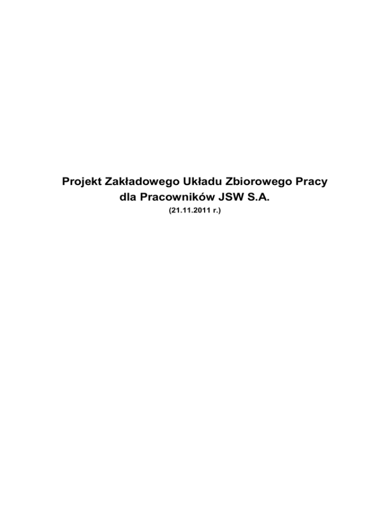 Projekt Zakładowego Układu Zbiorowego Pracy dla Pracowników JSW S.A. (21.11.2011 r.) SPIS TREŚCI PREAMBUŁA..................................................................................................................................................... 3 ROZDZIAŁ I - PRZEPISY WSTĘPNE...................................................................................................................... 3 ROZDZIAŁ II - ZASADY WYNAGRADZANIA......................................................................................................... 5 ROZDZIAŁ III - INNE ŚWIADCZENIA ................................................................................................................... 9 ROZDZIAŁ IV – OCHRONA ZATRUDNIENIA ...................................................................................................... 11 ROZDZIAŁ V - WSPÓŁPRACA ZE ZWIĄZKAMI ZAWODOWYMI ......................................................................... 12 ROZDZIAŁ VI - POSTANOWIENIA KOŃCOWE................................................................................................... 13 SPIS ZAŁĄCZNIKÓW ZAŁĄCZNIK NR 1 DO ZUZP - TARYFIKATORY ................................................................................................... 15 ZAŁĄCZNIK NR 2 DO ZUZP- TABELE STAWEK PŁAC ZASADNICZYCH................................................................. 39 ZAŁĄCZNIK NR 3 DO ZUZP - ZASADY WYPŁATY DODATKÓW ZA STAŻ PRACY TZW. SPECJALNEGO WYNAGRODZENIA „KARTY GÓRNIKA” ........................................................................................................... 41 ZAŁĄCZNIK NR 4 DO ZUZP-WYPŁATA NAGRODY Z ZYSKU PRACOWNIKOM JSW S.A. ...................................... 43 ZAŁĄCZNIK NR 5 DO ZUZP -REGULAMIN PREMIOWANIA ............................................................................... 45 ZAŁĄCZNIK NR 6 DO ZUZP - ZASADY WYNAGRADZANIA CZŁONKÓW DRUŻYN RATOWNICZYCH .................... 59 ZAŁĄCZNIK NR 7 DO ZUZP ZASADY WYNAGRADZANIA ZA PEŁNIENIE DYŻURÓW DOMOWYCH...................... 62 ZAŁĄCZNIK NR 8 DO ZUZP REGULAMIN PRZYZNAWANIA NAGRODY Z OKAZJI „DNIA GÓRNIKA” ................... 63 ZAŁĄCZNIK NR 9 DO ZUZP - ZASADY PRZYZNAWANIA DODATKOWEJ NAGRODY ROCZNEJ (TZW. 14 PENSJI) 65 ZAŁĄCZNIK NR 10 DO ZUZP- WĘGIEL DEPUTATOWY....................................................................................... 67 ZAŁĄCZNIK NR 11 DO ZUZP - NAGRODY JUBILEUSZOWE ................................................................................ 69 ZAŁĄCZNIK NR 12 DO ZUZP - ODPRAWA EMERYTALNO - RENTOWA .............................................................. 71 ZAŁĄCZNIK NR 13 DO ZUZP - SWIADCZENIA Z TYTUŁU ZGONU WSKUTEK WYPADKU PRZY PRACY LUB CHOROBY ZAWODOWEJ................................................................................................................................. 72 2 Preambuła Zakładowy Układ Zbiorowy Pracy dla Pracowników JSW SA zawarty na podstawie Działu XI Kodeksu Pracy, ma na celu uregulowanie warunków pracy, płacy i innych świadczeń związanych z pracą. Zakładowy Układ Zbiorowy Pracy określa szerzej niektóre uprawnienia pracownicze uregulowane powszechnie w prawodawstwie pracy oraz innych przepisach. Poprzez zapisy zawarte w treści niniejszego ZUZP strony zobowiązują się do przestrzegania zasady niedyskryminacji, efektywnej i dobrze zorganizowanej pracy tak, aby wynagrodzenie odpowiadało rodzajowi wykonywanej pracy w powiązaniu z jej jakością, wydajnością, zakresem odpowiedzialności, zdobytymi umiejętnościami i doświadczeniem. Kryteria kształtowania wynagrodzenia za pracę mają zapewnić pracownikom godziwe wynagrodzenie. ROZDZIAŁ I - Przepisy wstępne Art. 1 1. Z zastrzeżeniem ustępu 2 i 3 Zakładowy Układ Zbiorowy Pracy ustala szczegółowe warunki dotyczące wynagradzania i przyznawania innych świadczeń pracownikom zatrudnionym w Jastrzębskiej Spółce Węglowej S.A., w tym gwarancje zatrudnienia oraz zasady współpracy stron układu. 2. Zakładowym Układem Zbiorowym Pracy nie są objęci członkowie Zarządu i Główny Księgowy JSW S.A. oraz kierownictwo kopalń, Zakładu Logistyki Materiałowej, Dyrektorzy Biur, Pełnomocnicy i Kierownicy Zespołów w Biurze Zarządu JSW S.A. oraz Kierownicy Działów w Kopalniach wymienieni w art. 3 ust.11. 3. Układ nie obejmuje młodocianych w rozumieniu przepisów Kodeksu Pracy zatrudnionych na podstawie umowy o pracę w celu przygotowania zawodowego. Art. 2 1. Dla pracowników, których prawa i obowiązki regulują w sposób szczegółowy odrębne przepisy, postanowienia ZUZP stosuje się wyłącznie w zakresie nieuregulowanym tymi przepisami. 2. Pracownicy wykonujący zadania w zakresie ochrony p.poż nie są objęci zasadami, które obowiązują funkcjonariuszy pożarnictwa. 3 Art. 3 Ilekroć w Zakładowym Układzie Zbiorowym Pracy jest mowa o: 1. „Układzie” lub „ZUZP” - rozumie się przez to Zakładowy Układ Zbiorowy Pracy dla pracowników Jastrzębskiej Spółki Węglowej S.A. 2. „Odrębnych przepisach” - rozumie się przez to obowiązujące przepisy prawa wynikające z Kodeksu Pracy oraz z przepisów innych ustaw i aktów wykonawczych, określające prawa i obowiązki pracowników i pracodawców. 3. „Spółce” - rozumie się przez to Jastrzębską Spółkę Węglową S.A. 4. „Jednostkach organizacyjnych JSW S.A.” - rozumie się przez to kopalnie, Zakład Logistyki Materiałowej (ZLM), oraz Biuro Zarządu JSW S.A. 5. „Organizacji Związkowej” - rozumie się przez to zakładowe organizacje związkowe działające w JSW SA zgodnie z ustawą o związkach zawodowych. 6. „Pracodawcy”- rozumie się przez to JSW S.A, w imieniu której czynności w zakresie prawa pracy wykonuje Zarząd JSW S.A. lub inna wyznaczona przez Zarząd osoba. 7. „Pracowniku” - rozumie się przez to pracownika zatrudnionego w Spółce, z którym Pracodawca nawiązał stosunek pracy w dr