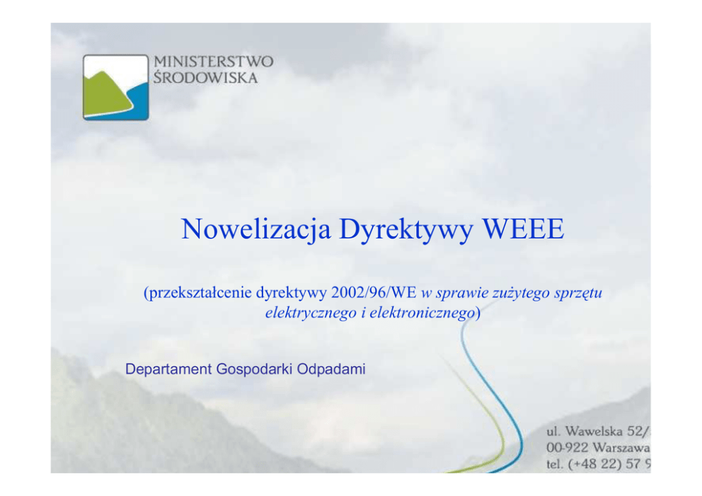 Nowelizacja Dyrektywy WEEE (przekształcenie dyrektywy 2002/96/WE w sprawie zużytego sprzętu elektrycznego i elektronicznego) Departament Gospodarki Odpadami Początki prac Prace rozpoczęte pod koniec 2008 r. Miały dotyczyć szybkiej procedury „przekształcenia” czyli wprowadzenia zmian tylko w niektórych artykułach. Ostatecznie – poprawki dotyczyły kluczowych zagadnień, które wydłużyły czas prac nad nimi. Zakres stosowania dyrektywy Przez 6 lat od wejścia w życie dyrektywy – dotychczasowy zakres zamknięty. Po 6 latach otwarty zakres dyrektywy – wszystko co spełnia wymogi definicji sprzętu z określonymi wyłączeniami. Dyrektywa odnosi się do każdego sprzętu elektrycznego i elektronicznego spełniającego definicję sprzętu. Załącznik I Przez 6 lat od wejścia w życie przepisów dyrektywy 10 grup; - dotychczasowy zakres stosowania - zamknięty Po 6 latach 6 grup: • Sprzęt działający na zasadzie wymiany temperatury; • Ekrany, monitory i sprzęt zawierający ekrany o powierzchni większej niż 100 m2; • Lampy; • Sprzęt wielkogabarytowy (powyżej 50 cm zewn. wymiary którykolwiek wymiar); • Sprzęt małogabarytowy (do 50 cm zewn. wymiarów); • Małogabarytowy sprzęt informatyczny i telekomunikacyjny (żaden z zewn. wymiarów nie przekracza 50 cm). Definicje – wprowadzający sprzęt Została doprecyzowana definicja wprowadzającego: podmiot, który wprowadza sprzęt na rynek danego państwa członkowskiego. Wprowadzona możliwość ustanowienia autoryzowanego przedstawiciela (art. 17). Prowadzenie rejestru Harmonizacja rejestrów pod względem zawartości, formatu oraz częstotliwości przekazywania informacji przez przedsiębiorców wprowadzających sprzęt do krajowych rejestrów. Możliwość wprowadzania informacji do rejestru elektronicznie. Poziomy zbierania zużytego sprzętu i sposób liczenia 3 – stopniowa droga dochodzenia do maksymalnych poziomów: • od dnia wejścia w życie przez 4 lata – dotychczasowe 4 kg/mieszkańca/rok (lub poziom z ostatnich 3 lat jeśli już osiągnięto 4 kg), • po 4 – latach 45% średniej masy sprzętu wprowadzonego na rynek w trakcie poprzednich lat, Poziomy zbierania zużytego sprzętu i sposób liczenia • po 7 latach – wybór: 65% średniej masy sprzętu wprowadzonego na rynek w trakcie poprzednich 3 lat, lub 85% masy wytwarzanego zużytego sprzętu. • dwuletnia derogacja (odroczenie) związana z osiągnięciem ostatecznego poziomu dla kilku państw członkowskich, w tym Polski. Poziom zbierania zużytego sprzętu – odpowiedzialność Za poziomy zbierania odpowiedzialne państwa członkowskie, przy zastosowaniu zasady odpowiedzialności wprowadzającego. Poziom zbierania obowiązywał będzie również w przypadku sprzętu pochodzącego z innych źródeł niż tylko gospodarstwa domowe. Poziomy odzysku i recyklingu Związane przede wszystkim ze zmianą liczby grup oraz z uwzględnieniem w ich wysokości. Kilka stopni dochodzenia do wyższych poziomów. Poziomy odzysku i recyklingu Przez pierwsze 3 lata od dnia wejścia w życie dyrektywy – obowiązywanie dotychczasowych poziomów odzysku i recyklingu, Dodano poziomy dla grupy 8, która do tej pory była wyłączona z obowiązku ich uzyskiwania, • po 3 latach poziomy zostaną zwiększone o 5%, • po 6 latach – zaczną obowiązywać w nowym układzie, dopasowane do 6 grup sprzętu. Bardzo mały sprzęt (very small volume waste) W kwestii zbierania wprowadzono rozwiązanie zwiększające dostępność punktów zbierania zużytego sprzętu dla mieszkańców – konieczność usytuowania w sklepach prowadzących sprzedaż sprzętu elektrycznego i elektronicznego na powierzchni (sprzedaży) wynoszącej 400 m2 lub w ich pobliżu PUNKTÓW ZBIERANIA zużytego sprzętu, któregokolwiek z wymiarów nie przekracza 25 cm, - bezpłatnie, - bez konieczności zakupu nowego sprzętu. Standardy Możliwość ustanowienia przez państwa członkowskie (art. 8 ust. 5) minimalnych standardów jakości dla przetwarzania zebranego zużytego sprzętu (wówczas konieczność poinformowania Komisji Europejskiej o ich ustanowieniu). KE – w ciągu 6 miesięcy od dnia wejścia w życie dyrektywy zwraca się do europejskich organizacji normalizacyjnych o opracowanie europejskich standardów przetwarzania zużytego sprzętu. Przemieszczanie Załącznik VI do dyrektywy – ma pomóc w ograniczeniu przemieszczania zużytego sprzętu jako sprzętu używanego, ale sprawnego. - obowiązek dla przewożącego posiadania dokumentacji potwierdzającej przewóz produktów, a nie odpadów, -3 przypadki braku konieczności posiadania wymaganych w załączniku VI dokumentów: -- przewóz w ramach naprawy pogwarancyjnej, -- przewóz używanego sprzętu przeznaczonego do użytku profesjonalnego w celu naprawy lub renowacji w krajach OECD, -przewóz zepsutego sprzętu do użytku profesjonalnego w celu analizy przyczyn awarii. Koniec prac nad dyrektywą • Cztery Trilogi (nieformalne spotkania PE, KE oraz Prezydencja Polska) - ostatni 20 grudnia 2011 r. – osiągnięte porozumie z PE, • 19 stycznia 2012 r. Parlament Europejski przegłosował nowelizację przepisów dyrektywy, • obecnie trwają prace prawników – lingwistów nad ostatecznym tekstem, celem jego zatwierdzenia przez Radę Unii Europejskiej, • państwa członkowskie – 18 miesięcy (od momentu opublikowania) na dostosowanie własnych przepisów do nowej dyrektywy. DZIEKUJĘ ZA UWAGĘ Departament Gospodarki Odpadami