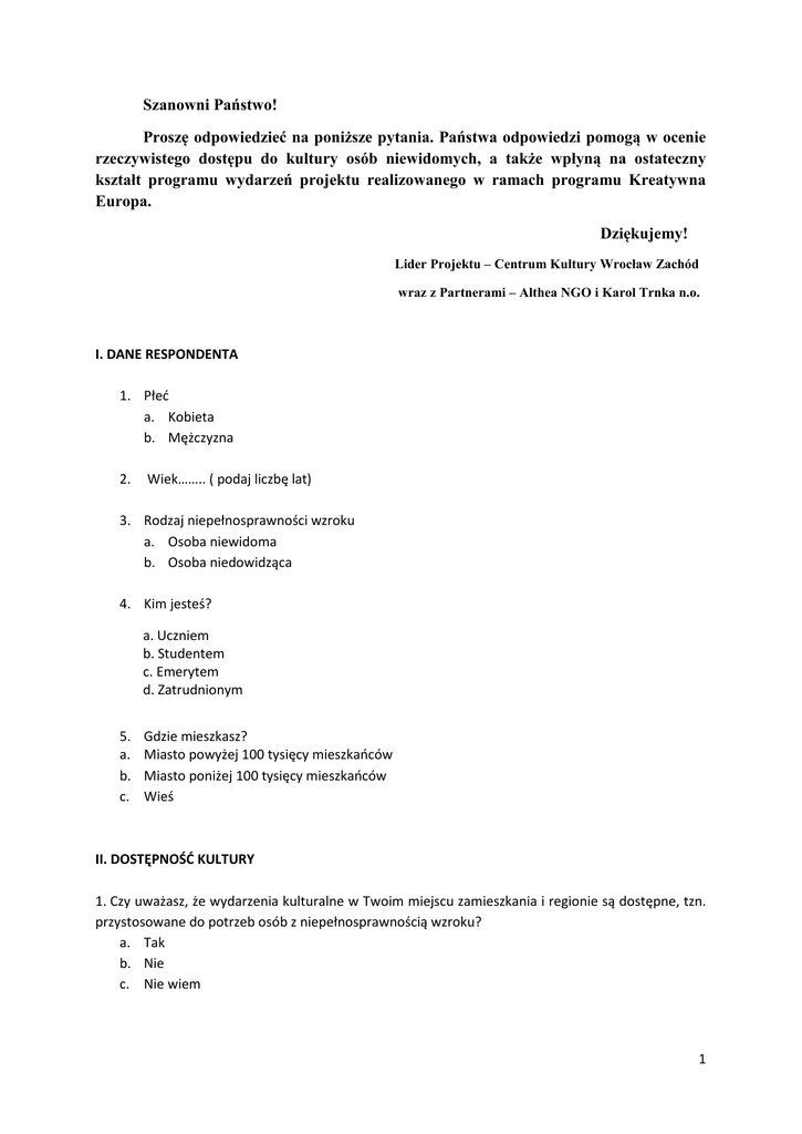 Szanowni Państwo! Proszę odpowiedzieć na poniższe pytania. Państwa odpowiedzi pomogą w ocenie rzeczywistego dostępu do kultury osób niewidomych, a także wpłyną na ostateczny kształt programu wydarzeń projektu realizowanego w ramach programu Kreatywna Europa. Dziękujemy! Lider Projektu – Centrum Kultury Wrocław Zachód wraz z Partnerami – Althea NGO i Karol Trnka n.o. I. DANE RESPONDENTA 1. Płeć a. Kobieta b. Mężczyzna 2. Wiek…….. ( podaj liczbę lat) 3. Rodzaj niepełnosprawności wzroku a. Osoba niewidoma b. Osoba niedowidząca 4. Kim jesteś? a. Uczniem b. Studentem c. Emerytem d. Zatrudnionym 5. a. b. c. Gdzie mieszkasz? Miasto powyżej 100 tysięcy mieszkańców Miasto poniżej 100 tysięcy mieszkańców Wieś II. DOSTĘPNOŚĆ KULTURY 1. Czy uważasz, że wydarzenia kulturalne w Twoim miejscu zamieszkania i regionie są dostępne, tzn. przystosowane do potrzeb osób z niepełnosprawnością wzroku? a. Tak b. Nie c. Nie wiem 1 2. Czy chętnie w nich uczestniczysz? a. tak b. nie Jeśli tak, to w jakich? a. Projekcje filmów, spektakle wystawy z audiodeskrypcją b. Koncerty, Kabarety c. Performance, sztuka ulicy d. Spotkania z twórcami e. Warsztaty artystyczne (m.in. teatralne, plastyczne, taneczne , muzyczne, filmowe) f. Inne (jakie?) …………………………………………………………………………………………………………………… ………………………………………………………………………………………………………………………………………… • Można podać więcej niż jedna odpowiedź 3. Czy czujesz się wykluczony z kultury ze względu na swoją niepełnosprawność wzroku? a. Tak b. Nie c. Nie wiem Jeśli tak, to dlaczego? …………………………………………………………………………………………………………………………………………………………… …………………………………………………………………………………………………………………………………………………………… ……………………………………………………………………………………………………………………………………………………… 4. Czy w Twoim miejscu zamieszkania i regionie organizowane są wydarzenia kulturalne z audiodeskrypcją (np. projekcje filmów, spektakle teatralne, wystawy, itp.)? a. Tak b. Nie c. Nie wiem 5. Z którymi udogodnieniami umożliwiającymi odbiór sztuki spotkałeś się ? a. Audiodeskrypcja (opis słowny) b. Opis alfabetem Braille’a c. Technika druku 3D – Didu (przestrzenne reprodukcje dzieł sztuki) d. Reliefy (płaskorzeźby odwzorowujące dzieła sztuki) e. Tyflografika (grafika wypukła wykorzystywana np. do tworzenia map) f. Możliwość dotykania eksponatów, np. w muzeum g. Aplikacje h. Nie spotkałam/łem się z żadnym z powyższych 2 • Można podać więcej niż jedną odpowiedź 6. Czy wydarzenia oferowane osobom z niepełnosprawnością wzroku są bezpłatne? a. Tak b. Nie c. Nie wiem Jeśli nie, to czy przysługuje zniżka na wydarzenia kulturalne? a. Tak b. Nie c. Nie wiem 7. Jak często uczestniczysz w wydarzeniach kulturalnych? a. Mniej niż raz w miesiącu b. 1-2 razy w miesiącu c. 3 lub więcej razy w miesiącu Jeśli mniej niż raz w miesiącu, to dlaczego? …………………………………………………………………………………………………………………………………………………………… …………………………………………………………………………………………………………………………………………………………… …………………………………………………………………………………………………………………………………………………………… III POTRZEBY I OCZEKIWANIA 1. Czy chciałbyś uczestniczyć w cyklicznych wydarzeniach kulturalnych z audiodeskrypcją dla osób niewidomych w miejscu zamieszkania i w regionie ? a. Tak b. Nie Jeśli tak, to w jakich? a. Regularne projekcje filmów z audiodeskrypcją b. Regularne spektakle teatralne z audiodeskrypcją c. Regularne wystawy dzieł sztuki z audiodeskrypcją d. Inne (jakie?) …………………………………………………………………………………………………………………………… ………………………………………………………………………………………………………………………………………… 2. Czy chciałbyś wziąć udział w warsztatach dla osób niewidomych i niedowidzących? Jeśli tak, to w jakich? a. Zajęcia/warsztaty artystyczne (m.in. teatralne, plastyczne, taneczne , muzyczne, filmowe) b. Inne ( jakie?)………………………………………………………………………………………………………………………….. ………………………………………………………………………………….……………………………………………………………. 3 3. Czy zajmujesz się twórczością artystyczną, tzn., czy tworzysz muzykę, poezję, czy tańczysz, śpiewasz, grasz, itd.? a. Tak b. nie (podaj rodzaj twórczości………………………………..) 4. a. b. c. d. Jeśli tak, to czy masz możliwość rozwijania swojej twórczości ? Występy publiczne Wsparcie fundacji (jakiej ……………………………..) Wsparcie instytucji kultury ( jakiej ……………………………….) Wsparcie organizacji rządowych i samorządowych ( jakich………………………..) 5. a. b. c. Jak często prezentujesz swoją twórczość? Sporadycznie Okazjonalnie Regularnie 6. Czego oczekujesz poprzez udział w działaniach kulturalnych ? a) b) c) d) e) f) Możliwości bezpłatnego korzystania z dóbr kultury Spędzania czasu wspólnie z innymi Zdobywania nowych doświadczeń Odkrywan