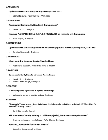 J.ANGIELSKI Ogólnopolski Konkurs Języka Angielskiego FOX 2012 Adam Makówka, Martyna Fira; IV miejsce J. FRANCUSKI Regionalny Konkurs „Dyktando z j. francuskiego” Paweł Rduch, I miejsce Konkurs PLUS PRES DE LA CULTURE FRANCAISE na recenzję w j. francuskim Anita Fidyka, I miejsce J. HISZPAŃSKI Ogólnopolski Konkurs Językowy na hiszpańskojęzyczną kartkę z pamiętnika „Día a Día” Karolina Szymiczek, I miejsce J. NIEMIECKI Międzyszkolny Konkurs Języka Niemieckiego Magdalena Sobczak, Aleksandra Mika, I miejsce J.ROSYJSKI Ogólnopolskie Dyktando z Języka Rosyjskiego Paweł Rduch, I miejsce Mariusz Krakowczyk, V miejsce J. WŁOSKI II Mikołajkowe Dyktando z Języka Włoskiego Aleksandra Kuczaty, Monika Małysa; I miejsce HISTORIA Olimpiada Tematyczna „Losy żołnierza i dzieje oręża polskiego w latach 1776–1864. Za wolność Waszą i naszą” Kamil Stempniak, laureat XII Powiatowy Turniej Wiedzy o Unii Europejskiej „Europa-nasz wspólny dom” Drużyna w składzie: Magda Rugor, Rafał Głomb; I miejsce Konkurs „Powstania śląskie 1919-1921” Radosław Romanek, VI miejsce GEOGRAFIA I Turniej Wiedzy o Powiecie Wodzisławskim „Nasz powiat-naszym miejscem w UE” Drużyna w składzie: Karolina Szymiczek, Natalia Skupień, I miejsce IX Powiatowy Konkurs Wiedzy o Regionie: Drużyna w składzie: Karolina Szymiczek, Natalia Skupień, Zuzanna Dobisz: II miejsce MATEMATYKA Ogólnopolski Konkurs Matematyczny „Oxford Plus” Kamila Wala, Robert Turliński; laureaci I stopnia Aleksandra Herud, Adam Makówka, Klaudia Kłosok, Daniel Rodzoń, Dawid Bobrzyk; laureaci II stopnia Konkurs Alfik Matematyczny Aleksandra Herud, Adam Makówka; w kategorii junior: laureaci Marta Lubszczyk, Robert Turliński, Kamila Wala; w kategorii junior: bardzo dobry wynik Monika Palarczyk, Justyna Duda, Tomasz Jurczyk, Rafał Rozwadowski, Paweł Stabla, Konrad Nowakowski, Jonasz Dragon, Daniel Rodzoń, Dawid Bobrzyk; w kategorii student: bardzo dobry wynik XIII Powszechny Konkurs Matematyczny organizowany przez Politechnikę Warszawską Jonasz Dragon, Konrad Nowakowski, Daniel Rodzoń; finaliści V Ogólnopolska Olimpiada o „Diamentowy Indeks AGH” z matematyki Monika Palarczyk, laureatka Ogólnopolski Konkurs MAT 2012 Adam Makówka, w kategorii junior: I miejsce Marta Lubszczyk, w kategorii junior: II miejsce Aleksandra Herud, w kategorii junior: III miejsce Monika Palarczyk, Konrad Nowakowski, w kategorii student: laureaci Robert Turliński, Jakub Płonka, Justyna Duda, Tomasz Jurczyk, Paweł Stabla, Piotr Kuboń, Jonasz Dragon, Daniel Rodzoń, Dawid Bobrzyk; w kategorii student: bardzo dobry i dobry wynik Powiatowy Konkurs Matematyczny klas I i II Kamila Wala, w kategorii klas I: p. podstawowy: I miejsce Dorota Psota, w kategorii klas I: p. podstawowy: I miejsce Adam Makówka, w kategorii klas I: p. rozszerzony: I miejsce Aleksandra Herud, w kategorii klas I: p. rozszerzony: II miejsce Robert Turliński, w kategorii klas I: p. rozszerzony: II miejsce Klaudia Kłosok, w kategorii klas II: p. podstawowy: I miejsce Monika Palarczyk, w kategorii klas II: p. rozszerzony: I miejsce Międzynarodowy Konkurs Kangur Matematyczny 2012 Adam Makówka w kategorii Junior: II miejsce Aleksandra Herud w kategorii Junior: V miejsce Kamila Wala, Marta Lubszczyk, Robert Turliński, Dominika Kowalczyk, Dorota Psota, Wojtek Polnik, Monika Palarczyk, Paweł Stabla, Aleksandra Duda, Rafał Rozwadowski, Piotr Kuboń, Jonasz Dragon, Daniel Rodzoń, Konrad Nowakowski: w kategorii Student: wyróżnienia Matematyczne Mistrzostwa Polski Aleksandra Herud, w kategorii kl. I: III miejsce Monika Palarczyk, w kategorii kl. II: IV miejsce Jonasz Dragon, w kategorii kl. III: IX miejsce FIZYKA XXXIV Wojewódzki Drużynowy Turniej z Fizyki o Puchar Dyrektora Pałacu Młodzieży w Katowicach Drużyna w składzie: Paweł Szulik, Tomasz Jurczyk, Paweł Stabla; finaliści XVIII Ogólnopolski Konkurs na Pracę „Fizyka a Ekologia” Zespół w składzie: Gabriela Figuła, Sara Wacławiec, laureatki Zespół w składzie: Kamila Sądel, Justyna Pustuła, laureatki Polsko- Ukraiński Konkurs Fizyczny „Lwiątko 2012” Kamila Wala, tytuł TAON Adam Makówka, tytuł TAON Paweł Szulik, wyróżnienie III stopnia XXXIII Wojewódzki Dwuosobowy Turniej z Fizyki dla klas I ponadgimnazjalnych Drużyna w składzie: Marta Lubszczyk, Martyna Fira; finalistki CHEMIA XXVII Ogólnopolski Konkurs Chemiczny organizowany przez Politechnikę Warszawską Konrad Nowakowski, finalista Ogólnopolski Konkurs Chemiczny organizowany przez Politechnikę Śląską Konrad Nowakowski, VII miejsce BIOLOGIA XLI Olimpiada Biologiczna Zuzanna Duda, Beata Grzegorzek; laureatki eliminacji okręgowych Wojewódzki Konkurs “W świecie roślin i zwierząt” Karol Cichy, V miejsce Małgorzata Hołomek, X miejsce IX edycja Olimpiady Wiedzy. Biologia-Oxford. Plus Zuzanna Duda, laureatka I stopnia z wyróżnieniem Karol Cichy, laureat I stopnia Hanna Tatarczyk, Małgorzata Hołomek, Michał Bogocz; laureaci III stopnia Anna Wita, Błażej Donat, Justyna Pustuła, Maksym Frączek, Izabela Żurek; laureat IV stopnia Monika Szczygieł, Sara Sowa, Klaudia Kłosok, Dominika Rzepiszczak; laureat V stopnia Ogólnopolski Konkurs EKO-PLANETA Mateusz Grzegoszczyk, wyróżnienie za bardzo dobry wynik VIII Powiatowy Konkurs „Higiena i Profilaktyka Chorób Człowieka” Drużyna w składzie: Katarzyna Pielorz, Hanna Kalarus, Mateusz Grzegoszczyk; I miejsce XIV Powiatowy Konkurs Ekologiczny Drużyna w składzie: Karol Cichy, Michał Bogocz, Dominika Rzepiszczak; I miejsce Drużyna w składzie: Katarzyna Pielorz, Wiktoria Stencel, Mateusz Grzegoszczyk; III miejsce RELIGIA VII Konkurs Religijny "Pokolenie Jana Pawła II" Beata Grzegorzek, I miejsce VIII Ogólnopolski Konkurs Papieski Beata Grzegorzek, II miejsce