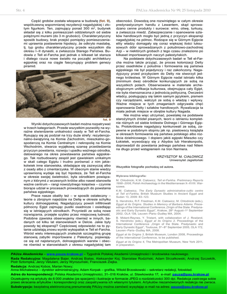 Str. 4 PAUza Akademicka Nr 99, 25 listopada 2010 Część grobów została wkopana w budowlę (fot. 9), współczesną wspomnianej rezydencji nagadyjskiej i złotym figurkom. Ten, zajmujący ponad 300 m2, budynek składał się z kilku pomieszczeń oddzielonych od siebie potężnymi murami (do 3 m grubości). Charakterystyczny sposób budowy, brak przejść pomiędzy pomieszczeniami uprawnia postawienie hipotezy, że odkryto mastabę, tj. typ grobu charakterystyczny przede wszystkim dla okresu I–II dynastii, a zwłaszcza Starego Państwa. Budowla z Tell el-Farcha jest jednak o kilkaset lat starsza i dlatego rzuca nowe światło na początki architektury egipskiej oraz na ciągle fascynujący problem genezy piramid. fot. 9 Wyniki dotychczasowych badań można rozpatrywać w trzech kategoriach. Przede wszystkim pozwoliły na wyraźne stwierdzenie unikalności osady w Tell el-Farcha. Rysujący się jej podział na trzy duże strefy: rezydencjonalno-świątynną na Komie Zachodnim, mieszkalno-gospodarczą na Komie Centralnym i nekropolię na Komie Wschodnim, stwarza wyjątkową szansę prześledzenia przyczyn powstania, rozwoju i upadku ważnego ośrodka, datowanego na okres powstawania państwa egipskiego. Tak rozbudowany zespół jest zjawiskiem unikalnym w skali całego Egiptu i trudno porównać z nim jakiekolwiek inne stanowiska, składające się zazwyczaj albo z osady albo z cmentarzyska. W obecnym stanie wiedzy uprawnioną wydaje się być hipoteza, że Tell el-Farcha w okresie swojej świetności, była ośrodkiem powiązanym z którymś z wczesnych królów albo nawet stanowiła ważne centrum – rangi nowożytnego księstwa – czynnie biorące udział w procesach prowadzących do powstania państwa egipskiego. Prace nasze obaliły też – w sposób ostateczny – teorie o zbrojnym najeździe na Deltę w okresie schyłku kultury dolnoegipskiej. Nagadyjczycy powoli infiltrowali północny Egipt zajmując pustki osadnicze i osiedlając się w istniejących ośrodkach. Przynieśli ze sobą nowe rozwiązania, przejęte szybko przez miejscową ludność. Podobne zjawiska obserwujemy również w innych, badanych od kilku lat stanowiskach w Delcie. Jakie były powody tej ekspansji? Częściowej odpowiedzi na to pytanie udzielają znowu wyniki wykopalisk w Tell el-Farcha. Wśród wielu interesujących znalezisk szczególną grupę stanowią zabytki importowane z Palestyny, pojawiające się od najstarszych, dolnoegipskich warstw i obecne również w stanowiskach z okresu nagadyjskiej tam obecności. Dowodzą one rozwiniętego w całym okresie predynastycznym handlu z Lewantem, skąd sprowadzano cenne produkty i surowce: wino, oliwę, turkusy, a zwłaszcza miedź. Zabezpieczanie i opanowanie szlaków handlowych mogło być jedną z przyczyn ekspansji nagadyjskiej na północ. Rodzące się w Górnym Egipcie elity władzy domagały się coraz większej ilości luksusowych dóbr sprowadzanych z południowo-zachodniej Azji – w niektórych grobach z tego czasu znaleziono po kilkaset importowanych naczyń palestyńskich. Na podstawie dotychczasowych badań w Tell el-Farcha można także przyjąć, że proces kolonizacji Delty przez osadników z południa i formowania się państwa egipskiego nie był pojedynczy i raz zakończony. Nagadyjczycy przed przybyciem do Delty nie stworzyli jednego królestwa. W Górnym Egipcie nadal istniało kilka (minimum dwa) ośrodków konkurujących ze sobą na wszystkich polach. Obserwowana w materiale archeologicznym unifikacja kulturowa, obejmująca cały Egipt, nie była równoznaczna z jednością polityczną. Ówcześni władcy, posługujący się takim samym językiem, pismem czy narzędziami, walczyli ze sobą o władzę i wpływy. Ważne miejsce w tych zmaganiach odgrywała chęć opanowania Delty i szlaków handlowych. Rywalizacja ta miała jednak miejsce w obrębie kultury Nagada. Nie można więc utrzymać, powstałej na podstawie starożytnych źródeł pisanych, teorii o istnieniu kompletnie różnych od siebie królestw Dolnego i Górnego Egiptu. Protokrólowie nagadyjscy konkurowali ze sobą, zapewne w podobnym stopniu jak np. piastowscy książęta w okresach formowania się państwa polskiego albo rozbicia dzielnicowego. I dopiero jakiś egipski Mieszko czy Łokietek, wywodzący się z Abydos lub Hierakonpolis, doprowadził do powstania jednego państwa nad Nilem na długo przed wstąpieniem na tron Narmera. KRZYSZTOF M. CIAŁOWICZ Uniwersytet Jagielloński Wszystkie fotografie pochodzą od autora. Wybrana bibliografia: M. Chłodnicki, K.M. Ciałowicz, Tell el-Farkha. Preliminary Reports 1998–2006, Polish Archaeology in the Mediterranean X–XVIII. Warszawa. K.M. Ciałowicz, The Early Dynastic administrative-cultic centre at Tell el-Farkha, British Museum Studies in Ancient Egypt and Sudan 13, 2009: 83–123. S. Hendrickx, R.F. Friedman, K.M. Ciałowicz, M. Chłodnicki (eds.), Egypt at its Origins. Studies in Memory of Barbara Adams. Proceedings of the International Conference „Origin of the State. Predynastic and Early Dynastic Egypt”, Krakow, 28th August–1st September 2002, OLA 138, Leuven–Paris–Dudley MA, 2004. B. Midant-Reynes, Y. Tristant, with collaboration of J. Rowland, S. Hendrickx (eds.), Egypt at its Origins 2, Proceedings of the International Conference „Origin of the State. Predynastic and Early Dynastic Egypt”, Toulouse, 5th –8th September 2005, OLA 172, Leuven–Paris–Dudley MA, 2008. Egypt at its Origins 3, British Museum, London 2008, Proceedings of the International Conference, to be published. Egypt at its Origins 4, The Metropolitan Museum, New York 2011, in preparation. PAUza Akademicka – www.pauza.krakow.pl – Tygodnik Polskiej Akademii Umiejętności i środowiska naukowego. Rada Redakcyjna: Magdalena Bajer, Andrzej Białas, Aleksander Koj, Stanisław Rodziński, Adam Strzałkowski, Andrzej Szczeklik, Piotr Sztompka, Jerzy Vetulani, Jerzy Wyrozumski, Franciszek Ziejka. Redakcja: Andrzej Kobos, M