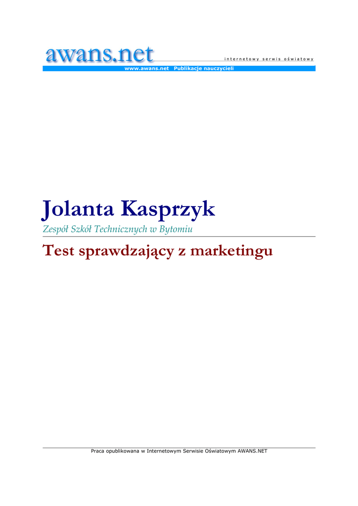 www.awans.net Publikacje nauczycieli Jolanta Kasprzyk Zespół Szkół Technicznych w Bytomiu Test sprawdzający z marketingu Praca opublikowana w Internetowym Serwisie Oświatowym AWANS.NET Test sprawdzający z marketingu Marketing jest nieodłącznym aspektem gospodarki rynkowej XXI wieku. Obecnie podaż produktów przewyższa istniejący popyt. Przedsiębiorstwa muszą więc działać doskonale, jeśli mają odnieść sukces, a badania dowiodły, że kluczem do sukcesu przedsiębiorstw jest znajomość potrzeb ich klientów i zaspokojenie ich. Marketing zaś jest funkcją przedsiębiorstwa odpowiedzialną za wybór klienta, do którego należy dotrzeć oraz najlepszego sposobu zaspokojenia jego potrzeb i pragnień w sposób konkurencyjny i zyskowny. Młodzież ucząca się marketingu musi dobrze znać narzędzia marketingowe, żeby wejść do gospodarki z pełną świadomością jej szans i zagrożeń. Aby ocenić znajomość podstawowych zagadnień marketingowych na poziomie szkoły średniej, można posłużyć się poniższym testem jednokrotnego wyboru. Można traktować go jak badanie wyników nauczania. Test jest podzielony na 6 grup tematycznych (po 5 pytań z każdej): - istota marketingu, segmentacja rynku; - badania marketingowe; - produkt; - cena; - dystrybucja; - promocja. Pytanie nr 31 jest pytaniem otwartym (dodatkowym), które może zredukować jeden błąd w pytaniach zasadniczych. Aby pozytywnie zaliczyć test, należy uzyskać 51% prawidłowych odpowiedzi. Skala oceniania 30 – 28 punktów 27 – 24 punktów 23 – 20 punktów 19 – 16 punktów bardzo dobry dobry dostateczny dopuszczający Jolanta Kasprzyk ....................................................... ..............................., dnia ........................ Imię i nazwisko miejscowość ....................................................... klasa Test sprawdzający z marketingu Tylko jedna odpowiedź jest prawidłowa. Proszę zaznaczyć ją kółkiem. 1. W marketingu nowoczesnym punktem wyjścia jest: a. Produkt b. Klient (rynek) c. Konkurent d. Makro i mikro-otoczenie 2. Który z elementów nie należy do marketingu mix (tzw. 4P) a. Cena b. Produkt c. Segmentacja d. Promocja 3. a. b. c. d. Na otoczenie mikro w przedsiębiorstwie NIE wpływają: System celny Nabywcy Banki Pośrednicy 4. a. b. c. d. Klienci, którzy nie kupują produktu z przyczyn usuwalnych zaliczani są do rynku: Absolutnego Względnego Usuniętego Rzeczywistego 5. a. b. c. d. Jednorodna grupa nabywców o podobnych zainteresowaniach produktami to: Segmentacja rynku Strategia klientów Struktura klientów Segment rynku 6. a. b. c. d. Badania jakościowe odpowiadają na pytanie: Czemu? Gdzie? Jak? Dlaczego? 7. a. b. c. d. Do metod zbierania danych pierwotnych NIE zaliczamy: Materiały statystyczne Badania panelowe Wywiad Badania motywacyjne 8. Ciągłe lub systematyczne zbieranie informacji od jednostek o stałym przekroju reprezentacji to badanie: a. Ankietowe b. Motywacyjne c. Panelowe d. Eksperymentalne 9. a. b. c. d. Chiński portret to: Technika będąca modyfikacją „testu niedokończonych zdań” Metoda personalizująca przedmiot i nadająca mu cechy ludzkie Technika polegająca na dokończeniu wcześniej przygotowanych wypowiedzi Metoda polegająca na odpowiedzi na szereg pytań 10. Który z przykładów obrazuje technikę zbierania informacji tzw. „eksperyment rynkowy” a. Zmiana opakowań niektórych produktów i obserwacja jak to wpływa na ich zakup. b. Wysłanie do kilku tysięcy ludzi formularza ankietowego c. Obserwacja grupy ludzi w sztucznie stworzonych warunkach d. Comiesięczne zbieranie informacji o dokonywanych przez klientów zakupach 11. Do dóbr częstego zakupu NIE zaliczamy: a. Usługi fryzjerskie b. Żywność c. Gazety d. Meble 12. Znak towarowy to: a. Zarejestrowana marka b. Nazwa produktu c. Znak jakości produktu d. Logo firmy 13. Markowanie polegające na nadaniu każdej linii produkcyjnej innej nazwy to: a. Markowanie mieszane b. Markowanie rodzinne c. Markowanie różne d. Markowanie indywidualne 14. Strategia nowego produktu polegająca na wprowadzeniu na rynek imitacji produktów konkurencyjnych nosi nazwę” a. „renowacja” starych produktów b. zakup firm lub marek c. „my też” d. strategia „imitacji” 15. W drugiej fazie cyklu życia produktu: a. cena-b. wysoka konkurenci-wielu b. cena- niska konkurenci-kilku c. cena-niższa konkurenci-coraz więcej d. cena-wysoka konkurenci-wielu klienci-maruderzy klienci- innowatorzy klienci-pierwsi naśladowcy klienci-innowatorzy 16. Gdy granica rentowności równa jest np. 30 szt. To znaczy: a. że 30 szt. sprzedanych produktów przynosi nam już zysk b. że 30 szt. produktów zostało nam w magazynie c. że gdy sprzedamy 30 szt. osiągniemy rentowność zerową d. że gdy sprzedamy 30 szt. osiągniemy rentowność maksymalną 17. Cena „wygodna” pojawia się w podejściu do problemu ustalania cen: a. marketingowca b. księgowego c. ekonomisty d. biznesmena 18. Którą strategię ustalania cen należy wybrać dla produktu, który jest wybitną nowością i zaspakaja potrzeby klientów w sposób istotnie doskonalszy: a. ceny dostosowanej do konkurencji b. ceny „zbierania śmietanki” c. ceny minimalnej d. ceny penetracyjnej 19. Co oznacza zapis skonta „3/8 net 28” a. nabywca uzyskuje 3 % rabatu jeśli zapłaci w ciągu 8 dni. Jeśli tego terminu nie dotrzyma musi zapłacić kwotę bez zniżki w ciągu 28 dni b. nabywca uzyskuje 8 % rabatu jeśli zapłaci w ciągu 3 dni. Jeśli tego terminu nie dotrzyma musi zapłacić kwotę bez zniżki w ciągu 28 dni c. nabywca uzyskuje 28 % rabatu jeśli zapłaci w ciągu 3 dni. Jeśli tego terminu nie dotrzyma musi zapłacić kwotę bez zniżki w ciągu 8 dni d. nabywca uzyskuje 3 % rabatu jeśli zapłaci w ciągu 28 dni. Jeśli tego terminu nie dotrzyma musi zapłacić kwotę bez zniżki w ciągu 8 dni 20. Rabat, który polega na sprzedawaniu produktów po niższej cenie w określonych region