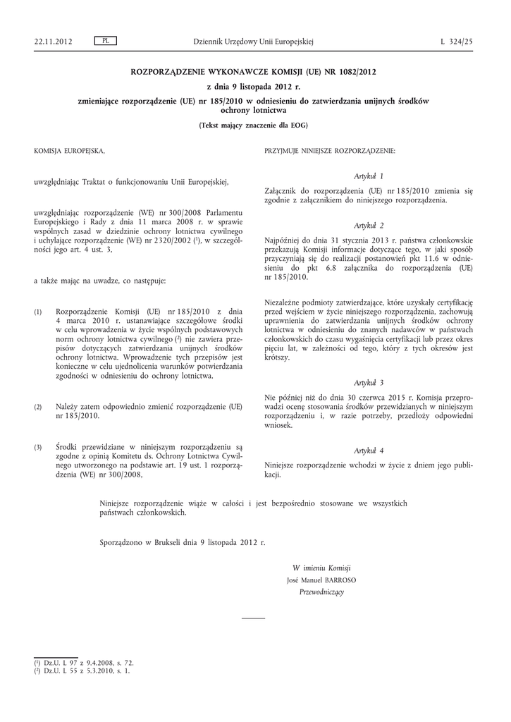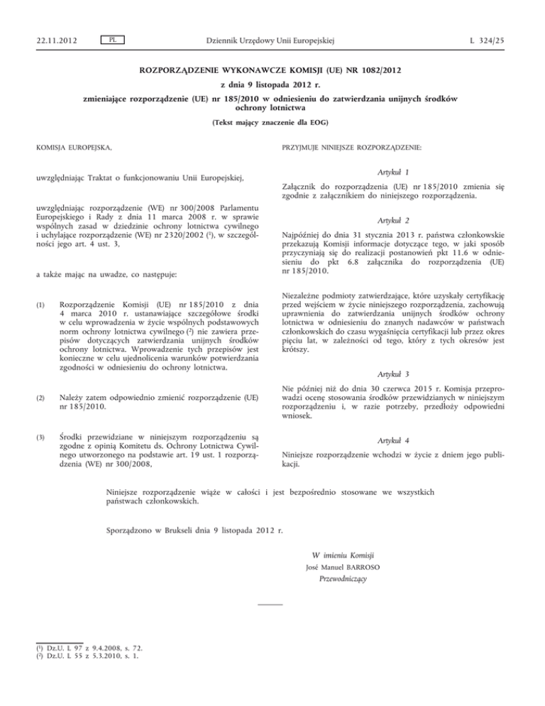22.11.2012 PL Dziennik Urzędowy Unii Europejskiej L 324/25 ROZPORZĄDZENIE WYKONAWCZE KOMISJI (UE) NR 1082/2012 z dnia 9 listopada 2012 r. zmieniające rozporządzenie (UE) nr 185/2010 w odniesieniu do zatwierdzania unijnych środków ochrony lotnictwa (Tekst mający znaczenie dla EOG) KOMISJA EUROPEJSKA, uwzględniając Traktat o funkcjonowaniu Unii Europejskiej, uwzględniając rozporządzenie (WE) nr 300/2008 Parlamentu Europejskiego i Rady z dnia 11 marca 2008 r. w sprawie wspólnych zasad w dziedzinie ochrony lotnictwa cywilnego i uchylające rozporządzenie (WE) nr 2320/2002 (1), w szczegól ności jego art. 4 ust. 3, a także mając na uwadze, co następuje: (1) Rozporządzenie Komisji (UE) nr 185/2010 z dnia 4 marca 2010 r. ustanawiające szczegółowe środki w celu wprowadzenia w życie wspólnych podstawowych norm ochrony lotnictwa cywilnego (2) nie zawiera prze pisów dotyczących zatwierdzania unijnych środków ochrony lotnictwa. Wprowadzenie tych przepisów jest konieczne w celu ujednolicenia warunków potwierdzania zgodności w odniesieniu do ochrony lotnictwa. (2) Należy zatem odpowiednio zmienić rozporządzenie (UE) nr 185/2010. (3) Środki przewidziane w niniejszym rozporządzeniu są zgodne z opinią Komitetu ds. Ochrony Lotnictwa Cywil nego utworzonego na podstawie art. 19 ust. 1 rozporzą dzenia (WE) nr 300/2008, PRZYJMUJE NINIEJSZE ROZPORZĄDZENIE: Artykuł 1 Załącznik do rozporządzenia (UE) nr 185/2010 zmienia się zgodnie z załącznikiem do niniejszego rozporządzenia. Artykuł 2 Najpóźniej do dnia 31 stycznia 2013 r. państwa członkowskie przekazują Komisji informacje dotyczące tego, w jaki sposób przyczyniają się do realizacji postanowień pkt 11.6 w odnie sieniu do pkt 6.8 załącznika do rozporządzenia (UE) nr 185/2010. Niezależne podmioty zatwierdzające, które uzyskały certyfikację przed wejściem w życie niniejszego rozporządzenia, zachowują uprawnienia do zatwierdzania unijnych środków ochrony lotnictwa w odniesieniu do znanych nadawców w państwach członkowskich do czasu wygaśnięcia certyfikacji lub przez okres pięciu lat, w zależności od tego, który z tych okresów jest krótszy. Artykuł 3 Nie później niż do dnia 30 czerwca 2015 r. Komisja przepro wadzi ocenę stosowania środków przewidzianych w niniejszym rozporządzeniu i, w razie potrzeby, przedłoży odpowiedni wniosek. Artykuł 4 Niniejsze rozporządzenie wchodzi w życie z dniem jego publi kacji. Niniejsze rozporządzenie wiąże w całości i jest bezpośrednio stosowane we wszystkich państwach członkowskich. Sporządzono w Brukseli dnia 9 listopada 2012 r. W imieniu Komisji José Manuel BARROSO Przewodniczący (1) Dz.U. L 97 z 9.4.2008, s. 72. (2) Dz.U. L 55 z 5.3.2010, s. 1. PL L 324/26 Dziennik Urzędowy Unii Europejskiej ZAŁĄCZNIK A. W załączniku do rozporządzenia (UE) nr 185/2010 wprowadza się następujące zmiany: 1) w pkt 6.3.1.2 lit. b) wprowadza się następujące zmiany: a) w akapicie pierwszym tekst „niezależny podmiot zatwierdzający” zastępuje się tekstem „unijny podmiot zatwier dzający ds. ochrony lotnictwa”; b) w akapicie drugim tekst „niezależny podmiot zatwierdzający” zastępuje się tekstem „unijny podmiot zatwier dzający ds. ochrony lotnictwa”; 2) w pkt 6.4.1.2 lit. b) wprowadza się następujące zmiany: a) w akapicie pierwszym tekst „niezależny podmiot zatwierdzający” zastępuje się tekstem „unijny podmiot zatwier dzający ds. ochrony lotnictwa”; b) w akapicie drugim tekst „niezależny podmiot zatwierdzający” zastępuje się tekstem „unijny podmiot zatwier dzający ds. ochrony lotnictwa”; c) w akapicie trzecim tekst „niezależny podmiot zatwierdzający” zastępuje się tekstem „unijny podmiot zatwier dzający ds. ochrony lotnictwa”; d) w akapicie piątym tekst „niezależny podmiot zatwierdzający” zastępuje się tekstem „unijny podmiot zatwier dzający ds. ochrony lotnictwa”. B. Pkt 6.8 otrzymuje brzmienie: „6.8. ZABEZPIECZENIE ŁADUNKU LUB POCZTY PRZYWOŻONYCH DO UNII Z PAŃSTW TRZECICH 6.8.1. Wyznaczanie przewoźników lotniczych 6.8.1.1. Każdy przewoźnik lotniczy przywożący ładunek lub pocztę z portu lotniczego w państwie trzecim niewy mienionym w dodatku 6-F w celu transferu, tranzytu lub rozładunku w dowolnym porcie lotniczym objętym zakresem rozporządzenia nr (WE) nr 300/2008 zostaje wyznaczony jako „przewoźnik ładunków lotniczych lub poczty lotniczej prowadzący przewozy z portu lotniczego państwa trzeciego do Unii” (ACC3): a) przez właściwy organ państwa członkowskiego, które wydało przewoźnikowi certyfikat przewoźnika lotniczego; b) przez właściwy organ państwa członkowskiego wymienionego w załączniku do rozporządzenia Komisji (WE) nr 748/2009 (1), zmienionego rozporządzeniem (UE) nr 394/2011 (2) w sprawie wykazu opera torów statków powietrznych, którzy wykonywali działalność lotniczą wymienioną w załączniku I do dyrektywy 2003/87/WE Parlamentu Europejskiego i Rady (3), poczynając od dnia 1 stycznia 2006 r., w przypadku przewoźników lotniczych, którzy nie posiadają certyfikatu przewoźnika lotniczego wyda nego przez państwo członkowskie; c) przez właściwy organ państwa członkowskiego, w którym przewoźnik lotniczy ma swoją główną bazę operacyjną na terenie Unii lub jakikolwiek właściwy organ unijny w drodze uzgodnienia z tym właściwym organem, w przypadku przewoźników lotniczych, którzy nie posiadają certyfikatu przewoź nika lotniczego wydanego przez państwo członkowskie i którzy nie zostali ujęci w wykazie w załączniku do rozporządzenia (WE) nr 748/2009. 6.8.1.2. Wyznaczenie przewoźnika lotniczego jako ACC3 w odniesieniu do prowadzonych przez niego przewozów ładunków lub poczty z portu lotniczego, dla którego wymagane jest ACC3 (zwanych dalej »odpowiednimi przewozami ładunków«), następuje w oparciu o: a) wyznaczenie osoby ponoszącej całościową odpowiedzialność za wyk