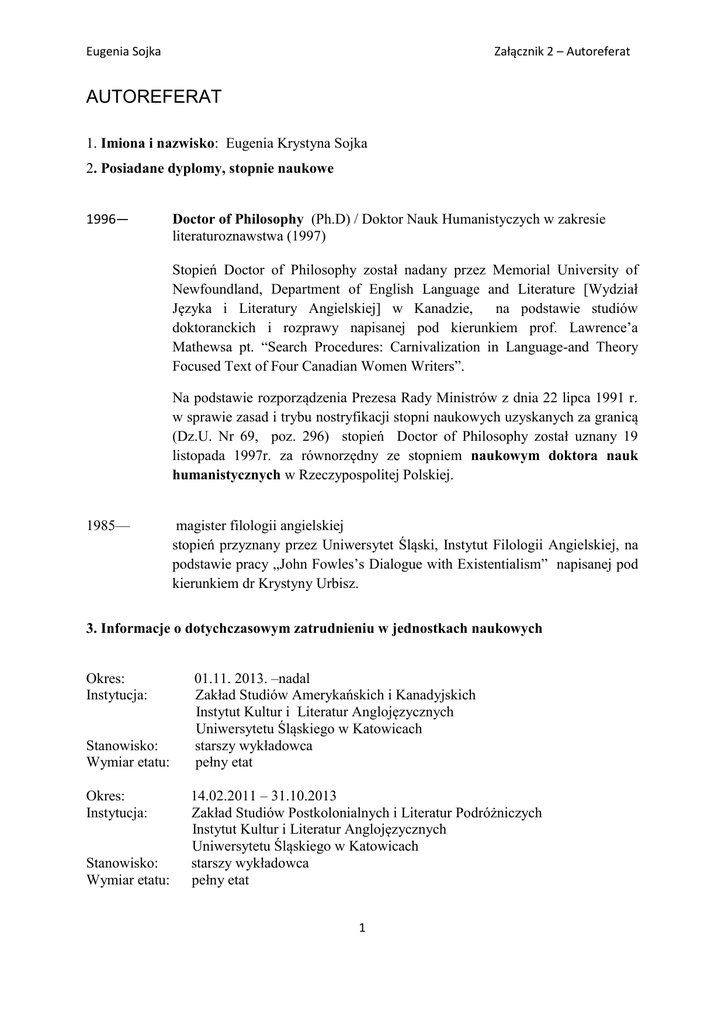 Eugenia Sojka Załącznik 2 – Autoreferat AUTOREFERAT 1. Imiona i nazwisko: Eugenia Krystyna Sojka 2. Posiadane dyplomy, stopnie naukowe 1996— Doctor of Philosophy (Ph.D) / Doktor Nauk Humanistyczych w zakresie literaturoznawstwa (1997) Stopień Doctor of Philosophy został nadany przez Memorial University of Newfoundland, Department of English Language and Literature [Wydział Języka i Literatury Angielskiej] w Kanadzie, na podstawie studiów doktoranckich i rozprawy napisanej pod kierunkiem prof. Lawrence’a Mathewsa pt. “Search Procedures: Carnivalization in Language-and Theory Focused Text of Four Canadian Women Writers”. Na podstawie rozporządzenia Prezesa Rady Ministrów z dnia 22 lipca 1991 r. w sprawie zasad i trybu nostryfikacji stopni naukowych uzyskanych za granicą (Dz.U. Nr 69, poz. 296) stopień Doctor of Philosophy został uznany 19 listopada 1997r. za równorzędny ze stopniem naukowym doktora nauk humanistycznych w Rzeczypospolitej Polskiej. 1985— magister filologii angielskiej stopień przyznany przez Uniwersytet Śląski, Instytut Filologii Angielskiej, na podstawie pracy „John Fowles’s Dialogue with Existentialism” napisanej pod kierunkiem dr Krystyny Urbisz. 3. Informacje o dotychczasowym zatrudnieniu w jednostkach naukowych Okres: Instytucja: Stanowisko: Wymiar etatu: Okres: Instytucja: Stanowisko: Wymiar etatu: 01.11. 2013. –nadal Zakład Studiów Amerykańskich i Kanadyjskich Instytut Kultur i Literatur Anglojęzycznych Uniwersytetu Śląskiego w Katowicach starszy wykładowca pełny etat 14.02.2011 – 31.10.2013 Zakład Studiów Postkolonialnych i Literatur Podróżniczych Instytut Kultur i Literatur Anglojęzycznych Uniwersytetu Śląskiego w Katowicach starszy wykładowca pełny etat 1 Eugenia Sojka Załącznik 2 – Autoreferat Okres: Instytucja: 01.06. 2009 - 13.02.2011 Zakład Studiów Postkolonialnych i Literatur Podróżniczych Instytut Kultur i Literatur Anglojęzycznych Uniwersytetu Śląskiego w Katowicach Stanowisko: adiunkt Wymiar etatu: pełny etat Okres: Instytucja: 01.02.2003- 31.05.2009 Zakład Literatur Anglojęzycznych i Studiów Postkolonialnych Instytut Kultury i Literatury Brytyjskiej i Amerykańskiej Uniwersytetu Śląskiego w Katowicach Stanowisko: adiunkt Wymiar etatu: pełny etat Okres: Instytucja: 1.10.1998-31.01.2003 Zakład Teorii Literatury i Kultury Instytut Kultury i Literatury Brytyjskiej i Amerykańskiej Uniwersytetu Śląskiego w Katowicach Stanowisko: adiunkt Wymiar etatu: pełny etat 16.02.1998 – 30.09.1998 Zakład Kultury i Literatury Brytyjskiej Instytut Kultury i Literatury Brytyjskiej i Amerykańskiej Uniwersytetu Śląskiego w Katowicach Stanowisko: adiunkt Wymiar etatu: ½ etatu Okres: Instytucja: Okres: Instytucja: 1.10.1997 - 15.02. 1998 Zakład Kultury i Literatury Brytyjskiej Instytut Kultury i Literatury Brytyjskiej i Amerykańskiej Uniwersytetu Śląskiego w Katowicach Wymiar etatu: godziny zlecone Okres: Instytucja: Stanowisko: Okres: Instytucja: Stanowisko: Wymiar: 01.10.1998 - 30.06. 1999 01.10. 1997 - 30.06. 1998 Katedra Filologii Angielskiej Uniwersytet Mikołaja Kopernika w Toruniu umowa o dzieło 04.09. 1989 – 30.09. 1997 (z przerwami na semestr letni) Department of English Language and Literature [Wydział Języka i Literatury Angielskiej] Memorial University of Newfoundland, Kanada wykładowca kontraktowy kontrakty semestralne 2 Eugenia Sojka Okres: Instytucja : Stanowisko: Wymiar: Okres: Instytucja : Stanowisko: Wymiar: Załącznik 2 – Autoreferat 01.10.1986 - 30.09.1988 Zakład Historii Literatury Angielskiej i Amerykańskiej Instytut Filologii Angielskiej, Wydział Filologiczny Uniwersytetu Śląskiego w Katowicach asystent naukowo-dydaktyczny pełny etat 01.10.1985-30.09.1986 Zakład Historii Literatury Angielskiej i Amerykańskiej Instytut Filologii Angielskiej, Wydział Filologiczny Uniwersytetu Śląskiego w Katowicach asystent stażysta naukowo-dydaktyczny pełny etat 4. Wskazanie osiągnięcia wynikającego z art. 16 ust. 2 ustawy z dnia 14 marca 2003 r. o stopniach naukowych i tytule naukowym oraz o stopniach i tytule w zakresie sztuki (Dz. U. nr 65, poz. 595 ze zm.): a) Tytuł osiągnięcia naukowego Jednotematyczny cykl publikacji, poświęcony tematyce kanadyjskich literatur i kultur mniejszościowych, zatytułowany: Wizje i rewizje paradygmatów kanadyjskości w kontekście angielskojęzycznych literackich i kulturowych dyskursów mniejszościowych. Przedmiotowy cykl aktualnie składa się z dwudziestu siedmiu publikacji, w tym: pięciu artykułów w periodykach naukowych, siedemnastu rozdziałów w tomach zbiorowych, jednej recenzji, jednego tomu redagowanego, dwóch tomów współredagowanych oraz jednej gościnnej redakcji czasopisma naukowego. [ Po recenzji, złożone do druku zostały ponadto dwa rozdziały w tomach zbiorowych oraz jeden tom redagowany; jeden rozdział w tomie zbiorowym oczekuje na zrecenzowanie; w przygotowaniu jest również jedna monografia; te pozycje nie są wliczane do powyższej liczby publikacji.] Rozdziały w recenzowanych tomach zbiorowych (w odwrotnej chronologii): 1. “Twórczość polskiej diaspory w Kanadzie a kanadyjski dyskurs literacki. Prolegomena do współczesnych badań” w: Państwo – naród – tożsamość w dyskursach kulturowych Kanady, red. Eugenia Sojka i Mirosława Buchholtz, Kraków: Universitas, 201, 284-334. 3 Eugenia Sojka Załącznik 2 – Autoreferat 2. “Od idei państwa narodowego do obywatelskiego. Dylematy Tożsamościowe” [z Mirosławą Buchholtz] w: Państwo – naród – tożsamość w dyskursach kulturowych Kanady, red. Eugenia Sojka i Mirosława Buchholtz, Kraków: Universitas, 2010, 5-14. 3. „Contemplating Otherness in the Transcultural Canadian Context. Introduction” w: Embracing Otherness. Canadian Minority Discourses in Transcultural Perspectives, red. Eugenia Sojka i Tomasz Sikora, Toruń: Wydawnictwo Adam Marszałek, 5-12. 4. “Towards an Ethics of Responsibility: Parodic Discourse 