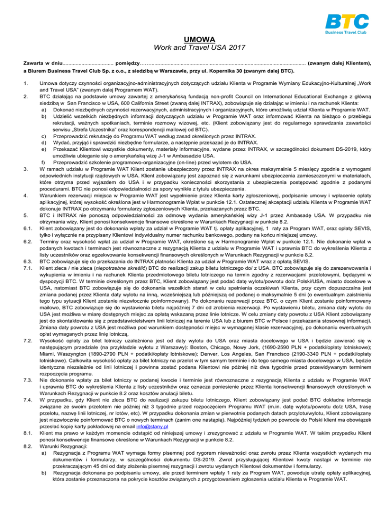 UMOWA Work and Travel USA 2017 Zawarta w dniu................................... pomiędzy……........................................................................................................... (zwanym dalej Klientem), a Biurem Business Travel Club Sp. z o.o., z siedzibą w Warszawie, przy ul. Kopernika 30 (zwanym dalej BTC). 1. 2. 3. 4. 5. 6.1. 6.2. 6.3. 7.1. 7.2. 7.3. 7.4. 8.1. 8.2. Umowa dotyczy czynności organizacyjno-administracyjnych dotyczących udziału Klienta w Programie Wymiany Edukacyjno-Kulturalnej „Work and Travel USA” (zwanym dalej Programem WAT). BTC działając na podstawie umowy zawartej z amerykańską fundacją non-profit Council on International Educational Exchange z główną siedzibą w San Francisco w USA, 600 California Street (zwaną dalej INTRAX), zobowiązuje się działając w imieniu i na rachunek Klienta: a) Dokonać niezbędnych czynności rezerwacyjnych, administracyjnych i organizacyjnych, które umożliwią udział Klienta w Programie WAT. b) Udzielić wszelkich niezbędnych informacji dotyczących udziału w Programie WAT oraz informować Klienta na bieżąco o przebiegu rekrutacji, ważnych spotkaniach, terminie rozmowy wizowej, etc. (Klient zobowiązany jest do regularnego sprawdzania zawartości serwisu „Strefa Uczestnika” oraz korespondencji mailowej od BTC). c) Przeprowadzić rekrutację do Programu WAT według zasad określonych przez INTRAX. d) Wydać, przyjąć i sprawdzić niezbędne formularze, a następnie przekazać je do INTRAX. e) Przekazać Klientowi wszystkie dokumenty, materiały informacyjne, wydane przez INTRAX, w szczególności dokument DS-2019, który umożliwia ubieganie się o amerykańską wizę J-1 w Ambasadzie USA. f) Przeprowadzić szkolenie programowo-organizacyjne (on-line) przed wylotem do USA. W ramach udziału w Programie WAT Klient zostanie ubezpieczony przez INTRAX na okres maksymalnie 5 miesięcy zgodnie z wymogami odpowiednich instytucji rządowych w USA. Klient zobowiązany jest zapoznać się z warunkami ubezpieczenia zamieszczonymi w materiałach, które otrzyma przed wyjazdem do USA i w przypadku konieczności skorzystania z ubezpieczenia postępować zgodnie z podanymi procedurami. BTC nie ponosi odpowiedzialności za spory wynikłe z tytułu ubezpieczenia. Warunkiem rezerwacji miejsca w Programie WAT jest wypełnienie przez Klienta karty zgłoszeniowej, podpisanie umowy i wpłacenie opłaty aplikacyjnej, której wysokość określona jest w Harmonogramie Wpłat w punkcie 12.1. Ostatecznej akceptacji udziału Klienta w Programie WAT dokonuje INTRAX po otrzymaniu formularzy zgłoszeniowych Klienta, przekazanych przez BTC. BTC i INTRAX nie ponoszą odpowiedzialności za odmowę wydania amerykańskiej wizy J-1 przez Ambasadę USA. W przypadku nie otrzymania wizy, Klient ponosi konsekwencje finansowe określone w Warunkach Rezygnacji w punkcie 8.2. Klient zobowiązany jest do dokonania wpłaty za udział w Programie WAT tj. opłaty aplikacyjnej, 1 raty za Program WAT, oraz opłaty SEVIS, tylko i wyłącznie na przypisany Klientowi indywidualny numer rachunku bankowego, podany na końcu niniejszej umowy. Terminy oraz wysokość wpłat za udział w Programie WAT, określone są w Harmonogramie Wpłat w punkcie 12.1. Nie dokonanie wpłat w podanych kwotach i terminach jest równoznaczne z rezygnacją Klienta z udziału w Programie WAT i uprawnia BTC do wykreślenia Klienta z listy uczestników oraz egzekwowanie konsekwencji finansowych określonych w Warunkach Rezygnacji w punkcie 8.2. BTC zobowiązuje się do przekazania do INTRAX płatności Klienta za udział w Programie WAT wraz z opłatą SEVIS. Klient zleca / nie zleca (niepotrzebne skreślić) BTC do realizacji zakup biletu lotniczego do/ z USA. BTC zobowiązuje się do zarezerwowania i wykupienia w imieniu i na rachunek Klienta przedmiotowego biletu lotniczego na termin zgodny z rezerwacjami przelotowymi, będącymi w dyspozycji BTC. W terminie określonym przez BTC, Klient zobowiązany jest podać datę wylotu/powrotu do/z Polski/USA, miasto docelowe w USA, natomiast BTC zobowiązuje się do dokonania wszelkich starań w celu spełnienia oczekiwań Klienta, przy czym dopuszczalna jest zmiana podanej przez Klienta daty wylotu na inną, wcześniejszą lub późniejszą od podanej o maksymalnie 5 dni (o ewentualnym zaistnieniu tego typu sytuacji Klient zostanie niezwłocznie poinformowany). Po dokonaniu rezerwacji przez BTC, o czym Klient zostanie poinformowany mailowo, BTC zobowiązuje się do wystawienia biletu najpóźniej 7 dni od zrobienia rezerwacji. Po wystawieniu biletu, zmiana daty wylotu do USA jest możliwa w miarę dostępnych miejsc za opłatą wskazaną przez linie lotnicze. W celu zmiany daty powrotu z USA Klient zobowiązany jest do skontaktowania się z przedstawicielstwem linii lotniczej na terenie USA lub z biurem BTC w Polsce i przekazania stosownej informacji. Zmiana daty powrotu z USA jest możliwa pod warunkiem dostępności miejsc w wymaganej klasie rezerwacyjnej, po dokonaniu ewentualnych opłat wymaganych przez linię lotniczą. Wysokość opłaty za bilet lotniczy uzależniona jest od daty wylotu do USA oraz miasta docelowego w USA i będzie zawierać się w następującym przedziale (na przykładzie wylotu z Warszawy): Boston, Chicago, Nowy Jork, (1690-2590 PLN + podatki/opłaty lotniskowe); Miami, Waszyngton (1890-2790 PLN + podatki/opłaty lotniskowe); Denver, Los Angeles, San Francisco (2190-3340 PLN + podatki/opłaty lotniskowe). Całkowita wysokość opłaty za bilet lotniczy na przelot w tym samym terminie i do tego samego miasta docelowego w USA, będzie identyczna niezależnie od linii lotniczej i powinna zostać podana Klientowi nie później niż dwa tygodnie przed przewidywanym terminem rozpoczęcia programu. Nie dokonanie wpłaty za bilet lotniczy w podanej kwocie i terminie jest równoznaczne z rezygnacją Klienta z udziału w Programie WAT i uprawnia BTC do wykreślenia Klienta z listy uczestników or