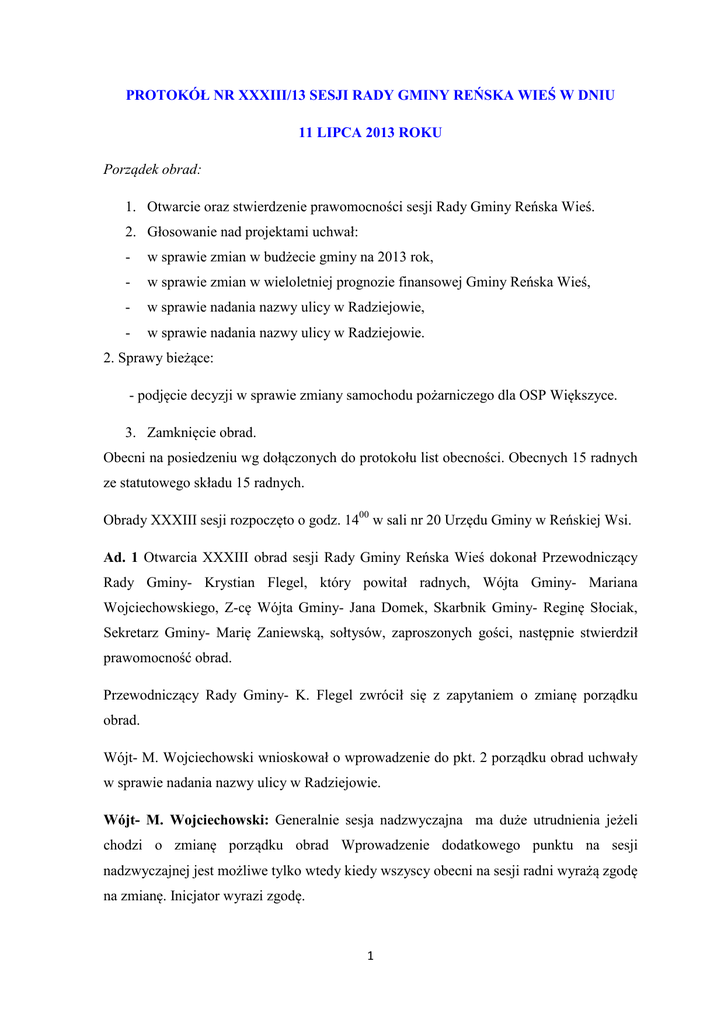 PROTOKÓŁ NR XXXIII/13 SESJI RADY GMINY REŃSKA WIEŚ W DNIU 11 LIPCA 2013 ROKU Porządek obrad: 1. Otwarcie oraz stwierdzenie prawomocności sesji Rady Gminy Reńska Wieś. 2. Głosowanie nad projektami uchwał: - w sprawie zmian w budżecie gminy na 2013 rok, - w sprawie zmian w wieloletniej prognozie finansowej Gminy Reńska Wieś, - w sprawie nadania nazwy ulicy w Radziejowie, - w sprawie nadania nazwy ulicy w Radziejowie. 2. Sprawy bieżące: - podjęcie decyzji w sprawie zmiany samochodu pożarniczego dla OSP Większyce. 3. Zamknięcie obrad. Obecni na posiedzeniu wg dołączonych do protokołu list obecności. Obecnych 15 radnych ze statutowego składu 15 radnych. Obrady XXXIII sesji rozpoczęto o godz. 1400 w sali nr 20 Urzędu Gminy w Reńskiej Wsi. Ad. 1 Otwarcia XXXIII obrad sesji Rady Gminy Reńska Wieś dokonał Przewodniczący Rady Gminy- Krystian Flegel, który powitał radnych, Wójta Gminy- Mariana Wojciechowskiego, Z-cę Wójta Gminy- Jana Domek, Skarbnik Gminy- Reginę Słociak, Sekretarz Gminy- Marię Zaniewską, sołtysów, zaproszonych gości, następnie stwierdził prawomocność obrad. Przewodniczący Rady Gminy- K. Flegel zwrócił się z zapytaniem o zmianę porządku obrad. Wójt- M. Wojciechowski wnioskował o wprowadzenie do pkt. 2 porządku obrad uchwały w sprawie nadania nazwy ulicy w Radziejowie. Wójt- M. Wojciechowski: Generalnie sesja nadzwyczajna ma duże utrudnienia jeżeli chodzi o zmianę porządku obrad Wprowadzenie dodatkowego punktu na sesji nadzwyczajnej jest możliwe tylko wtedy kiedy wszyscy obecni na sesji radni wyrażą zgodę na zmianę. Inicjator wyrazi zgodę. 1 Jeśli nadajemy nazwę dodatkową jednej ulicy to drugiej też można. Wybrano nazwę. Przewodniczący Rady Gminy- K. Flegel zarządził głosowanie nad zmianą porządku obrad. Do głosowania przystąpiło 15 obecnych radnych. W głosowaniu radni jednogłośnie opowiedzieli się za zmianą porządku obrad. 15 radnych głosowało „za”. Ad. 2 Głosowanie nad projektami uchwał Projekt uchwały Nr XXXIII/20/13 w sprawie zmiany budżetu gminy na rok 2013 Przewodniczący Rady Gminy- K. Flegel przekazał głos, Skarbnik Gminy- R. Słociak, która omówiła projekt uchwały. Wójt- M. Wojciechowski: Wprowadzamy kwotę na chodnik naprzeciwko remizy, na który z funduszu sołeckiego sołectwo przeznacza w tym roku 14.000 zł w zamiana za to że zorganizowali dożynki my dokładamy na zamknięty odcinek do połączenia od ul. Polnej do „Jubilatki”. Jest tam taka skropiona smoła, jak stare chodniki bywały. Radna- I. Mainka: Z czego wynika zmniejszenie remontu dróg, ul. Gościęcińskiej w Pokrzywnicy i w Łężcach? Wójt- M. Wojciechowski: Z przetargu. Po przetargu kwoty są mniejsze w związku z tym zmniejszamy na tym zadaniu. Ponieważ jest taka możliwość proponuję z powrotem dołożyć do kanalizacji, do tranzytu w Komornie. Ogłosić przetarg i w tym roku tranzyt wykonać. Szybko byśmy przetarg ogłosili i w okresie po żniwach kiedy na polach będzie pusto ten tranzyt wykonać. Myślę, że te pieniądze, tam jest 360.000 zł plus 100.000 zł, te 460.000 zł, ze to powinno wystarczyć na wykonanie tego tranzytu. Na przyszły rok by zostało Komorno skanalizować. Radny- W. Krybus: W Mechnicy co ma być robione? Wójt- M. Wojciechowski: Mechnica ma kupioną kostkę z funduszu sołeckiego, ponad 500 m2 z zeszłego roku i trzeba ją położyć. To jest plac przed remizą i jeszcze kawałek zostanie. Radny- W. Krybus: 55.000 To całe zadanie ma tylko kosztować, czy tylko ten dodatkowy gminy udział. 2 Wójt- M. Wojciechowski: W Mechnicy całe. Kostki nie ma w tych kosztach. To jest tylko robocizna. Chcemy żeby było do dożynek zrobione. Firma obiecała, że wejdzie 22 lipca. Będą robili jedno i drugie, tam jeszcze Mechnica ma z funduszu sołeckiego do wykonania kawałek placu przy wiejskim centrum spotkań. Mają rozpocząć od remizy żeby to na dożynki było. Przewodniczący Rady Gminy- K. Flegel odczytał projekt uchwały po czym zarządził głosowanie. Do głosowania przystąpiło 15 obecnych radnych. W głosowaniu, radni jednogłośnie opowiedzieli się za przyjęciem uchwały (15 głosów „za”). Projekt uchwały Nr XXXIII/210/13 w sprawie zmian w wieloletniej prognozie finansowej Gminy Reńska Wieś Przewodniczący Rady Gminy- K. Flegel odczytał projekt uchwały po czym zarządził głosowanie. Do głosowania przystąpiło 15 obecnych radnych. W głosowaniu, radni jednogłośnie opowiedzieli się za przyjęciem uchwały (15 głosów „za”). Projekt uchwały Nr XXXIII/210/13 w sprawie nadania nazwy ulicy w Radziejowie Wiceprzewodniczący- Z. Steuer odczytał projekt uchwały. Wójt- M. Wojciechowski: Z początku nazywa się ul. Polna, przy czym numeracja jest od transformatora chce nadać numer domu gdzie numeracja zaczyna się mniej więcej od skrzyżowania w związku z ta ulica w tamtą stronę miała inną nazwę żeby to było sensowne Lepiej całą ulicę od skrzyżowania Wiceprzewodniczący- Z. Steuer zarządził głosowanie. Do głosowania przystąpiło 15 obecnych radnych. W głosowaniu, radni jednogłośnie opowiedzieli się za przyjęciem uchwały (15 głosów „za”). Projekt uchwały Nr XXXIII/210/13 w sprawie nadania nazwy ulicy w Radziejowie Wiceprzewodnicząca- D. Rak odczytała projekt uchwały po czym zarządziła głosowanie. Do głosowania przystąpiło 15 obecnych radnych. W głosowaniu, radni jednogłośnie opowiedzieli się za przyjęciem uchwały (15 głosów „za”). Ad. 3 Wójt- M. Wojciechowski: Jakąś decyzję trzeba podjąć. Na dobrą sprawę obiecywaliśmy, że ta zmiana samochodu w tym roku nastąpi. Połowa roku za nami i tak właściwie nawet 3 nie wiemy w jakim kierunku iść. Na początku roku na zebraniu w Większycach rzeczywiście powiedziałem, że przy takich kosztach zakupu używanego samochody może lepiej dołożyć i kupić nowy. Ale, jak państwu mówiłem później te koszty zakupu nowego samochodu to