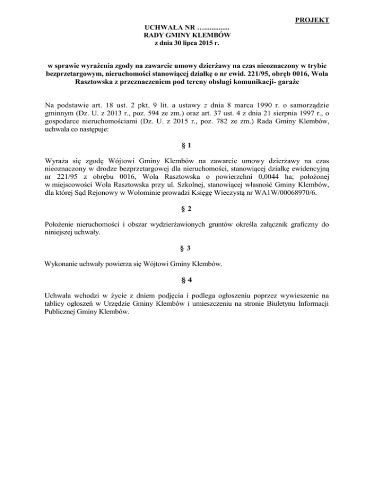 PROJEKT UCHWAŁA NR ….............. RADY GMINY KLEMBÓW z dnia 30 lipca 2015 r. w sprawie wyrażenia zgody na zawarcie umowy dzierżawy na czas nieoznaczony w trybie bezprzetargowym, nieruchomości stanowiącej działkę o nr ewid. 221/95, obręb 0016, Wola Rasztowska z przeznaczeniem pod tereny obsługi komunikacji- garaże Na podstawie art. 18 ust. 2 pkt. 9 lit. a ustawy z dnia 8 marca 1990 r. o samorządzie gminnym (Dz. U. z 2013 r., poz. 594 ze zm.) oraz art. 37 ust. 4 z dnia 21 sierpnia 1997 r., o gospodarce nieruchomościami (Dz. U. z 2015 r., poz. 782 ze zm.) Rada Gminy Klembów, uchwala co następuje: §1 Wyraża się zgodę Wójtowi Gminy Klembów na zawarcie umowy dzierżawy na czas nieoznaczony w drodze bezprzetargowej dla nieruchomości, stanowiącej działkę ewidencyjną nr 221/95 z obrębu 0016, Wola Rasztowska o powierzchni 0,0044 ha; położonej w miejscowości Wola Rasztowska przy ul. Szkolnej, stanowiącej własność Gminy Klembów, dla której Sąd Rejonowy w Wołominie prowadzi Księgę Wieczystą nr WA1W/00068970/6. §2 Położenie nieruchomości i obszar wydzierżawionych gruntów określa załącznik graficzny do niniejszej uchwały. §3 Wykonanie uchwały powierza się Wójtowi Gminy Klembów. §4 Uchwała wchodzi w życie z dniem podjęcia i podlega ogłoszeniu poprzez wywieszenie na tablicy ogłoszeń w Urzędzie Gminy Klembów i umieszczeniu na stronie Biuletynu Informacji Publicznej Gminy Klembów. UZASADNIENIE Podjęcie niniejszej uchwały wynika z upoważnienia, zawartego w art. 18 ust. 2 pkt 9 lit. a ustawy o samorządzie gminnym, który to przepis do wyłącznej właściwości Rady Gminy zastrzega prawo określenia zasad nabywania, zbywania i obciążania nieruchomości oraz ich wydzierżawiania lub wynajmowania na czas oznaczony dłuższy niż 3 lata lub na czas nieoznaczony, o ile ustawy szczególne nie stanowią inaczej; uchwała rady gminy jest wymagana również w przypadku, gdy po umowie zawartej na czas oznaczony do 3 lat strony zawierają kolejne umowy, których przedmiotem jest ta sama nieruchomość; do czasu określenia zasad wójt może dokonywać tych czynności wyłącznie za zgodą Rady, wyrażonej w drodze uchwały. Zgodnie z Miejscowym Planem Zagospodarowania Przestrzennego Gminy Klembów zatwierdzonym Uchwałą Nr XXIV/178/08 Rady Gminy Klembów z dnia 26 czerwca 2008 roku nieruchomość objęta powyższą uchwałą przeznaczona jest pod tereny obsługi komunikacji - garaże (3KS). Nieruchomość gruntowa, została nabyta w drodze komunalizacji decyzją Wojewody Ostrołęckiego znak D.G.IV-7224/MK/A/553/26/98, dla której Sąd Rejonowy w Wołominie prowadzi Księgę Wieczystą nr WA1W/00068970/6, opisana w ewidencji gruntów i budynków jako działka o numerze ewidencyjnym 221/95 z obrębu 0016, Wola Rasztowska, położona w miejscowości Wola Rasztowska wykorzystywana jest zgodnie z zapisami miejscowego planu zagospodarowania przestrzennego. Niniejsza nieruchomość nie stanowi już przedmiotu dzierżawy od dnia 1 lipca 2015r. Rada Gminy, na podstawie art. 37 ust. 4 u.g.n. może wyrazić zgodę na odstąpienie od obowiązku przetargowego trybu zawarcia umowy najmu lub dzierżawy na czas oznaczony dłuższy niż 3 lata lub na czas nieoznaczony. Z uwagi na chęć kontynuacji dzierżawy, dla dotychczasowych dzierżawców, konieczne jest podjęcie nowej uchwały.