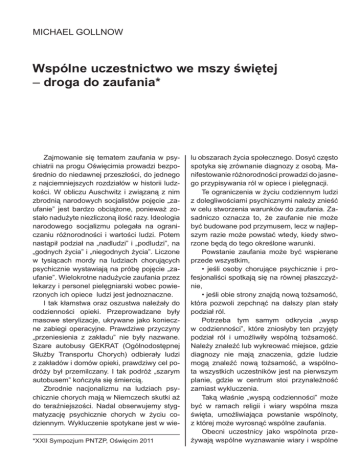 Wspólne uczestnictwo we mszy św. i tworzenie bazy do zaufania 119 MICHAEL GOLLNOW Wspólne uczestnictwo we mszy świętej – droga do zaufania* Zajmowanie się tematem zaufania w psychiatrii na progu Oświęcimia prowadzi bezpośrednio do niedawnej przeszłości, do jednego z najciemniejszych rozdziałów w historii ludzkości. W obliczu Auschwitz i związaną z nim zbrodnią narodowych socjalistów pojęcie „zaufanie” jest bardzo obciążone, ponieważ zostało nadużyte niezliczoną ilość razy. Ideologia narodowego socjalizmu polegała na ograniczaniu różnorodności i wartości ludzi. Potem nastąpił podział na „nadludzi” i „podludzi”, na „godnych życia” i „niegodnych życia”. Liczone w tysiącach mordy na ludziach chorujących psychicznie wystawiają na próbę pojęcie „zaufanie”. Wielokrotne nadużycie zaufania przez lekarzy i personel pielęgniarski wobec powierzonych ich opiece ludzi jest jednoznaczne. I tak kłamstwa oraz oszustwa należały do codzienności opieki. Przeprowadzane były masowe sterylizacje, ukrywane jako konieczne zabiegi operacyjne. Prawdziwe przyczyny „przeniesienia z zakładu” nie były nazwane. Szare autobusy GEKRAT (Ogólnodostępnej Służby Transportu Chorych) odbierały ludzi z zakładów i domów opieki, prawdziwy cel podróży był przemilczany. I tak podróż „szarym autobusem” kończyła się śmiercią. Zbrodnie nacjonalizmu na ludziach psychicznie chorych mają w Niemczech skutki aż do teraźniejszości. Nadal obserwujemy stygmatyzację psychicznie chorych w życiu codziennym. Wykluczenie spotykane jest w wie*XXII Sympozjum PNTZP, Oświęcim 2011 lu obszarach życia społecznego. Dosyć często spotyka się zrównanie diagnozy z osobą. Manifestowanie różnorodności prowadzi do jasnego przypisywania ról w opiece i pielęgnacji. Te ograniczenia w życiu codziennym ludzi z dolegliwościami psychicznymi należy znieść w celu stworzenia warunków do zaufania. Zasadniczo oznacza to, że zaufanie nie może być budowane pod przymusem, lecz w najlepszym razie może powstać wtedy, kiedy stworzone będą do tego określone warunki. Powstanie zaufania może być wspierane przede wszystkim, • jeśli osoby chorujące psychicznie i profesjonaliści spotkają się na równej płaszczyźnie, • jeśli obie strony znajdą nową tożsamość, która pozwoli zepchnąć na dalszy plan stały podział ról. Potrzeba tym samym odkrycia „wysp w codzienności”, które zniosłyby ten przyjęty podział ról i umożliwiły wspólną tożsamość. Należy znaleźć lub wykreować miejsce, gdzie diagnozy nie mają znaczenia, gdzie ludzie mogą znaleźć nową tożsamość, a wspólnota wszystkich uczestników jest na pierwszym planie, gdzie w centrum stoi przynależność zamiast wykluczenia. Taką właśnie „wyspą codzienności” może być w ramach religii i wiary wspólna msza święta, umożliwiająca powstanie wspólnoty, z której może wyrosnąć wspólne zaufania. Obecni uczestnicy jako wspólnota przeżywają wspólne wyznawanie wiary i wspólne 120 uczestnictwo we mszy św. Wspólnie odprawiane msze św. pomiędzy Fundacją Pinel w Berlinie i sąsiednimi parafiami odznaczają się następującymi cechami: • wspólne śpiewanie • czytanie biblii • wspólna modlitwa • bycie razem po zakończeniu mszy przy kawie i cieście. Wspólne śpiewanie: Śpiew jest elementem łączącym na płaszczyźnie międzyludzkiej. Stwarza on określoną atmosferę duchowości w czasie spotkania polegającego na współbrzmieniu, które na czysto językowej płaszczyźnie jest nieosiągalne. Korzystanie ze znanych tekstów i melodii łączy ludzi psychicznie chorych w nadrzędnej religijnej wspólnocie, w której mogą czuć się dobrze i bezpiecznie. Czytanie biblii: Na pierwszym planie są teksty ukierunkowane w szczególny sposób na własną sytuację i historię życiową i rozumiane jako definitywna obietnica wyzdrowienia. Korzysta się też z tekstów odnoszących się do wspólnoty dzieci bożych i ukierunkowanych tym samym na przezwyciężenie izolacji i samotności. Korzysta się z biblijnych słów rozumianych jako zaproszenie do nowego kierunku w życiu. Wspólna modlitwa: Modlitwa jest elementarną formą wyraża- Michael Gollnow nia komunikacji religijnej. W modlitwie osoba modląca się szuka kontaktu z boską rzeczywistością, aby chwalić, dziękować, skarżyć się i prosić. Również w sytuacjach ekstremalnych modlitwa otrzymuje zdolność mowy i dialogu. Szczególną formą modlitwy jest modlitwa o wstawiennictwo. W ten sposób usłyszane i wysłuchane zostają prośby ludzi, którzy z trudem mogą przezwyciężyć własne milczenie. Bycie razem po zakończeniu mszy przy kawie i cieście: Rozmowy prowadzone na spotkaniu przy kawie po mszy prowadzą do tego, że wspólnota ma ciąg dalszy na innej płaszczyźnie. Rozmawia się na tematy, na które w życiu codziennym nie ma miejsca (np. Czym jest szczęście w życiu?). Ludzie umawiają się na wspólne przedsięwzięcia (platforma komunikacyjna). Uczestnicy przedstawiają propozycje tematów na kolejną mszę św. (np. w listopadzie odbyła się msza św. w intencji Holokaustu). Opisane cechy charakterystyczne mszy św. posiadają jedyny w swoim rodzaju skutek odnośnie tworzenia bazy zaufania. W centrum jest tutaj kreowanie nowej tożsamości. Odkrywanie nowej tożsamości i wspólne celebrowanie mszy świętej tworzą wspólnotę, z której może wyrosnąć zaufanie.