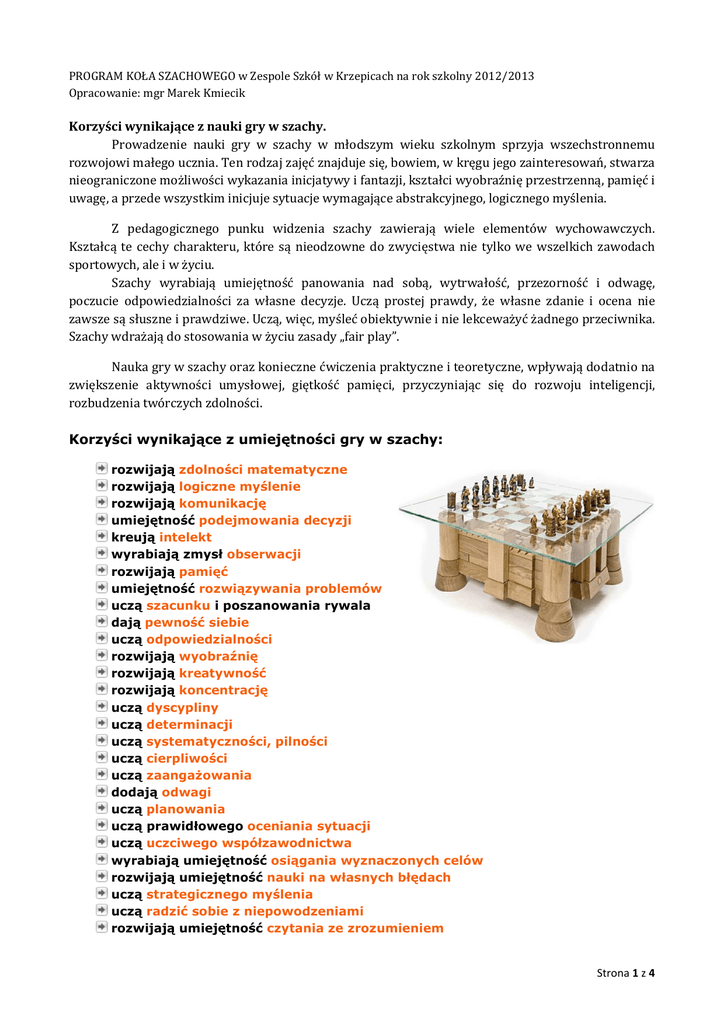 PROGRAM KOŁA SZACHOWEGO w Zespole Szkół w Krzepicach na rok szkolny 2012/2013 Opracowanie: mgr Marek Kmiecik Korzyści wynikające z nauki gry w szachy. Prowadzenie nauki gry w szachy w młodszym wieku szkolnym sprzyja wszechstronnemu rozwojowi małego ucznia. Ten rodzaj zajęć znajduje się, bowiem, w kręgu jego zainteresowań, stwarza nieograniczone możliwości wykazania inicjatywy i fantazji, kształci wyobraźnię przestrzenną, pamięć i uwagę, a przede wszystkim inicjuje sytuacje wymagające abstrakcyjnego, logicznego myślenia. Z pedagogicznego punku widzenia szachy zawierają wiele elementów wychowawczych. Kształcą te cechy charakteru, które są nieodzowne do zwycięstwa nie tylko we wszelkich zawodach sportowych, ale i w życiu. Szachy wyrabiają umiejętność panowania nad sobą, wytrwałość, przezorność i odwagę, poczucie odpowiedzialności za własne decyzje. Uczą prostej prawdy, że własne zdanie i ocena nie zawsze są słuszne i prawdziwe. Uczą, więc, myśleć obiektywnie i nie lekceważyć żadnego przeciwnika. Szachy wdrażają do stosowania w życiu zasady „fair play”. Nauka gry w szachy oraz konieczne ćwiczenia praktyczne i teoretyczne, wpływają dodatnio na zwiększenie aktywności umysłowej, giętkość pamięci, przyczyniając się do rozwoju inteligencji, rozbudzenia twórczych zdolności. Korzyści wynikające z umiejętności gry w szachy: rozwijają zdolności matematyczne rozwijają logiczne myślenie rozwijają komunikację umiejętność podejmowania decyzji kreują intelekt wyrabiają zmysł obserwacji rozwijają pamięć umiejętność rozwiązywania problemów uczą szacunku i poszanowania rywala dają pewność siebie uczą odpowiedzialności rozwijają wyobraźnię rozwijają kreatywność rozwijają koncentrację uczą dyscypliny uczą determinacji uczą systematyczności, pilności uczą cierpliwości uczą zaangażowania dodają odwagi uczą planowania uczą prawidłowego oceniania sytuacji uczą uczciwego współzawodnictwa wyrabiają umiejętność osiągania wyznaczonych celów rozwijają umiejętność nauki na własnych błędach uczą strategicznego myślenia uczą radzić sobie z niepowodzeniami rozwijają umiejętność czytania ze zrozumieniem Strona 1 z 4 Szachy odgrywają istotną rolę w nabywaniu i kształtowaniu wielu umiejętności wykorzystywanych przez człowieka w ciągu całego życia. Wprowadzenie nauki gry w szachy w młodszym wieku szkolnym wpływa wszechstronnie na rozwój uczniów. Dzieci uczące się grać w szachy dostrzegają w nich przede wszystkim rozrywkę, nie zdając sobie sprawy, że bawiąc się drewnianym wojskiem, uczą się i doskonalą swoje umysły. Grając w szachy, musimy przestrzegać pewnych określonych zasad i reguł. Każdy szachista musi więc wykazać się zdyscyplinowaniem, ale i wyobraźnią. Biorąc pod uwagę powyższe, można określić w jakich płaszczyznach szachy wpływają na rozwój psychiczny i intelektualny dziecka: 1. Rozwój zainteresowań – dziecko poznaje nową dyscyplinę, której istotą jest samodzielne, logiczne rozumowanie, łączące poszczególne elementy wiedzy w jedną harmonijną całość; 2. Aktywność twórcza – specyfika gry w szachy wyklucza odtwórcze traktowanie tego zagadnienia. Wszelkie próby bezmyślnego naśladownictwa skazane są na niepowodzenie. Dziecko samo kreuje wydarzenia na szachownicy i ponosi za nie odpowiedzialność; 3. Rozwijanie pamięci i uwagi – główną umiejętnością w szachach jest zdolność zreasumowania każdej pozycji w sposób dynamiczny, w kategoriach najważniejszych jej elementów. Cała szachownica zostaje ukształtowana w przestrzenno-czasową postać, czyli wzorzec (P.G. Zimbardo, F.L. Ruch: „Psychologia i życie”. Warszawa, 1997. s.198). Towarzyszy temu rozwój wyobraźni wzrokowej i koncentracji; 4. Myślenie logiczno-wyobrażeniowe – ludzie myślą czasami za pomocą wyobrażeń, które są obrazami psychicznymi rzeczywistych doznań zmysłowych (Tamże, s.196) i ten właśnie rodzaj myślenia gra szachowa rozwija najpełniej; 5. Rozwój pozytywnych sfer osobowości – szachy wykształcają poczucie obiektywizmu, uznawanie prawd innych ludzi, uczą tolerancji i reakcji na niepowodzenia; 6. Konsekwencja i wytrwałość w działaniu – dzieci mające styczność z szachami, zupełnie inaczej podchodzą do porażek. Zazwyczaj ponownie starają się rozwiązać określony problem i czynią to aż do skutku, podczas gdy ich rówieśnicy bądź rezygnują z wykonania zadania, bądź też obniżają sobie skalę trudności; 7. Aspekty wychowawcze – można je rozpatrywać w kategoriach kary i nagrody. Czymże innym jak nie karą jest przegrana? W dodatku wymierzona natychmiast i adekwatnie do czynu. To samo można powiedzieć o nagrodzie, jaką bez wątpienia jest dla młodego człowieka zwycięstwo, osiągnięte dzięki sile własnego umysłu. Czymże więc są szachy? W naszym rozumieniu to nic innego, jak narzędzie stymulujące rozwój emocjonalny i intelektualny dziecka, kształtujące jego osobowość i pozwalające na rozwój twórczego potencjału, który drzemie w każdym młodym człowieku. UWAGI O REALIZACJI PROGRAMU Program nauki gry w szachy przeznaczony jest w zasadzie dla dzieci klas I-III szkoły podstawowej. Jednak nic nie stoi na przeszkodzie, aby w razie potrzeby był również realizowany w cyklu dwu, trzyletnim z dziećmi starszymi, które dopiero zaczynają swoją przygodę z szachami. Pełny zakres programu przewiduje 180 godzin lekcyjnych w 3-letnim cyklu (2 godziny tygodniowo). Jeżeli nauczyciel ma do dyspozycji tylko jedną godzinę lekcyjną tygodniowo, program można rozszerzyć na okres sześciu lat. Środki dydaktyczne, jakimi dysponuje nauczyciel, to przede wszystkim tablica demonstracyjna, fachowa literatura oraz sprzęt szachowy. Dobór metod pracy pozostaje w ścisłym związku ze sformułowanymi przez znakomitego pedagoga, prof. Wincentego Okonia, czterema dr