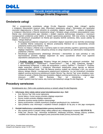 Warunki świadczenia usługi Usługa On-site Diagnosis Omówienie usługi Dell z przyjemnością przedstawia usługę On-site Diagnosis (zwaną dalej „Usługą”) zgodną z niniejszym dokumentem (zwanym dalej „Warunkami świadczenia usługi”). Wprowadza ona opcjonalne czynności diagnostyczne u Klienta odnośnie do produktów objętych wsparciem* — opisane szczegółowo w niniejszym dokumencie („Warunki świadczenia usługi”). Niniejsza usługa umożliwia zaoszczędzenie czasu Klienta oraz zminimalizowanie jego interakcji z działem wsparcia technicznego związanej z rutynowym rozwiązywaniem problemów przez telefon w ramach ograniczonej gwarancji Dell oraz umowy na obsługę sprzętu. W stosownych przypadkach do Klienta jest wysyłany technik serwisowy, który usuwa usterkę na miejscu. Usługa obejmuje: • Rozwiązywanie problemów związanych z produktem objętym wsparciem przez technika serwisowego w siedzibie Klienta (wskazanej na fakturze przekazanej Klientowi lub w odpowiedniej umowie podpisanej osobno przez Klienta z Dell). • Pomoc na miejscu u Klienta wraz z wymianą części (w razie potrzeby) zgodnie z gwarancją produktu objętego wsparciem i osobno zakupioną umową na usługi wsparcia (po zakończeniu rozwiązywania problemów u Klienta). • Aktualizacje oprogramowania układowego (firmware) i sterowników (w razie potrzeby) w celu doprowadzenia produktu objętego wsparciem do stanu używalności (Klient musi zapewnić odpowiednio zabezpieczony dostęp). * Produkty objęte wsparciem: Niniejsza Usługa jest dostępna dla wybranych produktów Dell z serii PowerEdge™, PowerVault™, PowerConnect™ i Dell | EMC Enterprise Storage™ o standardowej konfiguracji, a także dla komputerów z rodziny OptiPlex™ i Precision™. Produkty objęte wsparciem zgodnie z niniejszymi Warunkami świadczenia usługi figurują na fakturze wystawianej Klientowi przez Dell. Na fakturze powinny znaleźć się informacje o tym, czy umowa dotyczy danego Klienta i rozwiązywania pojedynczych problemów, czy też konkretnych produktów objętych pomocą techniczną (określonych kodem Service Tag „Service Tag” przez określony czas). Umowa na serwis u Klienta dotycząca produktów objętych pomocą techniczną (np. w następnym dniu roboczym („NBD”, Next Business Day) lub interwencją w ciągu 2 bądź 4 godzin) musi być ważna, aby można było świadczyć usługę On-site Diagnosis. Procedury serwisowe Kontaktowanie się z Dell w celu uzyskania pomocy w ramach usługi On-site Diagnosis: 1. Informacje, które należy zebrać przed skontaktowaniem się z Dell: • Kod „Service Tag” i/lub numer zgłoszenia • Numer faktury i numer seryjny produktu objętego wsparciem • Numer modelu produktu objętego wsparciem • Aktualnie używana wersja systemu operacyjnego • Nazwy producentów i modele używanych urządzeń peryferyjnych (np. modemów) • Opis problemu oraz informacje o wszelkich krokach podjętych do tej pory w celu jego rozwiązania 2. Kontakt telefoniczny z przedstawicielem pomocy technicznej • Aby uzyskać pomoc w ramach Usługi, należy połączyć się z następującym numerem: 022 579 59 78. • Podaj kod „Service Tag”, informacje kontaktowe, lokalizację produktu, którego dotyczy problem, i wszelkie inne informacje wymagane przez pracownika działu pomocy technicznej Dell. © 2007 Dell Inc. Wszelkie prawa zastrzeżone. UsługaOn-site Diagnosis, wersja 1.0, 09.11.2007 Strona 1 z 5 Warunki świadczenia usługi Usługa On-site Diagnosis Kluczowe etapy realizacji usługi On-site Diagnosis: 1. Po sprawdzeniu uprawnień Klienta do korzystania z Usługi pracownik działu pomocy technicznej Dell zaplanuje wizytę technika serwisowego na miejscu u Klienta w celu rozwiązania problemu. 2. Wysłanie technika serwisowego będzie miało miejsce w następujących okolicznościach, w zależności od produktów objętych wsparciem: • W przypadku objętych wsparciem produktów z rodziny PowerEdge, PowerVault, PowerConnect lub Dell | EMC Enterprise Storage technik serwisowy przybywa do siedziby Klienta po upływie takiego samego czasu, jaki określono w umowie na serwis u Klienta (np. w następnym dniu roboczym — NBD lub w ciągu 4 bądź 2 godzin) — o ile zgłoszenie Klienta zostało przyjęte do godziny 17:00 czasu lokalnego (tj. czasu obowiązującego w miejscu, w którym mieści się siedziba Klienta). • W przypadku objętych wsparciem produktów z rodziny OptiPlex i Precision technik serwisowy przybywa do siedziby Klienta w następnym dniu roboczym, o ile zgłoszenie Klienta zostało przyjęte do godziny 17:00 czasu lokalnego (tj. czasu obowiązującego w miejscu, w którym mieści się siedziba Klienta). 3. Technik serwisowy skontaktuje się z Klientem przed stawieniem się na miejscu w celu zweryfikowania zgłoszenia oraz zaplanowania i potwierdzenia szczegółów niezbędnych do zrealizowania Usługi. 4. Po przybyciu do Klienta technik serwisowy przystąpi do rozwiązywania problemu. Jeśli wymagana będzie dodatkowa pomoc lub niezbędne będą części zapasowe, technik serwisowy może skontaktować się z Dell Expert Center w celu uzyskania pomocy w imieniu Klienta. 5. Jeśli podczas wstępnego rozwiązywania problemu u Klienta okaże się, że w celu zrealizowania Usługi niezbędna jest część zamienna, technik serwisowy zamówi daną część i umówi się z Klientem na dodatkową rozmowę telefoniczną. Technik serwisowy powróci do siedziby Klienta w celu wymiany dostarczonej części zamiennej w czasie określonym w umowie na serwis u Klienta (np. w następnym dniu roboczym — NBD lub w ciągu 4 bądź 2 godzin) odnośnie do produktu objętego wsparciem. (Czas reakcji jest mierzony od chwili zarejestrowania faktu odebrania części zamiennej). Ważna umowa na serwis u Klienta dla produktu objętego wsparciem musi znajdować się na miejscu, aby Klient mógł otrzymać części zamienne bez ponoszenia dodatkowych kosztów. Usługa On-s