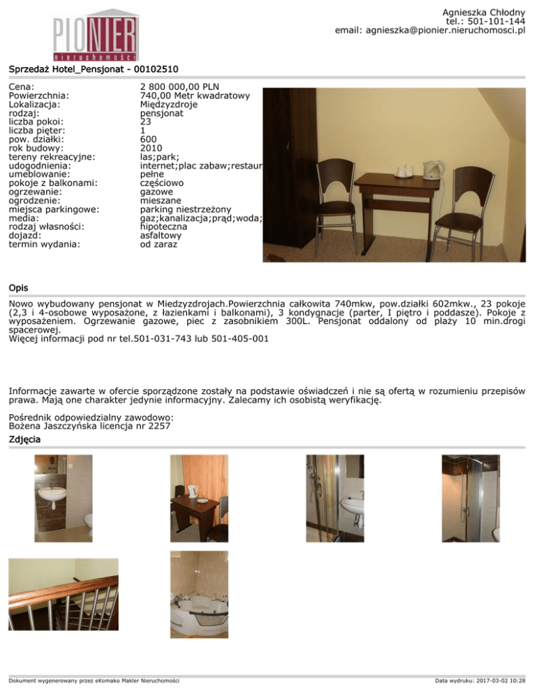 Agnieszka Chłodny tel.: 501-101-144 email: [email protected] Sprzedaż Hotel_Pensjonat - 00102510 Cena: Powierzchnia: Lokalizacja: rodzaj: liczba pokoi: liczba pięter: pow. działki: rok budowy: tereny rekreacyjne: udogodnienia: umeblowanie: pokoje z balkonami: ogrzewanie: ogrodzenie: miejsca parkingowe: media: rodzaj własności: dojazd: termin wydania: 2 800 000,00 PLN 740,00 Metr kwadratowy Międzyzdroje pensjonat 23 1 600 2010 las;park; internet;plac zabaw;restauracja/kawiarnia;telefon;telewizja; pełne częściowo gazowe mieszane parking niestrzeżony gaz;kanalizacja;prąd;woda; hipoteczna asfaltowy od zaraz Opis Nowo wybudowany pensjonat w Miedzyzdrojach.Powierzchnia całkowita 740mkw, pow.działki 602mkw., 23 pokoje (2,3 i 4-osobowe wyposażone, z łazienkami i balkonami), 3 kondygnacje (parter, I piętro i poddasze). Pokoje z wyposażeniem. Ogrzewanie gazowe, piec z zasobnikiem 300L. Pensjonat oddalony od plaży 10 min.drogi spacerowej. Więcej informacji pod nr tel.501-031-743 lub 501-405-001 Informacje zawarte w ofercie sporządzone zostały na podstawie oświadczeń i nie są ofertą w rozumieniu przepisów prawa. Mają one charakter jedynie informacyjny. Zalecamy ich osobistą weryfikację. Pośrednik odpowiedzialny zawodowo: Bożena Jaszczyńska licencja nr 2257 Zdjęcia Dokument wygenerowany przez eKomako Makler Nieruchomości Data wydruku: 2017-03-02 10:28