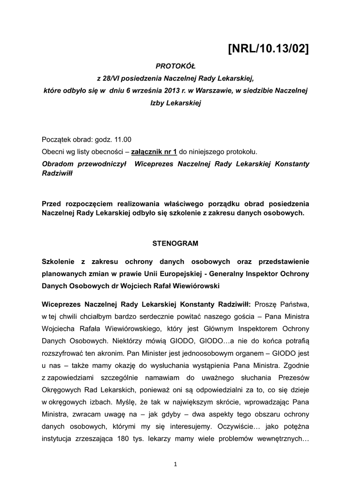 [NRL/10.13/02] PROTOKÓŁ z 28/VI posiedzenia Naczelnej Rady Lekarskiej, które odbyło się w dniu 6 września 2013 r. w Warszawie, w siedzibie Naczelnej Izby Lekarskiej Początek obrad: godz. 11.00 Obecni wg listy obecności – załącznik nr 1 do niniejszego protokołu. Obradom przewodniczył Radziwiłł Wiceprezes Naczelnej Rady Lekarskiej Konstanty Przed rozpoczęciem realizowania właściwego porządku obrad posiedzenia Naczelnej Rady Lekarskiej odbyło się szkolenie z zakresu danych osobowych. STENOGRAM Szkolenie z zakresu ochrony danych osobowych oraz przedstawienie planowanych zmian w prawie Unii Europejskiej - Generalny Inspektor Ochrony Danych Osobowych dr Wojciech Rafał Wiewiórowski Wiceprezes Naczelnej Rady Lekarskiej Konstanty Radziwiłł: Proszę Państwa, w tej chwili chciałbym bardzo serdecznie powitać naszego gościa – Pana Ministra Wojciecha Rafała Wiewiórowskiego, który jest Głównym Inspektorem Ochrony Danych Osobowych. Niektórzy mówią GIODO, GIODO…a nie do końca potrafią rozszyfrować ten akronim. Pan Minister jest jednoosobowym organem – GIODO jest u nas – także mamy okazję do wysłuchania wystąpienia Pana Ministra. Zgodnie z zapowiedziami szczególnie namawiam do uważnego słuchania Prezesów Okręgowych Rad Lekarskich, ponieważ oni są odpowiedzialni za to, co się dzieje w okręgowych izbach. Myślę, że tak w największym skrócie, wprowadzając Pana Ministra, zwracam uwagę na – jak gdyby – dwa aspekty tego obszaru ochrony danych osobowych, którymi my się interesujemy. Oczywiście… jako potężna instytucja zrzeszająca 180 tys. lekarzy mamy wiele problemów wewnętrznych… 1 z różnego rodzaju rejestrami, danymi, listami wyborczymi, stronami internetowymi itd. I to są takie gorące tematy, z którym w ostatnim czasie wielu z nas się spotkało. Ale jest drugi temat – jako środowisko lekarzy i lekarzy dentystów jesteśmy ogromnie zainteresowani również tym, żeby w świecie informatyki, czy informatyzacji, zachować coś, co jest niezwykle ważne wykonywaniu naszych zawodów – to znaczy… to, co w skrócie nazywamy tajemnicą lekarską – czyli ochrona danych pacjentów, albo potencjalnych pacjentów i myślę, że w tym zakresie jest też wiele, wiele pytań, wiele wątpliwości, wiele niebezpieczeństw, wiele szans ale także wyzwań i …mam nadzieję, że Pan Minister o tym nam powie….zwłaszcza, że prezentując osobę Pana Ministra, chcę powiedzieć, że Pan Minister jest z wykształcenia prawnikiem, ukończył studia prawnicze na Uniwersytecie Gdańskim, tam również się doktoryzował, a jego obszarem zainteresowania jest – obok ochrony danych osobowych – także kwestia prawa i informatyki, nowych technologii i wyzwań prawniczych w tym obszarze, a zatem…. Można powiedzieć, że jest to dokładnie ten obszar, te dwa obszary, które nas tak mocno trapią. Pan Minister od wielu lat jest zaangażowany w administracji państwowej ale wcześniej i chyba nadal…. Jest również naukowcem – wykłada na uczelniach gdańskich, a oprócz tego, z tego co dowiedziałem się o Panu Ministrze – to jest pasjonatem muzyki, historii sportu, a także historii kultur mieszkańców środkowej Ameryki sprzed ery kolumbijskiej. Panie Ministrze – witamy jeszcze raz serdecznie i proszę o głos. Generalny Inspektor Ochrony Danych Osobowych Rafał Wiewiórowski: Dziękuję Bardzo, ja przede wszystkim bardzo dziękuję za zaproszenie na to dzisiejsze spotkanie, za możliwość spotkania się z Państwem. I tak chciałem zapytać – mamy poniżej ośmiu godzin, czy powyżej ośmiu godzin na dyskusję? Wiceprezes Naczelnej Rady Lekarskiej Konstanty Radziwiłł: Panie Ministrze – mówiąc szczerze.. dziękuję za to pytanie… nie chciałem Pana popędzać, ale jesteśmy w dniu posiedzenia Naczelnej Rady Lekarskiej, więc jesteśmy… naprawdę bardzo zainteresowani Pana wystąpieniem ale prosimy, żeby nie było za długie. Generalny Inspektor Ochrony Danych Osobowych Rafał Wiewiórowski: Dobrze, ale ja mam prośbę o podanie konkretnie, czasowo, ile Państwo przeznaczyli czasu na tą kwestię…. 2 Wiceprezes Naczelnej Rady Lekarskiej Konstanty Radziwiłł: Panie Ministrze, myślę, że gdybyśmy się zmieścili w półtorej godziny to byłoby super. Generalny Inspektor Ochrony Danych Osobowych Rafał Wiewiórowski: Dobrze, w porządku. Nie ma najmniejszego problemu. To ja proponuję taką konstrukcję, że ja zaproponuję Państwu trzydziestominutowe wprowadzenie, które przedstawi trzy punkty, o których mówiliśmy wstępnie, że są dla nas interesujące.. to znaczy.. to jak wyglądają kwestie związane ze zmianami, które pojawiają się w Prawie Unii Europejskiej – ja po trosze będę Państwa uspokajał, że te zmiany nie są jakieś dramatycznie wielkie w stosunku do tego co dzieje się do tej pory, a jednocześnie głos ze strony środowiska lekarskiego jest w kilku punktach, które zostały poruszone w tym co mówiła Naczelna Rada Lekarska, w tym co było mówione na poziomi europejskim – jest dobrze słyszalne. Drugą kwestią, którą chciałbym poruszyć jest kwestia bardzo istotna… myślę, że kwestia, która w ciągu najbliższego roku będzie coraz bardziej spędzała Państwu sen z powiek…to znaczy.. po pierwsze… wprowadzenia obowiązku przetwarzania danych w postaci elektronicznej – planowanego na lipiec 2014 r. – ja będę traktował to jak rzecz daną – to co się stanie.. Mimo wszystkich zastrzeżeń dotyczących tego, że pewnie w końcu okaże się, że ta data zostanie przesunięta.. to jednak uznaję, że musimy być przygotowani na to, że lato przyszłego roku może być tym przełomem, przy jednoczesnym przygotowaniu systemu informacji medycznej. I trzecia sprawa to będą kwestie związane z czystym bezpieczeństwem informatycznym w placówkach, które są związane z ochroną zdrowia – u osób zajmujących się ochroną zdrowia. Natomiast dalszy czas przezna