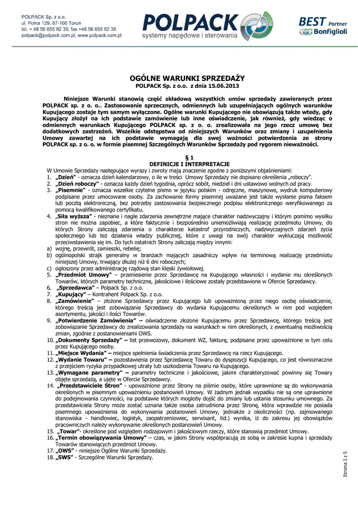 OGÓLNE WARUNKI SPRZEDAŻY POLPACK Sp. z o.o. z dnia 15.06.2013 §1 DEFINICJE I INTERPRETACJE W Umowie Sprzedaży następujące wyrazy i zwroty mają znaczenie zgodne z poniższymi objaśnieniami: 1. „Dzień" - oznacza dzień kalendarzowy, o ile w treści Umowy Sprzedaży nie dopisano określenia „roboczy". 2. „Dzień roboczy" - oznacza każdy dzień tygodnia, oprócz sobót, niedziel i dni ustawowo wolnych od pracy. 3. „Pisemnie" - oznacza wszelkie czytelne pismo w języku polskim - odręczne, maszynowe, wydruk komputerowy podpisane przez umocowane osoby. Za zachowanie formy pisemnej uważane jest także wysłanie pisma faksem lub pocztą elektroniczną, bez potrzeby zastosowania bezpiecznego podpisu elektronicznego weryfikowanego za pomocą kwalifikowanego certyfikatu. 4. „Siła wyższa" - nieznane i nagłe zdarzenia zewnętrzne mające charakter nadzwyczajny i którym pomimo wysiłku stron nie można zapobiec, a które faktycznie i bezpośrednio uniemożliwiają realizację przedmiotu Umowy, do których Strony zaliczają zdarzenia o charakterze katastrof przyrodniczych, nadzwyczajnych zdarzeń życia społecznego lub też działania władzy publicznej, które z uwagi na swój charakter wykluczają możliwość przeciwstawienia się im. Do tych ostatnich Strony zaliczają między innymi: a) wojnę, przewrót, zamieszki, rebelię; b) ogólnopolski strajk generalny w branżach mających zasadniczy wpływ na terminową realizację przedmiotu niniejszej Umowy, trwający dłużej niż 6 dni roboczych; c) ogłoszony przez administrację rządową stan klęski żywiołowej. 5. „Przedmiot Umowy" – przeniesienie przez Sprzedawcę na Kupującego własności i wydanie mu określonych Towarów, których parametry techniczne, jakościowe i ilościowe zostały przedstawione w Ofercie Sprzedawcy. 6. „Sprzedawca” – Polpack Sp. z o.o. 7. „Kupujący" – Kontrahent Polpack Sp. z o.o. 8. „Zamówienie” – złożone Sprzedawcy przez Kupującego lub upoważnioną przez niego osobę oświadczenie, którego treścią jest zobowiązanie Sprzedawcy do wydania Kupującemu określonych w nim pod względem asortymentu, jakości i ilości Towarów. 9. „Potwierdzenie Zamówienia” – oświadczenie złożone Kupującemu przez Sprzedawcę, którego treścią jest zobowiązanie Sprzedawcy do zrealizowania sprzedaży na warunkach w nim określonych, z ewentualną możliwością zmian, zgodnie z postanowieniami OWS. 10. „Dokumenty Sprzedaży” – list przewozowy, dokument WZ, fakturę, podpisane przez upoważnione w tym celu przez Kupującego osoby. 11. „Miejsce Wydania” – miejsce spełnienia świadczenia przez Sprzedawcę na rzecz Kupującego. 12. „Wydanie Towaru” – pozostawienia przez Sprzedawcę Towaru do dyspozycji Kupującego, co jest równoznaczne z przejściem ryzyka przypadkowej utraty lub uszkodzenia Towaru na Kupującego. 13. „Wymagane parametry” – parametry techniczne i jakościowe, jakimi charakteryzować powinny się Towary objęte sprzedażą, a ujęte w Ofercie Sprzedawcy. 14. „Przedstawiciele Stron” - upoważnione przez Strony na piśmie osoby, które uprawnione są do wykonywania określonych w pisemnym upoważnieniu postanowień Umowy. W żadnym jednak wypadku nie są one uprawnione do podejmowania czynności, na podstawie których mogłoby dojść do zmiany lub ustania stosunku umownego. Za przedstawiciela Strony może zostać uznana także osoba zatrudniona przez Stronę, która wprawdzie nie posiada pisemnego upoważnienia do wykonywania postanowień Umowy, jednakże z okoliczności (np. zajmowanego stanowiska - handlowiec, logistyk, zaopatrzeniowiec, serwisant, itd.) wynika, iż do zakresu jej obowiązków pracowniczych należy wykonywanie określonych postanowień Umowy. 15. „Towar”- określone pod względem rodzajowym i jakościowym rzeczy, które stanowią przedmiot Umowy. 16. „Termin obowiązywania Umowy” – czas, w jakim Strony współpracują ze sobą w zakresie kupna i sprzedaży Towarów stanowiących przedmiot Umowy. 17. „OWS” - niniejsze Ogólne Warunki Sprzedaży. 18. „SWS” - Szczególne Warunki Sprzedaży. Strona 1 z 5 Niniejsze Warunki stanowią część składową wszystkich umów sprzedaży zawieranych przez POLPACK sp. z o. o.. Zastosowanie sprzecznych, odmiennych lub uzupełniających ogólnych warunków Kupującego zostaje tym samym wyłączone. Ogólne warunki Kupującego nie obowiązują także wtedy, gdy Kupujący złożył na ich podstawie zamówienie lub inne oświadczenie, jak również, gdy wiedząc o odmiennych warunkach Kupującego POLPACK sp. z o. o. zrealizowała na jego rzecz umowę bez dodatkowych zastrzeżeń. Wszelkie odstępstwa od niniejszych Warunków oraz zmiany i uzupełnienia Umowy zawartej na ich podstawie wymagają dla swej ważności potwierdzenia ze strony POLPACK sp. z o. o. w formie pisemnej Szczególnych Warunków Sprzedaży pod rygorem nieważności. 1. 2. 3. 4. 1. 2. 3. 4. §3 PRZEDMIOT UMOWY, ZAWARCIE UMOWY Na podstawie Umowy Sprzedawca zobowiązuje się do przeniesienia na Kupującego własności i wydania mu określonych Towarów według specyfikacji Kupującego i zgodnie z ofertą handlową Sprzedawcy, obowiązującą w dniu zawierania niniejszej Umowy, a Kupujący zobowiązuje się do odebrania wskazanych rzeczy i zapłacenia na rzecz Sprzedawcy ceny kupna. Sprzedawca może być zobowiązany na warunkach określonych w SWS do wykonania określonych usług towarzyszących dokonanej sprzedaży, a w szczególności do: - przeszkolenia personelu Kupującego w zakresie montażu, uruchomienia, eksploatacji, konserwacji lub naprawy dostarczonych Towarów, - nadzoru nad montażem dostarczonych Towarów w miejscu wskazanym przez Kupującego, - innych czynności określonych w SWS. Jeżeli nic innego nie wynika z SWS, za wykonanie czynności o których mowa w ust.2, Sprzedawcy przysługuje wynagrodzenie w wysokości uzasadnionej jego nakładem pracy. Zawarcie Umowy sprzedaży pomiędz