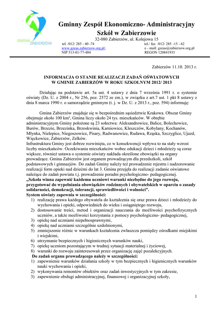 Gminny Zespół Ekonomiczno- Administracyjny Szkół w Zabierzowie 32-080 Zabierzów, ul. Kolejowa 15 tel. /012/ 285 - 40 -74 www.gzeas.zabierzow.org.pl; NIP 513-01-77-484 tel./ fax /012/ 285 -15 - 62 e - mail: [email protected] REGON 120841933 Zabierzów 11.10. 2013 r. INFORMACJA O STANIE REALIZACJI ZADAŃ OŚWIATOWYCH W GMINIE ZABIERZÓW W ROKU SZKOLNYM 2012/ 2013 Działając na podstawie art. 5a ust. 4 ustawy z dnia 7 września 1991 r. o systemie oświaty (Dz. U. z 2004 r., Nr 256, poz. 2572 ze zm.), w związku z art.7 ust. 1 pkt 8 ustawy z dnia 8 marca 1990 r. o samorządzie gminnym (t. j. w Dz. U. z 2013 r., poz. 594) informuję: Gmina Zabierzów znajduje się w bezpośrednim sąsiedztwie Krakowa. Obszar Gminy obejmuje około 100 km², Gmina liczy około 24 tys. mieszkańców. W obrębie administracyjnym Gminy położone są 23 sołectwa: Aleksandrowice, Balice, Bolechowice, Burów, Brzezie, Brzezinka, Brzoskwinia, Karniowice, Kleszczów, Kobylany, Kochanów, Młynka, Nielepice, Niegoszowice, Pisary, Radwanowice, Rudawa, Rząska, Szczyglice, Ujazd, Więckowice, Zabierzów, Zelków. Infrastruktura Gminy jest dobrze rozwinięta, co w konsekwencji wpływa to na stały wzrost liczby mieszkańców. Oczekiwania mieszkańców wobec edukacji dzieci i młodzieży są coraz większe, również ustawa o systemie oświaty nakłada określone obowiązki na organy prowadzące. Gmina Zabierzów jest organem prowadzącym dla przedszkoli, szkół podstawowych i gimnazjów. Do zadań Gminy należy też prowadzenie rejestru i nadzorowanie realizacji form opieki nad dziećmi do lat 3. Gmina przejęła do realizacji zadanie oświatowe należące do zadań powiatu t.j. prowadzenie poradni psychologiczno- pedagogicznej. „Szkoła winna zapewnić każdemu uczniowi warunki niezbędne do jego rozwoju, przygotować do wypełniania obowiązków rodzinnych i obywatelskich w oparciu o zasady solidarności, demokracji, tolerancji, sprawiedliwości i wolności”. System oświaty zapewnia w szczególności: 1) realizację prawa każdego obywatela do kształcenia się oraz prawa dzieci i młodzieży do wychowania i opieki, odpowiednich do wieku i osiągniętego rozwoju, 2) dostosowanie treści, metod i organizacji nauczania do możliwości psychofizycznych uczniów, a także możliwości korzystania z pomocy psychologiczno- pedagogicznej, 3) opiekę nad uczniami niepełnosprawnymi, 4) opiekę nad uczniami szczególnie uzdolnionymi, 5) zmniejszenie różnic w warunkach kształcenia zwłaszcza pomiędzy ośrodkami miejskimi i wiejskimi, 6) utrzymanie bezpiecznych i higienicznych warunków nauki, 7) opiekę uczniom pozostającym w trudnej sytuacji materialnej i życiowej, 8) warunki do rozwoju zainteresowań przez organizację zajęć pozalekcyjnych. Do zadań organu prowadzącego należy w szczególności: 1) zapewnienie warunków działania szkoły w tym bezpiecznych i higienicznych warunków nauki wychowania i opieki, 2) wykonywania remontów obiektów oraz zadań inwestycyjnych w tym zakresie, 3) zapewnienie obsługi administracyjnej, finansowej i organizacyjnej szkoły, 1 4) wyposażenie szkoły w pomoce dydaktyczne i sprzęt niezbędny do pełnej realizacji programów nauczania, programów wychowawczych, przeprowadzania sprawdzianów i egzaminów oraz wykonywania innych zadań statutowych. Są to zadania ustawowe zapisane w ustawie z dnia 7 września 1991 r. o systemie oświaty (Dz.U. z 2004 r. Nr 256, poz. 2572 ze zm.). SPIS TREŚCI 1. 2. 3. 4. 5. 6. 7. 8. 9. 10. 11. 12. 13. 14. 15. 16. 17. 18. STR Demografia Nakłady na edukację Opieka nad dziećmi do lat 3 Edukacja przedszkolna Obwody szkolne i liczba uczniów szkół podstawowych i gimnazjów Kierunki polityki oświatowej Wyniki sprawdzianów i egzaminów Wyniki rywalizacji sportowej szkół Laureaci i finaliści konkursów i zawodów Programy zewnętrzne realizowane w szkołach Szkolne doradztwo zawodowe i wybór szkoły ponagimnazjalnej Opieka psychologiczno- pedagogiczna, świetlice i biblioteki Dowóz uczniów do szkół Stypendia i programy pomocowe Pracownicy oświaty Zarządzanie szkołami Gminny Zespół Ekonomiczno- Administracyjny Szkół w Zabierzowie Podsumowanie 2 3 5 5 9 11 12 18 19 20 21 22 23 23 24 26 28 29 Liczba dzieci i uczniów w niniejszym opracowaniu, podawana jest wg Systemu Informacji Oświatowej (SIO) na dzień 31 marca 2013 roku. Liczba dzieci (wg roku urodzenia) zameldowanych w gminie Zabierzów Razem rok wg urodzenia liczba dzieci etap szkolny etapu klasa 1998 267 gimnazjum 755 III 1999 249 gimnazjum II 2000 239 gimnazjum I 2001 250 szkoła podstawowa 1473 VI 2002 254 szkoła podstawowa V 2003 225 szkoła podstawowa IV 2004 209 szkoła podstawowa III 2005 280 szkoła podstawowa II 2006 255 szkoła podstawowa I 2007 261 przedszkole/szkoła 1098 0 2008 280 przedszkole 0 2009 288 przedszkole 0 2010 269 przedszkole 0 2011 234 żłobek 462 0 2012 228 żłobek 0 0 Razem 3788 0 3788 Od roku 2009 liczba urodzeń dzieci w naszej Gminie spada, ale jest to później wyrównywane przez migrację rodzin z dziećmi do naszej Gminy. 2 Gm ina Zabierzów dzieci zam eldow ane na terenie Gm iny w g roku urodzenia 300 262 251 liczba dzieci 250 200 253 234 247 221 210 276 254 257 277 282 277 241 228 150 100 50 19 98 19 99 20 00 20 01 20 02 20 03 20 04 20 05 20 06 20 07 20 08 20 09 20 10 20 11 20 12 0 rok urodzenia Subwencja oświatowa dla Gminy Zabierzów w latach 2005 - 2013 L.P. Lata 1. 2. 3. 4. 5. 6. 7. 8. 9. Wg naliczenia MF „metryczki” w zł 2005 2006 2007 2008 2009 2010 2011 2012 2013 Wykonanie w zł 9 737 107,10 426 762,11 185 850,12 471 998,13 534 447,15 022 605,16 607 457,18 282 069,Plan 19 826 496,- Subwencja na 1 ucznia w zł wg metryczki MEN 9 743 175,10 426 762,11 185 850,12 506 835,13 534 447,15 022 605,16 607 457,18 282 069,- 567,38 611,62 641,03 671,72 Subwencja dla naszej Gminy wzrasta z uwagi na wzrost liczby dzieci w szkołach oraz na wzrost liczby nauczycieli z wyższym stopniem awansu zawodowego. W subwencji wskaźnikiem MEN