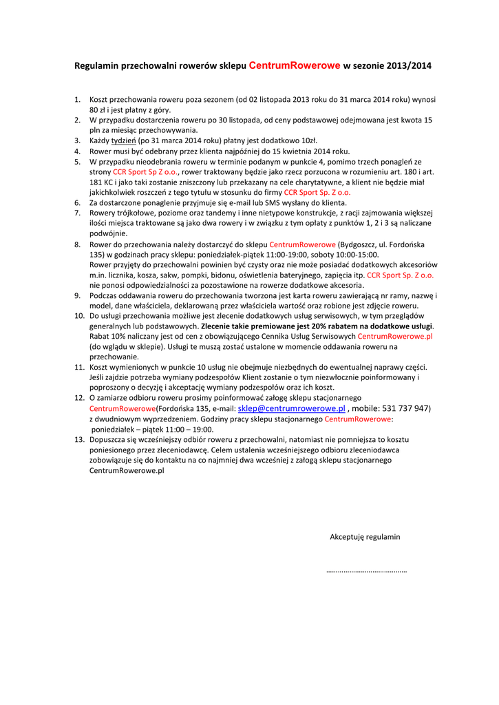Regulamin przechowalni rowerów sklepu CentrumRowerowe w sezonie 2013/2014 1. 2. 3. 4. 5. 6. 7. 8. 9. 10. 11. 12. 13. Koszt przechowania roweru poza sezonem (od 02 listopada 2013 roku do 31 marca 2014 roku) wynosi 80 zł i jest płatny z góry. W przypadku dostarczenia roweru po 30 listopada, od ceny podstawowej odejmowana jest kwota 15 pln za miesiąc przechowywania. Każdy tydzień (po 31 marca 2014 roku) płatny jest dodatkowo 10zł. Rower musi być odebrany przez klienta najpóźniej do 15 kwietnia 2014 roku. W przypadku nieodebrania roweru w terminie podanym w punkcie 4, pomimo trzech ponagleń ze strony CCR Sport Sp Z o.o., rower traktowany będzie jako rzecz porzucona w rozumieniu art. 180 i art. 181 KC i jako taki zostanie zniszczony lub przekazany na cele charytatywne, a klient nie będzie miał jakichkolwiek roszczeń z tego tytułu w stosunku do firmy CCR Sport Sp. Z o.o. Za dostarczone ponaglenie przyjmuje się e-mail lub SMS wysłany do klienta. Rowery trójkołowe, poziome oraz tandemy i inne nietypowe konstrukcje, z racji zajmowania większej ilości miejsca traktowane są jako dwa rowery i w związku z tym opłaty z punktów 1, 2 i 3 są naliczane podwójnie. Rower do przechowania należy dostarczyć do sklepu CentrumRowerowe (Bydgoszcz, ul. Fordońska 135) w godzinach pracy sklepu: poniedziałek-piątek 11:00-19:00, soboty 10:00-15:00. Rower przyjęty do przechowalni powinien być czysty oraz nie może posiadać dodatkowych akcesoriów m.in. licznika, kosza, sakw, pompki, bidonu, oświetlenia bateryjnego, zapięcia itp. CCR Sport Sp. Z o.o. nie ponosi odpowiedzialności za pozostawione na rowerze dodatkowe akcesoria. Podczas oddawania roweru do przechowania tworzona jest karta roweru zawierającą nr ramy, nazwę i model, dane właściciela, deklarowaną przez właściciela wartość oraz robione jest zdjęcie roweru. Do usługi przechowania możliwe jest zlecenie dodatkowych usług serwisowych, w tym przeglądów generalnych lub podstawowych. Zlecenie takie premiowane jest 20% rabatem na dodatkowe usługi. Rabat 10% naliczany jest od cen z obowiązującego Cennika Usług Serwisowych CentrumRowerowe.pl (do wglądu w sklepie). Usługi te muszą zostać ustalone w momencie oddawania roweru na przechowanie. Koszt wymienionych w punkcie 10 usług nie obejmuje niezbędnych do ewentualnej naprawy części. Jeśli zajdzie potrzeba wymiany podzespołów Klient zostanie o tym niezwłocznie poinformowany i poproszony o decyzję i akceptację wymiany podzespołów oraz ich koszt. O zamiarze odbioru roweru prosimy poinformować załogę sklepu stacjonarnego CentrumRowerowe(Fordońska 135, e-mail: [email protected] , mobile: 531 737 947) z dwudniowym wyprzedzeniem. Godziny pracy sklepu stacjonarnego CentrumRowerowe: poniedziałek – piątek 11:00 – 19:00. Dopuszcza się wcześniejszy odbiór roweru z przechowalni, natomiast nie pomniejsza to kosztu poniesionego przez zleceniodawcę. Celem ustalenia wcześniejszego odbioru zleceniodawca zobowiązuje się do kontaktu na co najmniej dwa wcześniej z załogą sklepu stacjonarnego CentrumRowerowe.pl Akceptuję regulamin ……………………………………